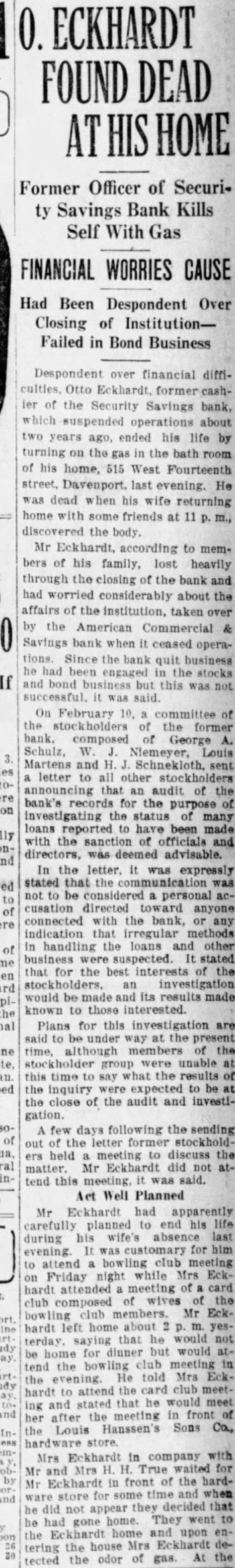 ECKHARDT FOUND Former Officer of Security Savings Bank Kills Self With Gas FINANCIAL WORRIES CAUSE Had Been Despondent Over Closing of InstitutionFailed in Bond Business Despondent over financial diffithe Security Savings bank, suspended operations about years ago, ended his life turning the gas the bath room of his home, 515 West Fourteenth street, Davenport, last evening. He was dead his wife returning home some friends at discovered the body. Mr Eckhardt, according to members of his family, lost heavily through the closing of the bank and had worried considerably about the affairs of the institution, taken over by the American Commercial Savings bank when it ceased operations. Since bank quit business he been engaged the stocks and bond business but this was not successful. it said. On February committee of the of the former bank. composed George Schulz, Niemeyer, Louis Martens and Schnekloth, letter all other announcing that an audit of the bank's records for the purpose of investigating the status many loans reported have been made with the sanction of officials directors, deemed advisable. In the letter, was expressly stated that the communication not be considered a personal cusation directed toward anyone connected with the bank, indication that irregular methods handling the loans and other business suspected. stated that for the best interests the investigation would be made its results made known to those interested. Plans for this investigation are said to under way the time, although members of the stockholder group were unable this time say what the results the inquiry expected to be the close of the audit and investigation. A few days following the sending out of the letter former held meeting to discuss the matter. Mr Eckhardt did not attend this meeting, it said. Act Well Planned Mr Eckhardt had apparently carefully planned to end his his wife's absence last during customary for attend bowling club meeting Friday night while Mrs hardt attended meeting of card wives the club composed club members. Mr Eckhardt left home about that he would not terday. dinner but would home for the club meeting tend He told Mrs Eckevening. attend the card club hardt to stated that he would meet and the front her after Hanssen's Sons Co., Louis hardware store. Mrs in company Mrs True waited for Mr in front the hardEckhardt some time and when they decided that did not appear home. They went he gone Eckhardt home and upon house Mrs Eckhardt tering the odor of gas the tected the