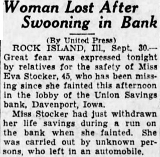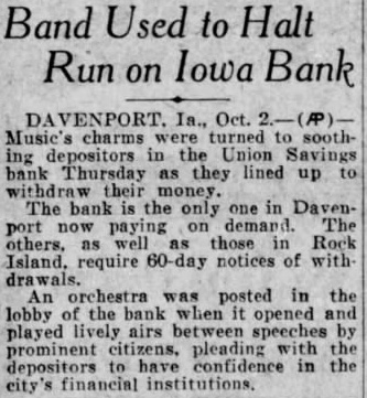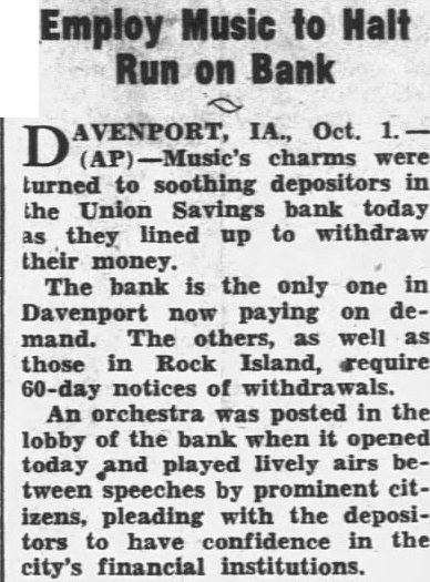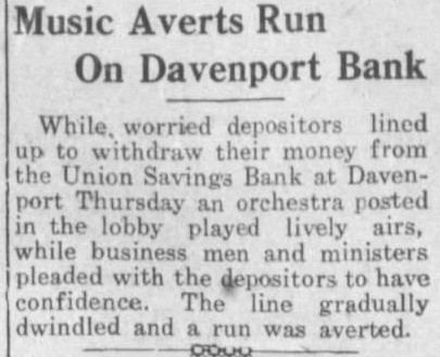 ORCHESTRA PLAYS TO PUT END TO RUN ON BANK Davenport, orchestra and line of depositors the of run on the Union Savings bank here. The orchestra furnished music as the depositors waited to withdraw their funds following the posting of 60-day withdrawal notice. Reassured by churchmen and men, the crowd was said to have decreased. In the other two of the tri-cities. banking affairs quiet. Rock Island, merchants announced they would accept savings checks pay. ment for merchandise. In Moline, Deere Co., announced it would back the Peoples Trust and Savings bank.