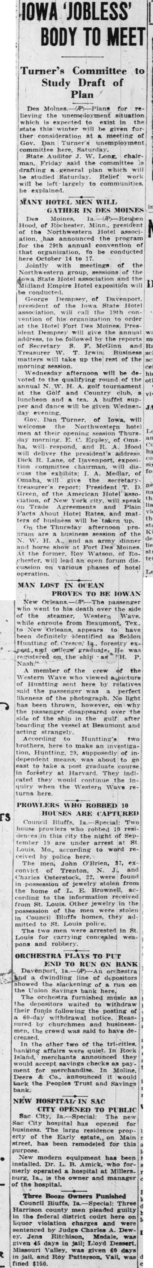 Des Moines, Hood, of Rochester. Minn., president of the Northwestern Hotel association, has announced the program the 29th annual convention of that organization, to be conducted here October to Jointly with meetings of the group, sessions of the State Hotel association and the Midland Empire Hotel exposition will be conducted. George Dempsey, of Davenport. president of the Iowa State Hotel will call the 19th convention of his organization to order the Hotel Fort Des Moines. President Dempsey will give the annual address, to followed reports of Secretary S. and Treasurer Business matters take up the rest of the morning session. Wednesday afternoon will be devoted the qualifying round of the annual H. golf tournament the Golf and Country club, luncheon and tea. buffet supper and dance will be given Wednesday evening. Gov. Dan of Iowa, will welcome the Northwestern hotel men at their Thursday morning. Eppley, of Omawill and R. Hood deliver the president's address Dick Lane, of Davenport, exposition chairman, disthe exhibits: Medlar, of Omaha, will give the secretary report: President D. Green, of the Hotel association. of New York will speak Trade and Plain Facts About Hotel Rates, and matters of business will be taken up, On the Thursday afternoon probusiness session of the an army dinner and horse show Fort Des Moines. At the former, Roy Watson. of Roter chester. will lead an open forum discussion on various phases of hotel operation.