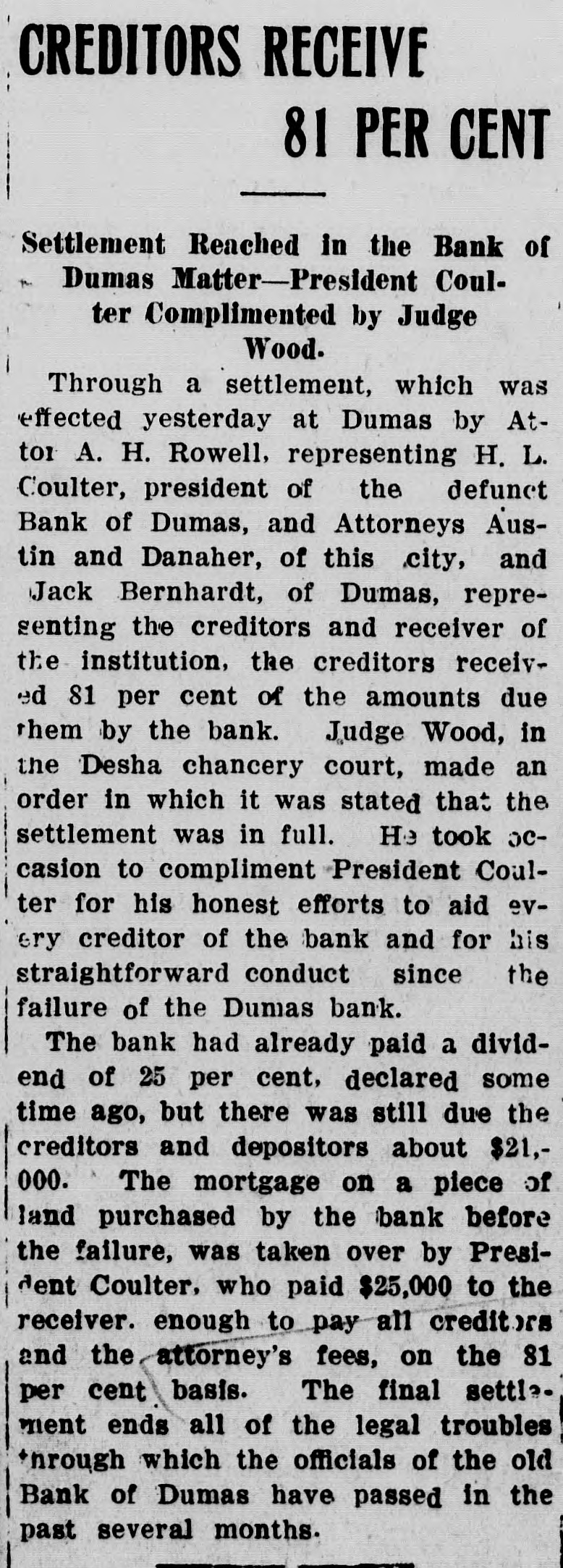 CREDITORS RECEIVE 81 PER CENT Settlement Reached in the Bank of Dumas Matter-President Coulter Complimented by Judge Wood. Through a settlement, which was effected yesterday at Dumas by Attor A. H. Rowell, representing H. L. Coulter, president of the defunct Bank of Dumas, and Attorneys Austin and Danaher, of this city, and Jack Bernhardt, of Dumas, representing the creditors and receiver of the institution, the creditors received 81 per cent of the amounts due them by the bank. Judge Wood, in the Desha chancery court, made an order in which it was stated that the settlement was in full. He took occasion to compliment President Coulter for his honest efforts to aid every creditor of the bank and for his straightforward conduct since the failure of the Dumas bank. The bank had already paid a dividend of 25 per cent, declared some time ago, but there was still due the creditors and depositors about $21,000. The mortgage on a piece of land purchased by the bank before the failure, was taken over by President Coulter, who paid $25,000 to the receiver. enough to pay all creditors and the attorney's fees, on the 81 cent basis. The final settl? per ment ends all of the legal troubles +nrough which the officials of the old Bank of Dumas have passed in the past several months.