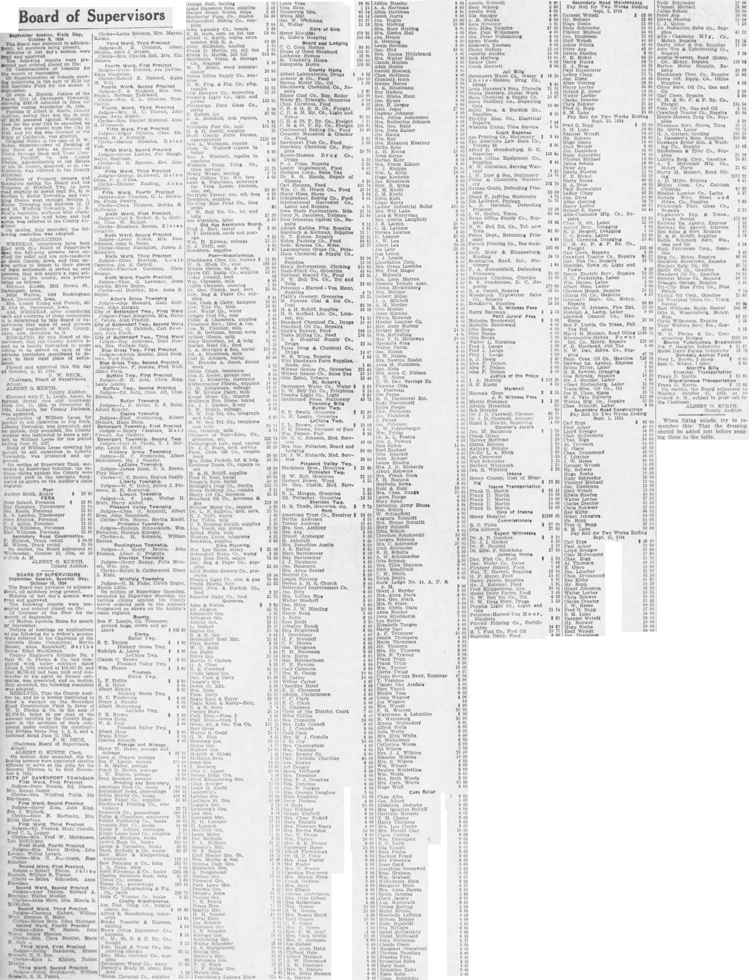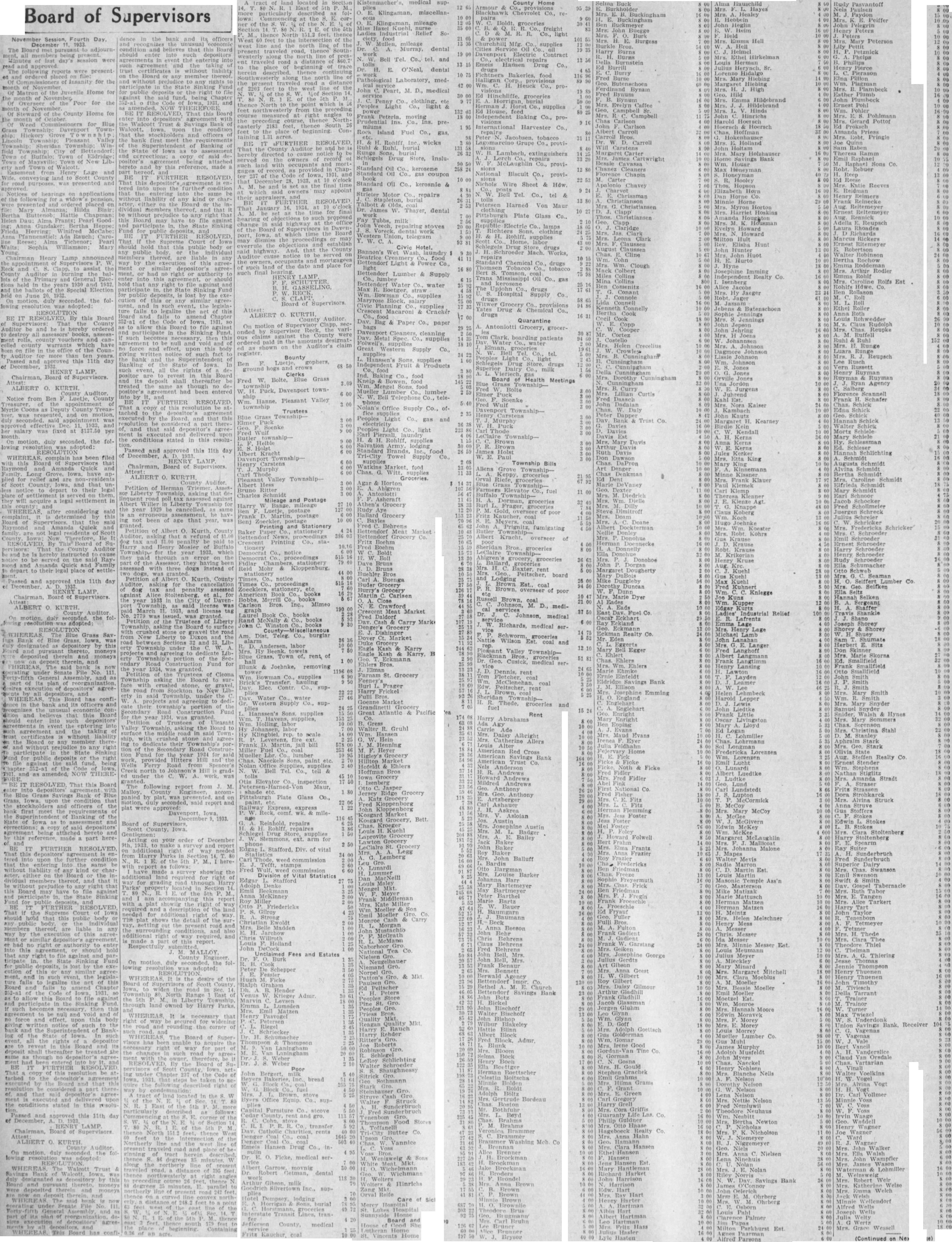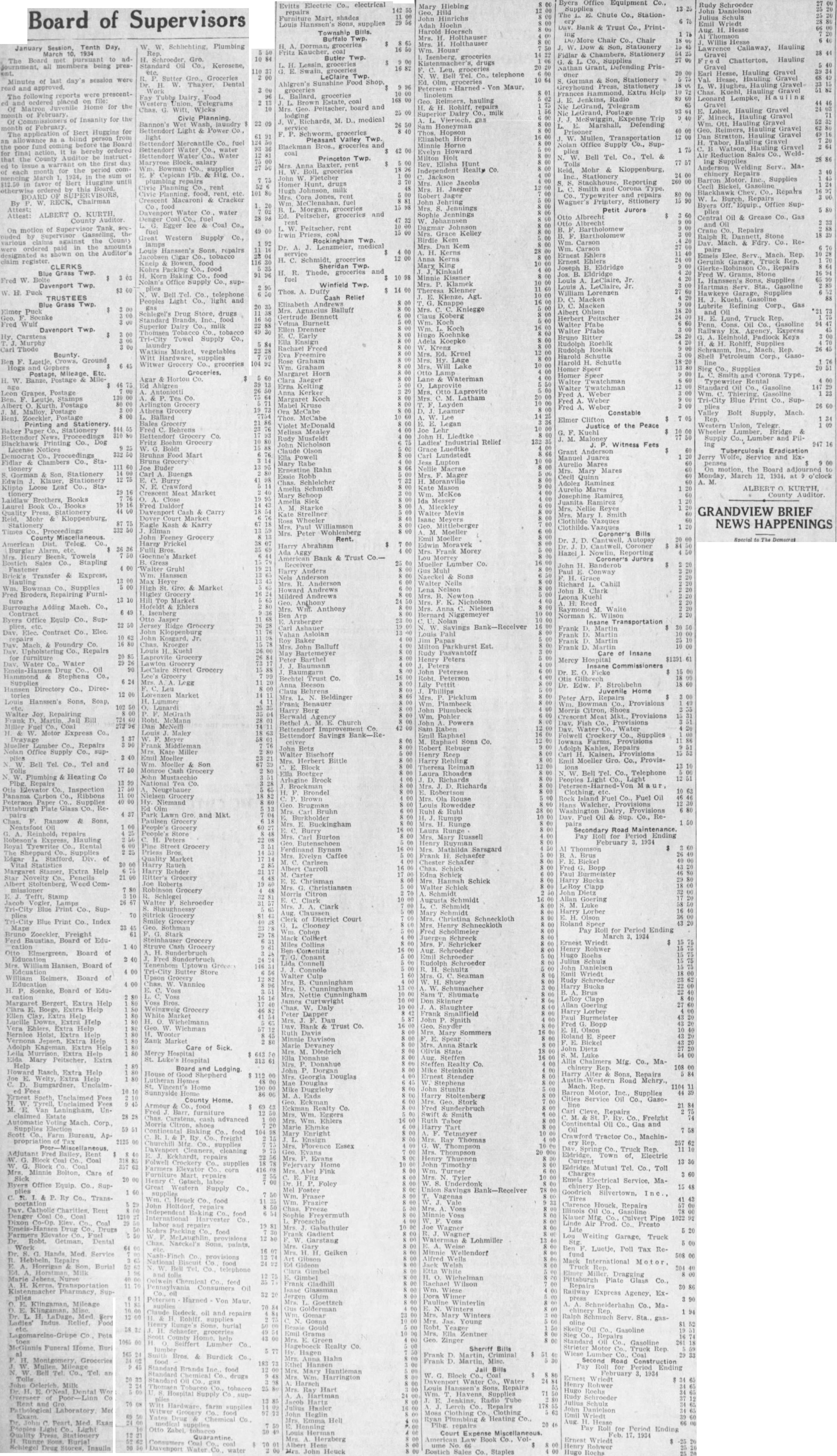 County Home Abbott Drugs Armour Food Barron Blackhawk Co., ReBlazer pairs Coal Co., Rep. Boiler Brady St. Groceries Co., Freight Ry. Co., Light and Freight Freight Baking Food Crescent Macaroni & Cracker Co., Davenport Fish Co., Food Dearborn Chemical Co., Supplies Hansen Co., Drugs Repairs Food Halligan Dr G. Hands, Repair of Glasses Carl Feed Heuck Co., Food Harry Shoes Independent Baking Co., Food Harvester Co., Labor Repairs Mds. Peter N. Johnston Optical Co., ReAdolph pairs Kahles, Plbg. Repairs Supplies Kehoe, Repairs Kohrs Packing Co., Food Krause Co., Mdse. Chemical & Supply Co., Supplies Men's Clothing Food Tel. Co., Tel and Petersen Harned Von Maur, Supplies Coal & Ice Co., Supplies Seiffert Co., LumStandard Chemical Co., Drugs Oil Repairs Stark's Food Milling Feed Hospital Supply Co., Drug & Chemical Co., Wing. Repairs Farm Supplies, Witwer Grocer Groceries Grocer Sales Tax Otto Zabel, Tobacco Robert's Davenport Water W. Bell Telephone Peoples Light Co., Light Greyhound Press, Stationery Township Bills Butler Groceries Brown, Brown, Overseer of Poor Dr C. Johnson, Med. ServMrs. Geo. Peitscher, Board and Dr. W. Richards, Med. Services