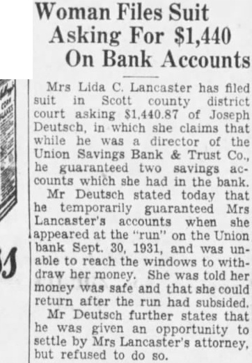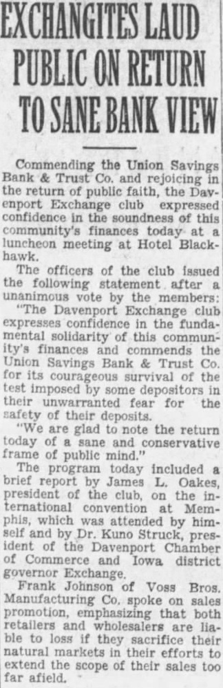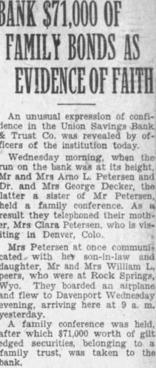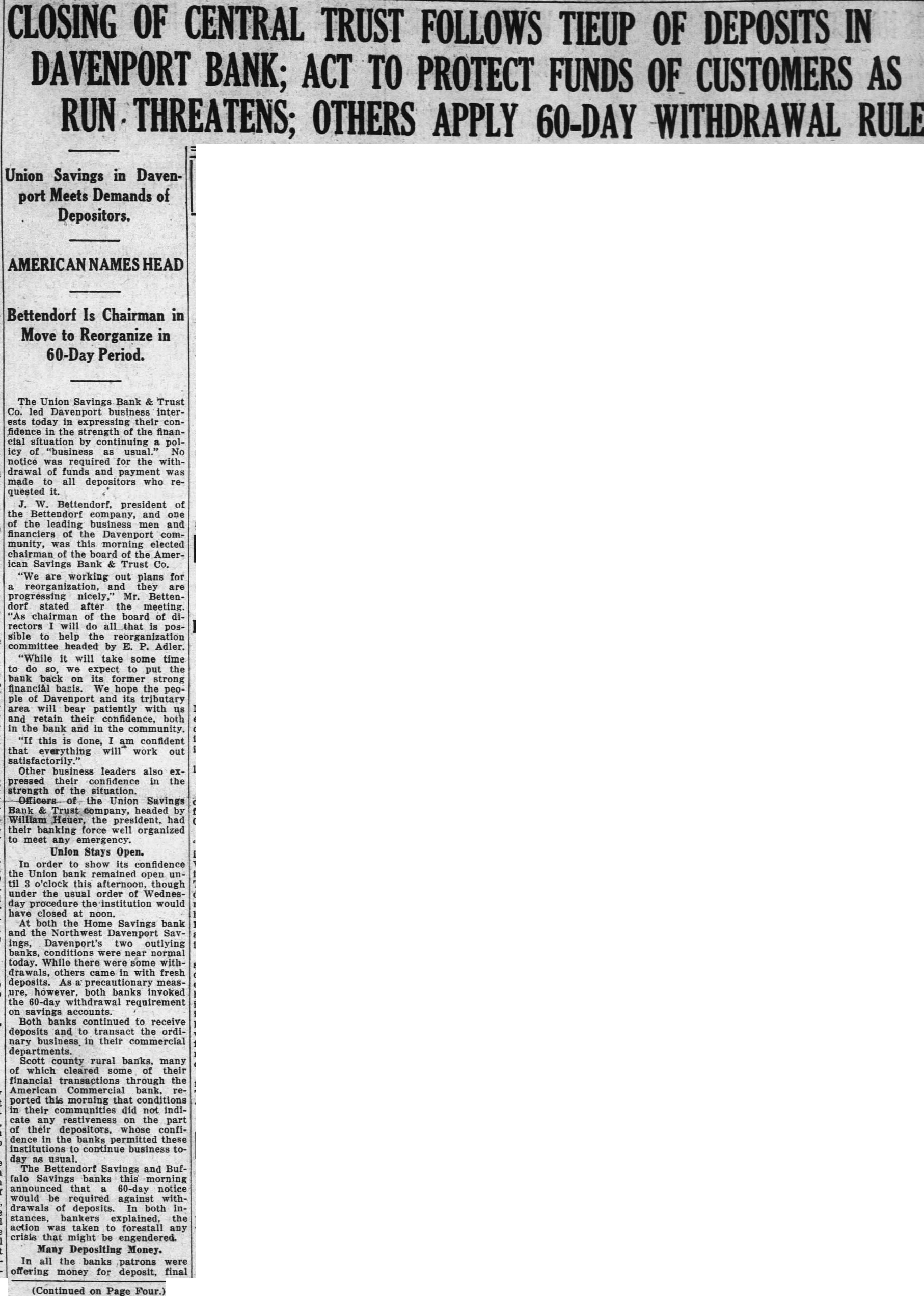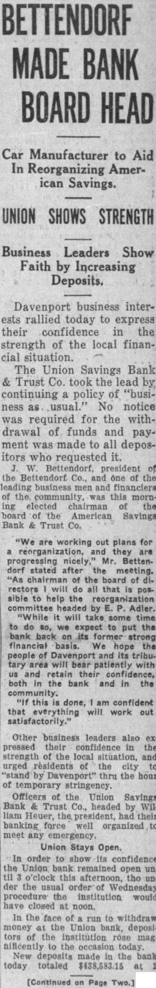 BETTENDORF MADE BANK BOARD HEAD Car Manufacturer to Aid In Reorganizing American Savings. UNION SHOWS STRENGTH Business Leaders Show Faith by Increasing Deposits. Davenport business interests rallied today to express their confidence in the strength of the local financial situation. The Union Savings Bank & Trust Co. took the lead by continuing a policy of "business as usual." No notice was required for the withdrawal of funds and payment was made to all depositors who requested it. J. W. Bettendorf, president of the Bettendorf Co., and one of the leading business men and financiers of the community, was this morning elected chairman of the board of the American Savings Bank & Trust Co. "We are working out plans for reorganization, and they are progressing nicely, Mr. Bettendorf stated after the meeting. "As chairman of the board of directors will do all that is pos. sible to help the committee headed by E. P. Adler. "While it will take some time to do so, we expect to put the bank back on its former strong financial basis. We hope the people of Davenport and its tributary area will bear patiently with us and retain their confidence, both in the bank and in the community. "If this is done, am confident that everything will work out satisfactorily." Other business leaders also expressed their confidence in the strength of the local situation, and urged rèsidents of the city to "stand by Davenport" thru the hour of temporary stringency. Officers of the Union Savings Bank & Trust Co., headed by William Heuer, the president, had their banking force well organized to meet any emergency. Union Stays Open. In order to show its confidence the Union bank remained open until o'clock this afternoon, the under the usual order of Wednesday procedure the institution would have closed at noon. In the face of run to withdraw money at the Union bank, depositors of the institution rose magnificently to the occasion today. New deposits made in the bank today totaled $438,583.15 at [Continued on Page Two.]
