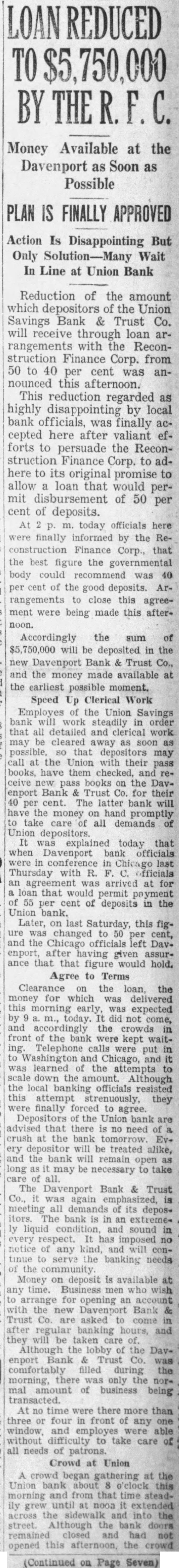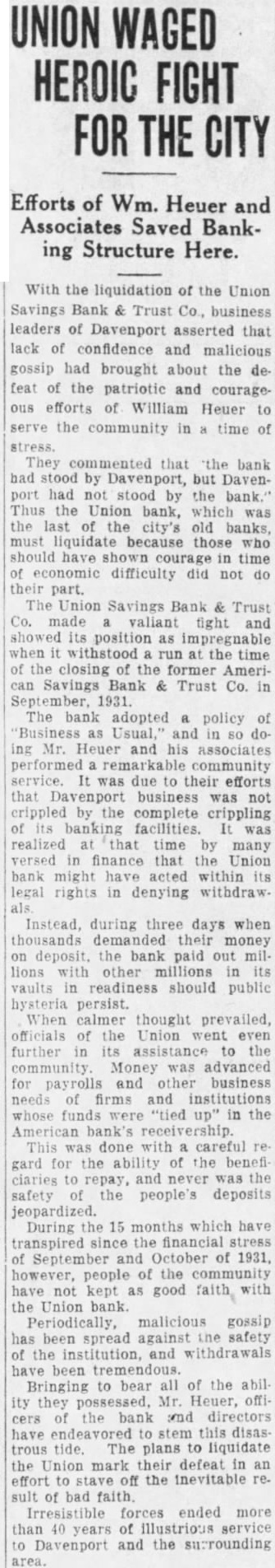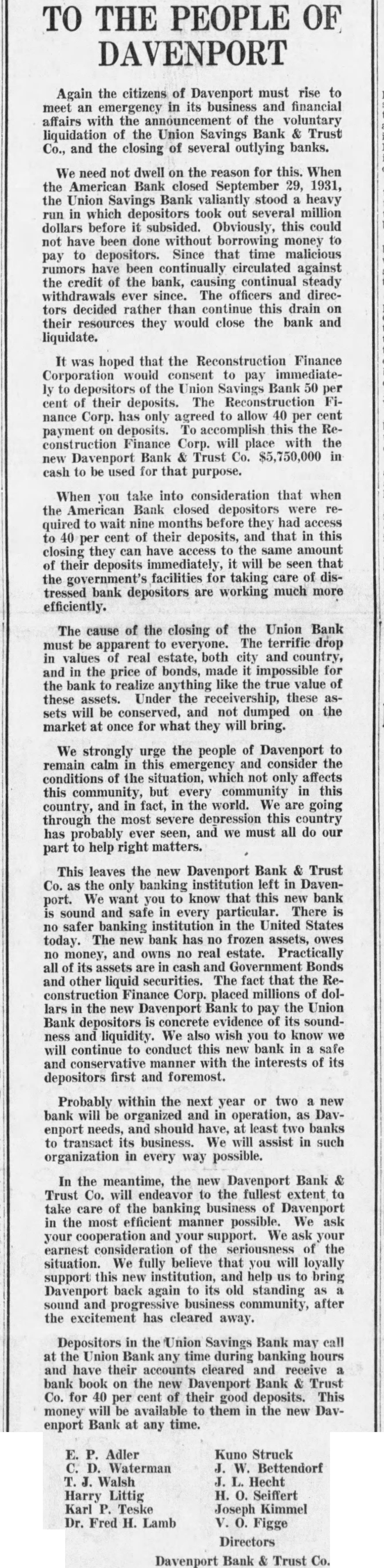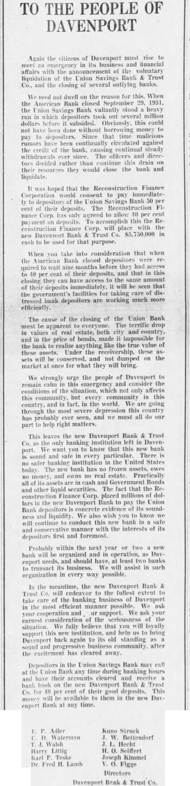 TO THE PEOPLE OF DAVENPORT Again the citizens of Davenport must rise to meet an emergency in its business and financial affairs with the announcement of the voluntary liquidation of the Union Savings Bank & Trust Co., and the closing of several outlying banks. We need not dwell on the reason for this. When the American Bank closed September 29, 1931, the Union Savings Bank valiantly stood a heavy run in which depositors took out several million dollars before it subsided. Obviously, this could not have been done without borrowing money to pay to depositors. Since that time malicious rumors have been continually circulated against the credit of the bank, causing continual steady withdrawals ever since. The officers and directors decided rather than continue this drain on their resources they would close the bank and liquidate. It was hoped that the Reconstruction Finance Corporation would consent to pay immediately to depositors of the Union Savings Bank 50 per cent of their deposits. The Reconstruction Finance Corp. has only agreed to allow 40 per cent payment on deposits. To accomplish this the Reconstruction Finance Corp. will place with the new Davenport Bank & Trust Co. $5,750,000 in cash to be used for that purpose. When you take into consideration that when the American Bank closed depositors were required to wait nine months before they had access to 40 per cent of their deposits, and that in this closing they can have access to the same amount of their deposits immediately, it will be seen that the government's facilities for taking care of distressed bank depositors are working much more efficiently. The cause of the closing of the Union Bank must be apparent to everyone. The terrific drop in values of real estate, both city and country, and in the price of bonds, made it impossible for the bank to realize anything like the true value of these assets. Under the receivership, these assets will be conserved, and not dumped on the market at once for what they will bring. We strongly urge the people of Davenport to remain calm in this emergency and consider the conditions of the situation, which not only affects this community, but every community in this country, and in fact, in the world. We are going through the most severe depression this country has probably ever seen, and we must all do our part to help right matters. This leaves the new Davenport Bank & Trust Co. as the only banking institution left in Davenport. We want you to know that this new bank sound and safe in every particular. There is no safer banking institution in the United States today. The new bank has no frozen assets, owes no money, and owns no real estate. Practically all of its assets are in cash and Government Bonds and other liquid securities. The fact that the Reconstruction Finance Corp. placed millions of dollars in the new Davenport Bank to pay the Union Bank depositors is concrete evidence of its soundness and liquidity. We also wish you to know we will continue to conduct this new bank in a safe and conservative manner with the interests of its depositors first and foremost. Probably within the next year or two a new bank will be organized and in operation, as Dayenport needs, and should have, at least two banks to transact its business. We will assist in such organization in every way possible. In the meantime, the new Davenport Bank & Trust Co. will endeavor to the fullest extent to take care of the banking business of Davenport in the most efficient manner possible. We ask your cooperation and ur support. We ask your earnest consideration of the seriousness of the situation. We fully believe that you will loyally support this new institution. and help us to bring Davenport back again to its old standing as a sound and progressive business community, after the excitement has cleared away. Depositors in the Union Savings Bank may call at the Union Bank any time during banking hours and have their accounts cleared and receive a bank book on the new Davenport Bank & Trust Co. for 40 per cent of their good deposits. This money will be available to them in the new Dayenport Bank at any time. E. P. Adler C. D. Waterman T.J. Walsh Harry Littig Karl P. Teske Dr. Fred H. Lamb Kuno Struck J. W. Bettendorf J. L. Hecht H. O. Seiffert Joseph Kimmel V. O. Figge Directors Davenport Bank & Trust Co.
