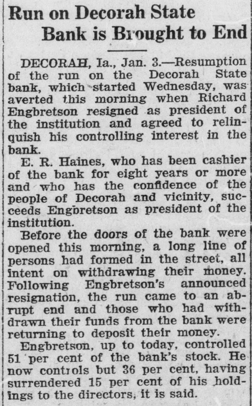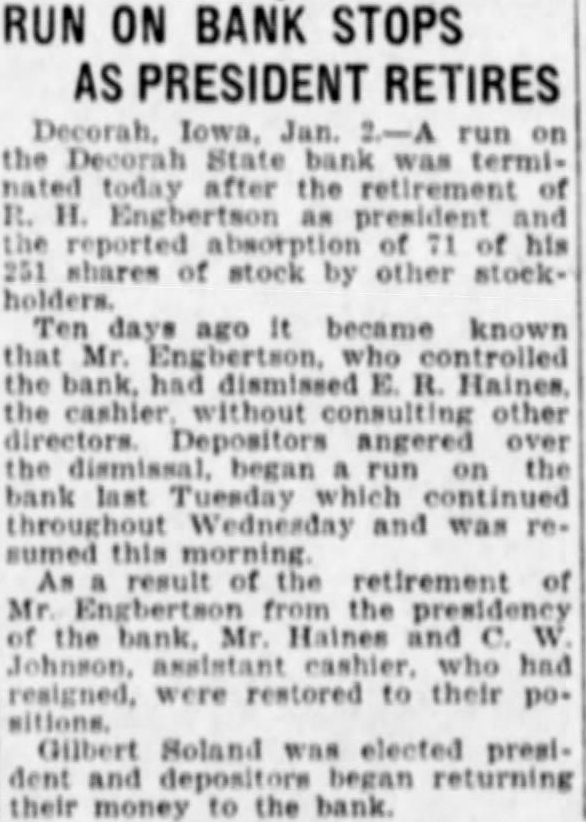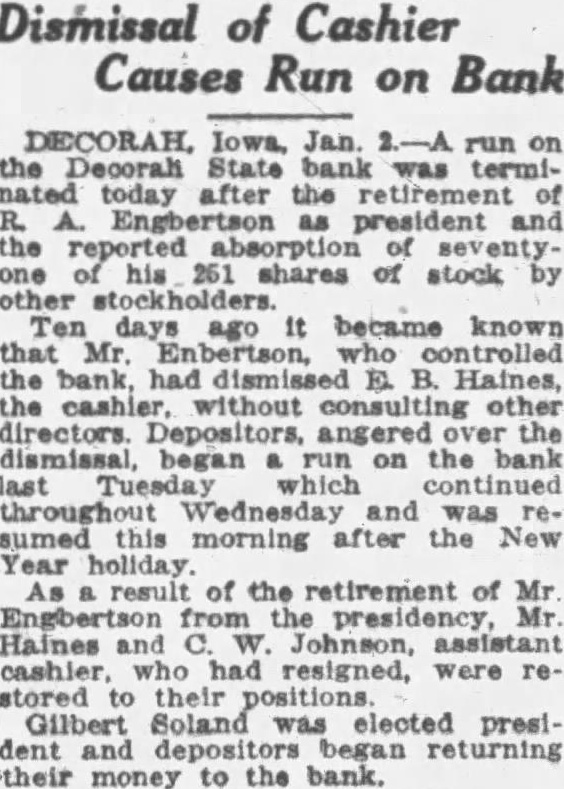 Dismissal of Cashier Causes Run on Bank DECORAH, Iowa, Jan. run on the Decorah State bank was terminated today after the retirement of A. Engbertson as president and the reported absorption of his 261 shares of stock by other stockholders. Ten days it became known that Mr. Enbertson, ago who controlled the bank, had dismissed B. Haines, the without consulting other Depositors, angered over the began on the last Tuesday throughout Wednesday and sumed this morning after the New Year As of the retirement of Mr from the presidency, Mr Haines and Johnson, assistant cashier who had resigned, were restored to their positions. Gilbert Soland was elected president and depositors began returning -their money to the bank.