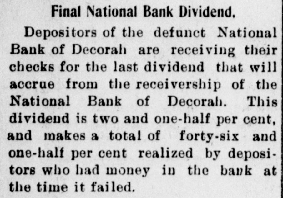 Final National Bank Dividend, Depositors of the defunct National Bank of Decorah are receiving their checks for the last dividend that will accrue from the receivership of the National Bank of Decorah. This dividend is two and one-half per cent, and makes a total of forty-six and one-half per cent realized by depositors who had money in the bank at the time it failed.
