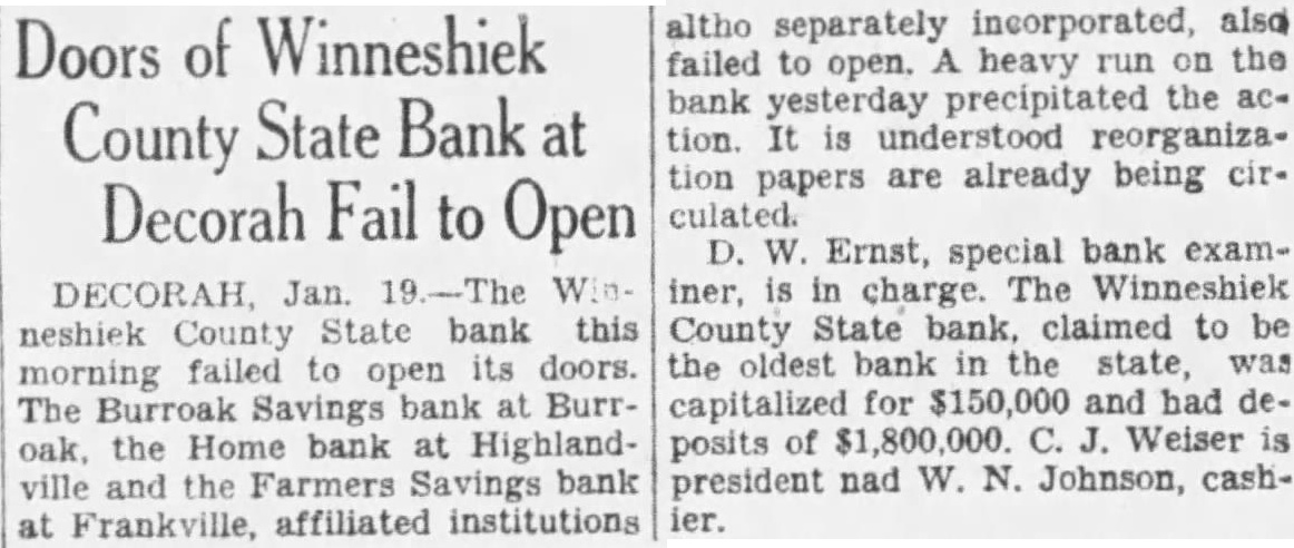 Doors of Winneshiek County State Bank at Decorah Fail to Open DECORAH, Jan. 19.-The Winneshiek County State bank this morning failed to open its doors. The Burroak Savings bank at Burroak, the Home bank at Highlandville and the Farmers Savings bank at Frankville, affiliated institutions altho separately incorporated, also failed to open. A heavy run on the bank yesterday precipitated the action. It is understood reorganization papers are already being circulated. D. W. Ernst, special bank examiner, is in charge. The Winneshiek County State bank. claimed to be the oldest bank in the state, was capitalized for $150,000 and had deposits of $1,800,000. C. J. Weiser is president nad W. N. Johnson, cashier.