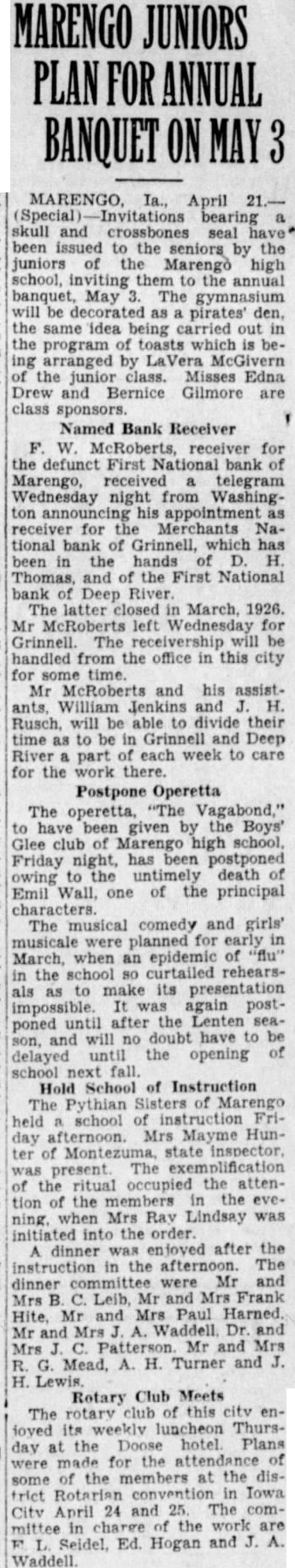MARENGO, April bearing skull and crossbones seal been issued to the seniors by the juniors Marengo high school, inviting them to the annual banquet, May The gymnasium will be decorated pirates' den, the same idea being carried the program toasts which arranged by LaVera McGivern the junior class. Misses Edna Drew Bernice Gilmore are class sponsors. Named Bank Receiver W. receiver for the defunct First bank Marengo, received telegram Wednesday night from Washington appointment receiver for the Merchants tional bank of Grinnell, which been hands of Thomas, and of the First National bank Deep River. The latter closed March, 1926. Mr McRoberts left Wednesday for Grinnell. The receivership handled from the office in this city for some time. Mr McRoberts and his assistants, William Jenkins and Rusch, will be able to divide their time to be Grinnell and Deep River part each week to care for the work there. Postpone Operetta The operetta, Vagabond," been given by the Boys' Glee club of high school, Friday night, has been to death owing Emil Wall, one of the principal characters. The musical comedy and girls' musicale were planned for early in March, when epidemic of an school curtailed rehearsthe als make its presentation again postponed until after the Lenten seawill doubt have be son, and no the opening of delayed until school next fall. Hold School of Instruction The Pythian Sisters Marengo held school instruction Friday afternoon. Mrs Mayme Hunter Montezuma, state inspector, present. The of ritual occupied attention of the ning, when Mrs Ray Lindsay was into the order. dinner enjoyed after the in the afternoon. dinner were Mr Leib, Mr and Mrs Frank Hite, Mr and Mrs Paul Harned. Mr and Mrs Waddell and Mr and Mrs Mead, H. Turner and Rotary Club Meets The rotary of this city loved its weekly luncheon Thursthe Doose Plans day at made for attendance the members at the dissome of trict Rotarian convention Iowa 24 and 25. The April charge the work Ed. Hogan and