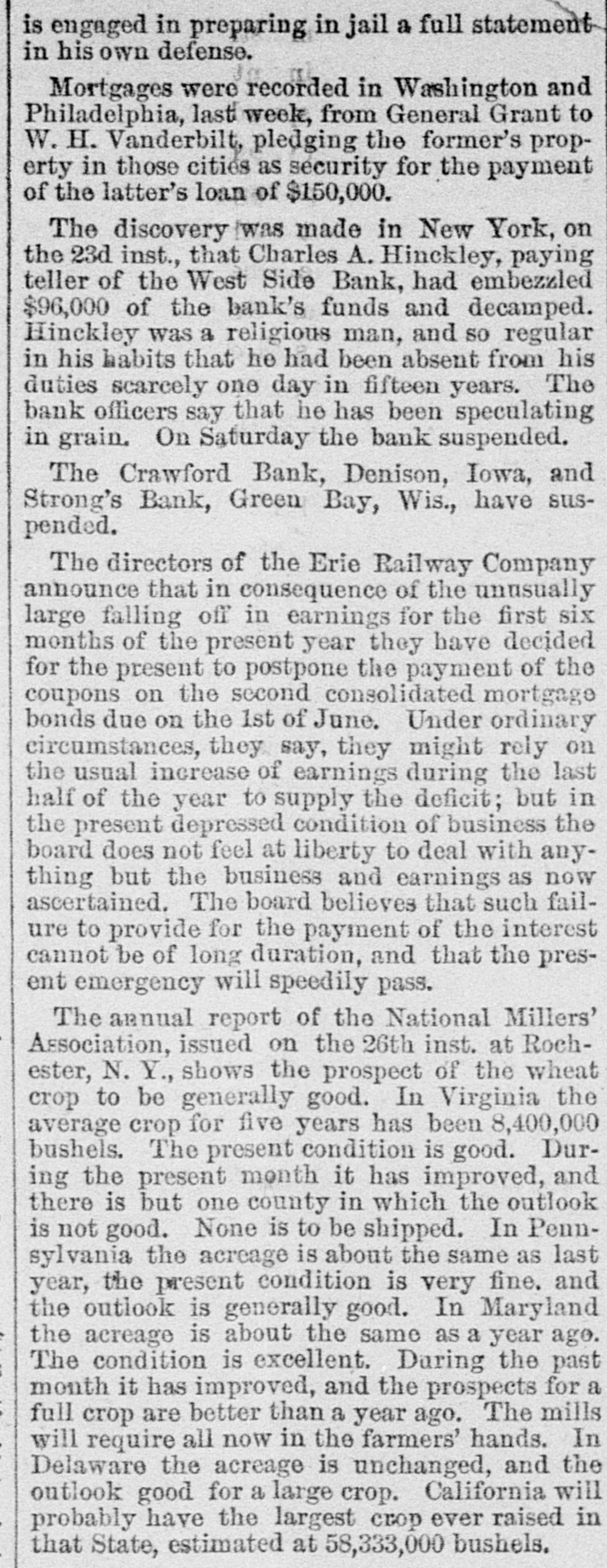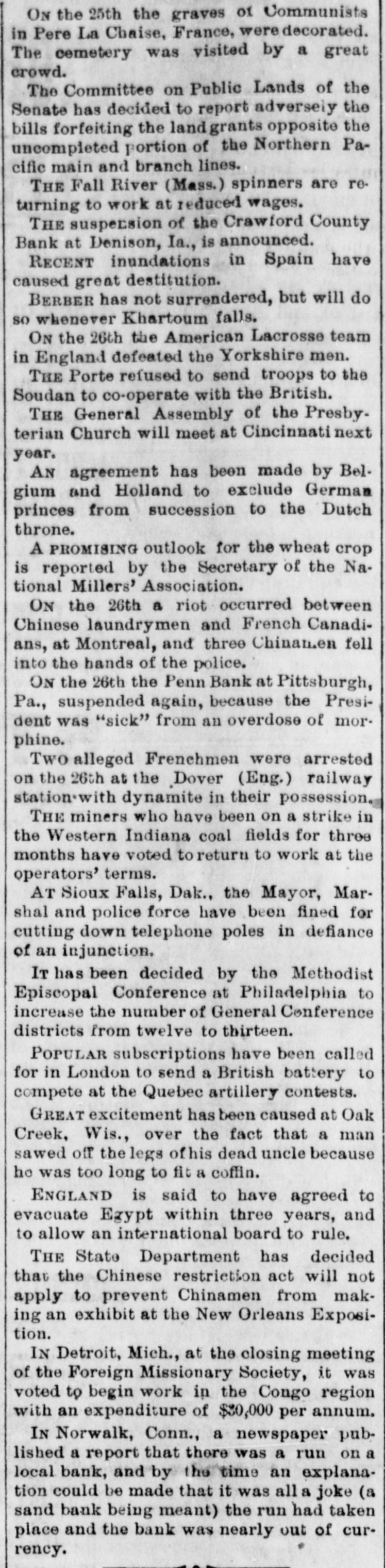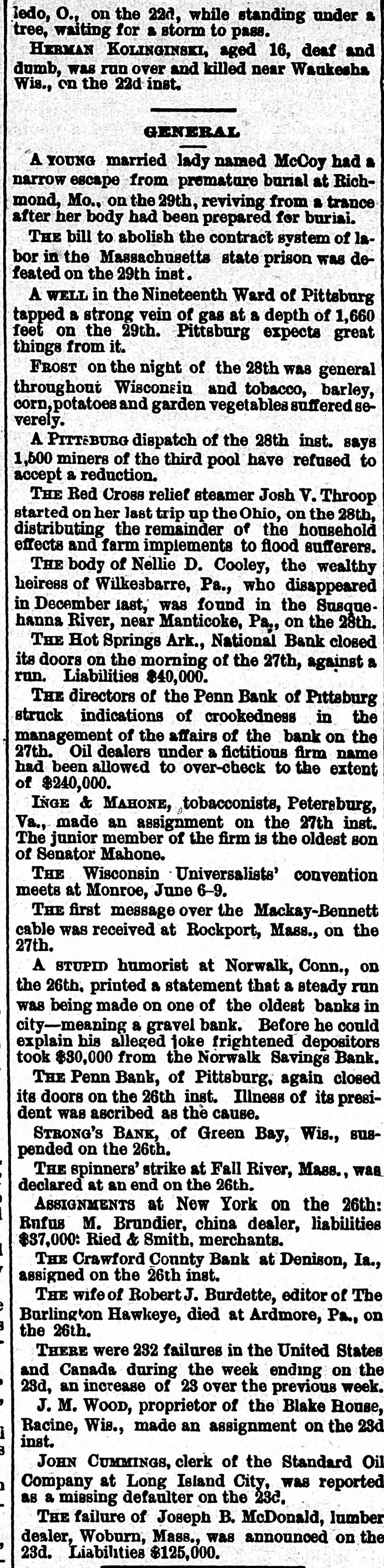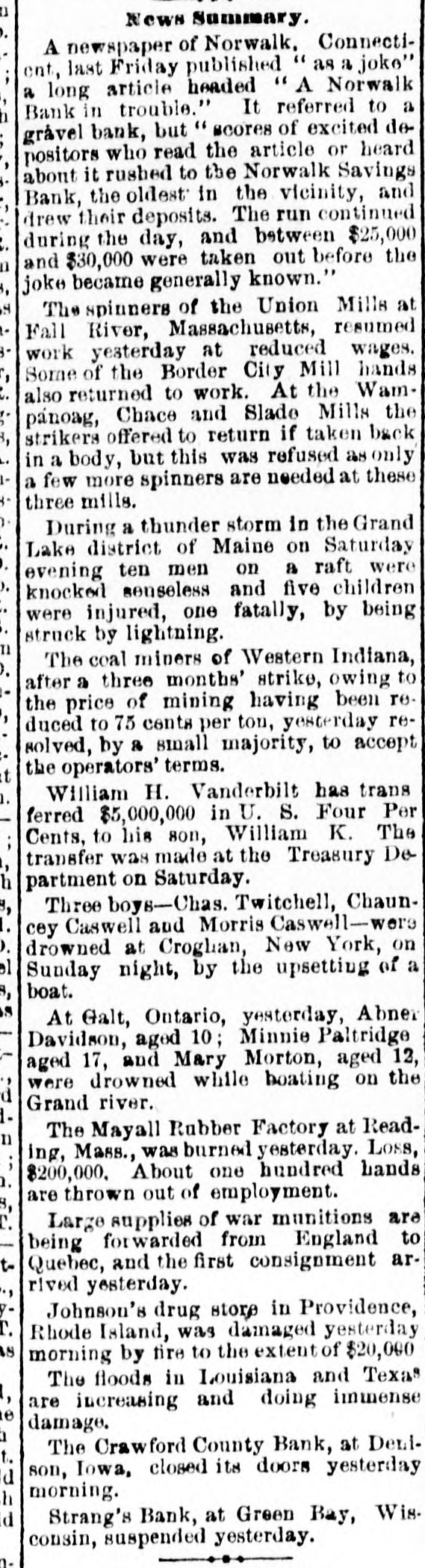 11 News Summary. . A newspaper of Norwalk, Connectient, last Friday published " as a joke" a long article headed " A Norwalk Bank in trouble." It referred to a h grável bank, but scores of excited depositors who read the article or heard rushed to the oldest in about Bank, it the the Norwalk vicinity, Savings and drew their deposits. The run continued during the day, and between $25,000 and $30,000 were taken out before the n 3, joke became generally known." 8 The spinners of the Union Mills at Fall River, Massachusetts, resumed 8 work yesterday at reduced wages. Some of the Border City Mill hands ; also returned to work. At the Wampánoag, Chace and Slado Mills the 3, strikers offered to return if taken back in a body, but this was refused as only a few more spinners are needed at these three mills. During a thunder storm in the Grand Lake district of Maine on Saturday . evening ten men on a raft were ). knocked senseless and five children were injured, one fatally, by being struck by lightning. n The coal miners of Western Indiana, , after a three months' strike, owing to the price of mining having been re. duced to 75 cents per ton, yesterday resolved, by & small majority, to accept the operators' terms. it William H. Vanderbilt has trans . ferred $5,000,000 in U. S. Four Per Cents, to his son, William K. The transfer was made at the Treasury De, h partment on Saturday. 8, Three boys-Chas. Twitchell, Chaun1. cey Caswell and Morris Caswell-were ). drowned at Croghan, New York, on el Sunday night, by the upsetting of a boat. 8, is At Galt, Ontario, yesterday, Abner Davidson, aged 10; Minnie Paltridge aged 17, and Mary Morton, aged 12, were drowned while boating on the d Grand river. 1. The Mayall Rubber Factory at ReadIl ing, Mass., was burned yesterday. Loss, $200,000. About one hundred hands h. are thrown out of employment. r. Large supplies of war munitions are being forwarded from England to Quebec, and the first consignment arrived yesterday. 7Johnson's drug store in Providence, T. Rhode Island, was damaged yesterday morning by fire to the extent of $20,000 The floods in Louisiana and Texas are increasing and doing immense e damage. a The Crawford County Bank, at Deuit. son, Iowa, closed its doors yesterday d morning. h Strang's Bank, at Green Bay, Wis. consin, suspended yesterday.