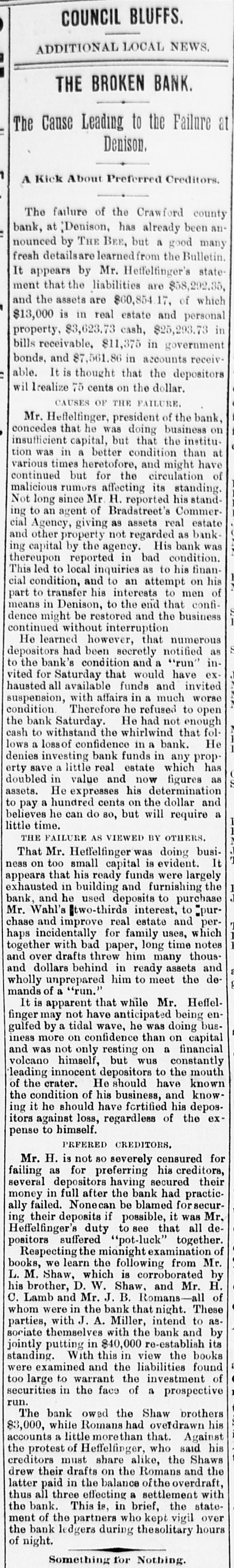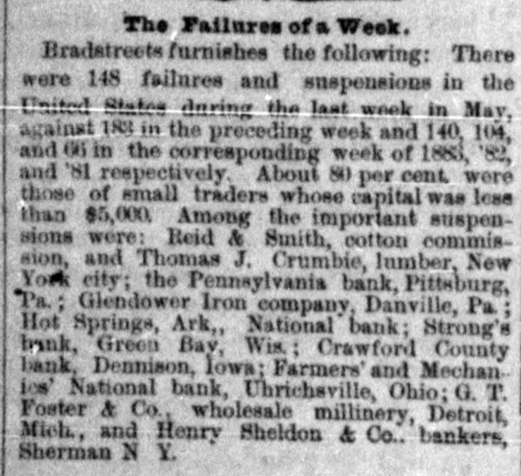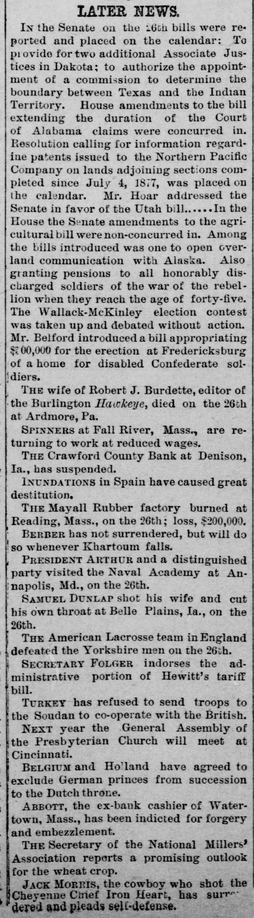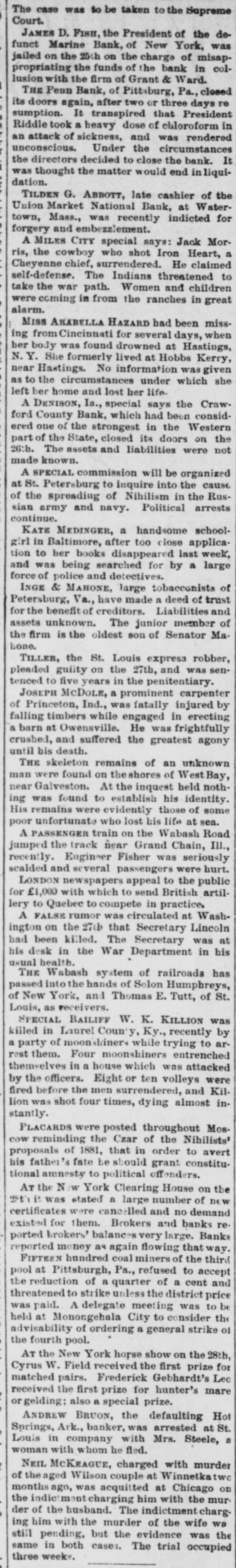 11 News Summary. . A newspaper of Norwalk, Connectient, last Friday published " as a joke" a long article headed " A Norwalk Bank in trouble." It referred to a h grável bank, but scores of excited depositors who read the article or heard rushed to the oldest in about Bank, it the the Norwalk vicinity, Savings and drew their deposits. The run continued during the day, and between $25,000 and $30,000 were taken out before the n 3, joke became generally known." 8 The spinners of the Union Mills at Fall River, Massachusetts, resumed 8 work yesterday at reduced wages. Some of the Border City Mill hands ; also returned to work. At the Wampánoag, Chace and Slado Mills the 3, strikers offered to return if taken back in a body, but this was refused as only a few more spinners are needed at these three mills. During a thunder storm in the Grand Lake district of Maine on Saturday . evening ten men on a raft were ). knocked senseless and five children were injured, one fatally, by being struck by lightning. n The coal miners of Western Indiana, , after a three months' strike, owing to the price of mining having been re. duced to 75 cents per ton, yesterday resolved, by & small majority, to accept the operators' terms. it William H. Vanderbilt has trans . ferred $5,000,000 in U. S. Four Per Cents, to his son, William K. The transfer was made at the Treasury De, h partment on Saturday. 8, Three boys-Chas. Twitchell, Chaun1. cey Caswell and Morris Caswell-were ). drowned at Croghan, New York, on el Sunday night, by the upsetting of a boat. 8, is At Galt, Ontario, yesterday, Abner Davidson, aged 10; Minnie Paltridge aged 17, and Mary Morton, aged 12, were drowned while boating on the d Grand river. 1. The Mayall Rubber Factory at ReadIl ing, Mass., was burned yesterday. Loss, $200,000. About one hundred hands h. are thrown out of employment. r. Large supplies of war munitions are being forwarded from England to Quebec, and the first consignment arrived yesterday. 7Johnson's drug store in Providence, T. Rhode Island, was damaged yesterday morning by fire to the extent of $20,000 The floods in Louisiana and Texas are increasing and doing immense e damage. a The Crawford County Bank, at Deuit. son, Iowa, closed its doors yesterday d morning. h Strang's Bank, at Green Bay, Wis. consin, suspended yesterday.