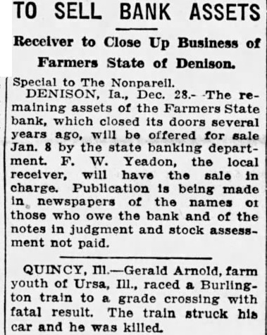 TO SELL BANK ASSETS Receiver to Close Up Business of Farmers State of Denison. Special to The Nonpareil. DENISON, Ia., Dec. 28.- The remaining assets of the Farmers State bank, which closed its doors several years ago, will be offered for sale Jan. 8 by the state banking department. F. W. Yeadon, the local receiver, will have the sale in charge. Publication is being made in, newspapers of the names 01 those who owe the bank and of the notes in judgment and stock assessment not paid. QUINCY, Ill-Gerald Arnold, farm youth of Ursa, Ill., raced a Burlington train to grade crossing with fatal result. The train struck his car and he was killed.