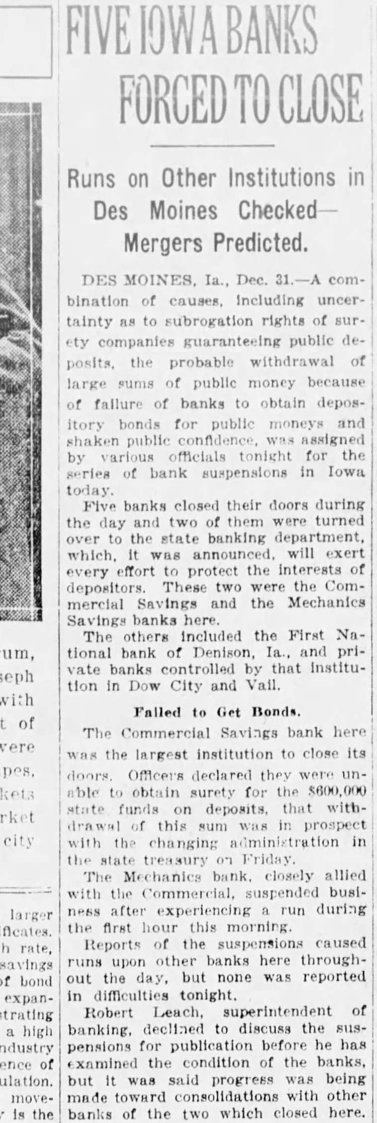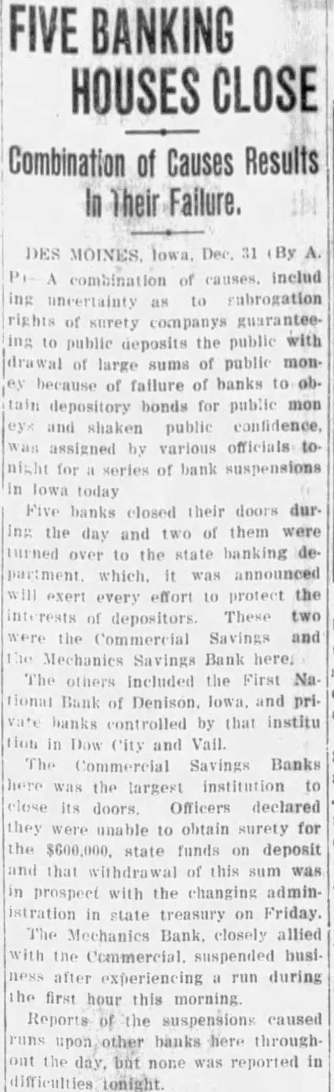 Des Moines, Ia., Dec. 31.-A combination of causes, including uncertainty as to subrogation rights of surety guaranteeing public deposits, the probable withdrawal of large sums of public money because of failure of banks to obtain depository bonds for publie moneys and shaken public confidence, was assigned by various of ficials tonight for the series of bank suspensions in Iowa today. Five banks closed their doors during the day and two of them were turned over to the State banking department, which, it was announced, will exert every effort to protect the interests of the depositors. These two were the Commercial and the Mechanics Savings banks The others include the First National bank, of Denison, Ia., and private banks controlled by that institution in Dow city and Vail The Commercial Savings bank here was the largest institution to close its doors. Officers declared they were unable to obtain surety for the $600 000 State funds on deposit and that withdrawal of this sum was in prospect with the changing administration in the State treasury on Friday The Mechanics bank, closely allied with the Commercial, suspended business after experiencing a run this morning. Reports of the suspensions caused runs upon other banks here throughout the day. but none was reported in diffeulties tonight. Robert Leach, superintendent of banking, is examining the condition of the banks. It was said progress was being made toward consolidations with other banks of the two which closed here.