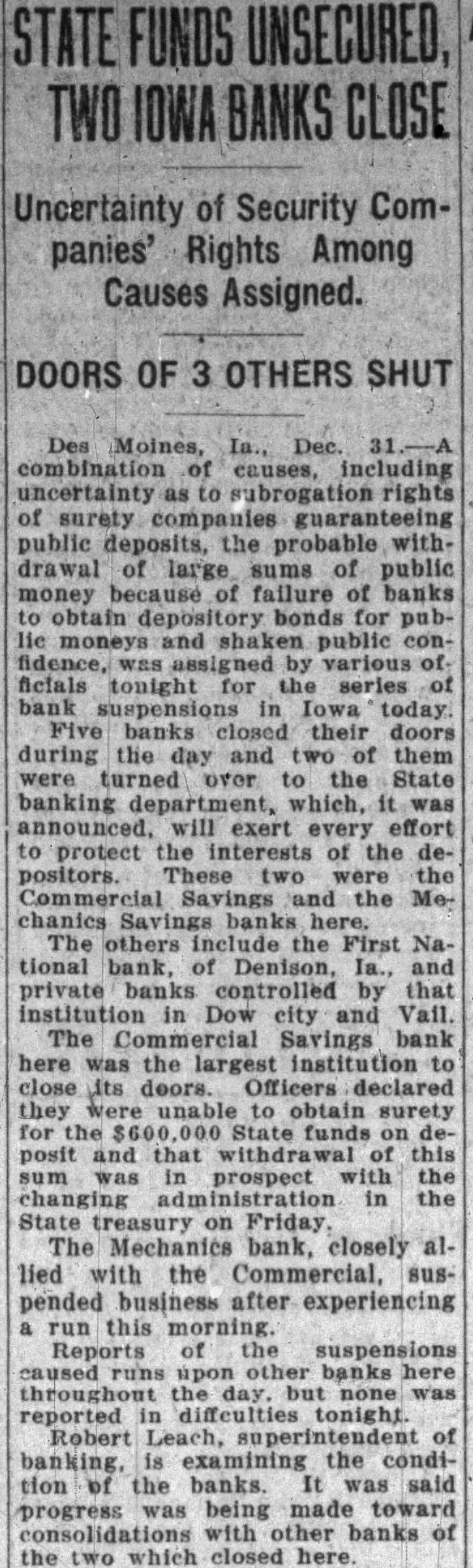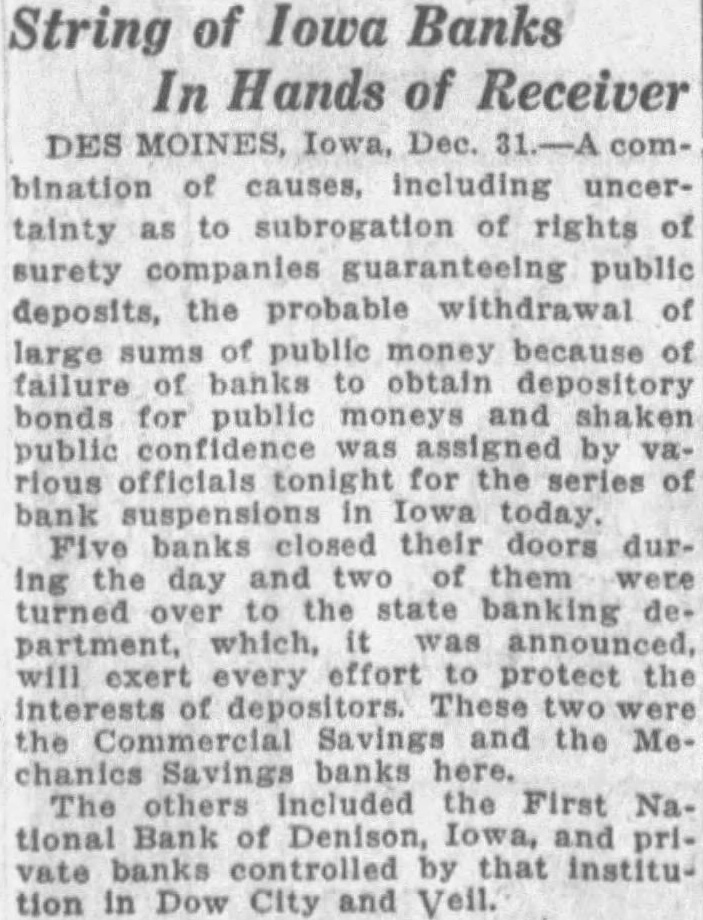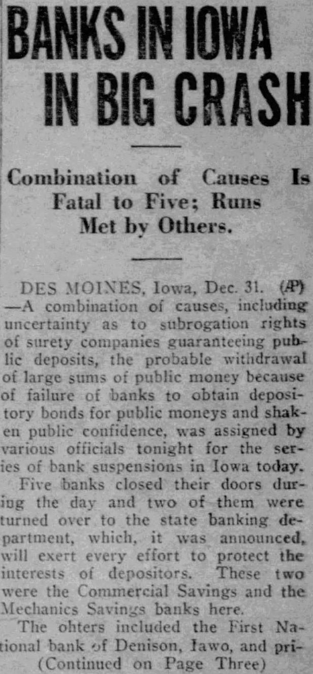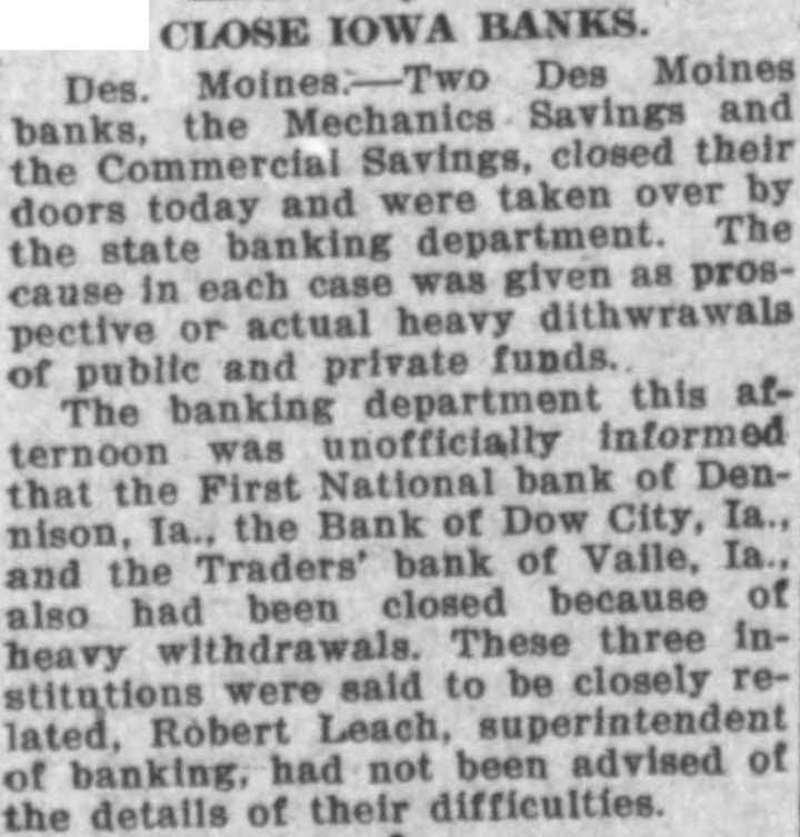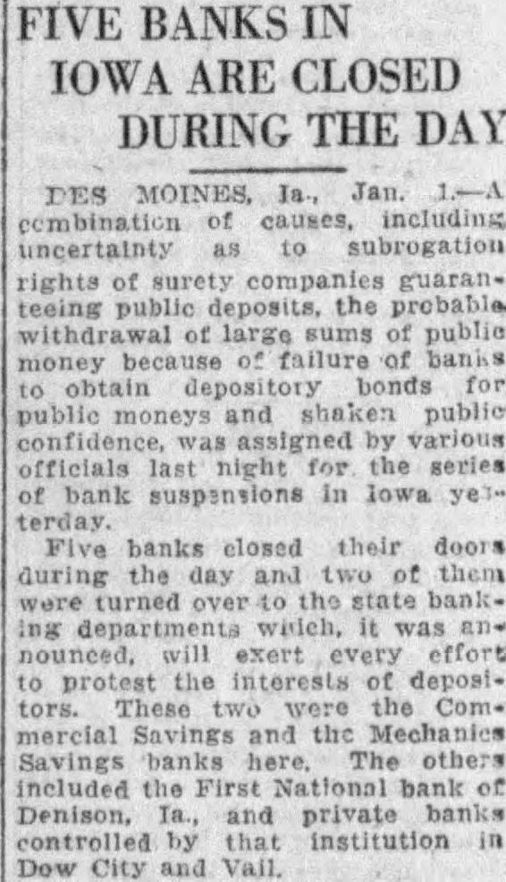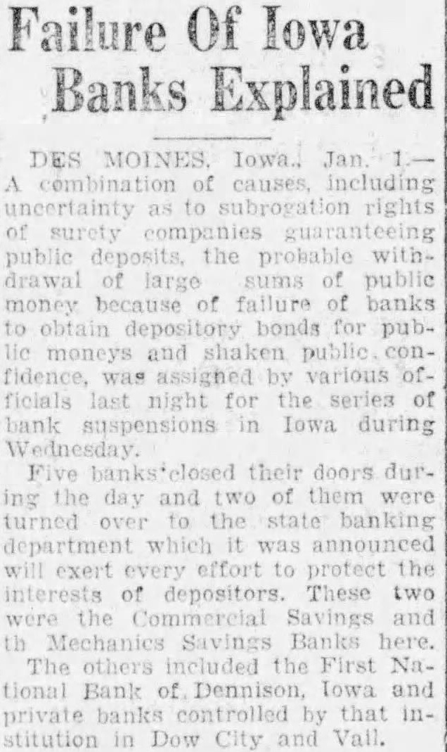 Failure Of Iowa Banks Explained combination causes, including uncertainty rights public deposits. the probable with. drawal large sums money because of failure of banks to obtain bonds for pubmoneys and public fidence, assigned various ficials night for the bank suspensions in Iowa during their doors during the day and of them turned to the state banking department was announced effort protect the interests of depositors. These two Savings Mechanics Savings Banks The others the First Na. tional Bank of Dennison, Iowa and banks controlled that private stitution in Dow City and Vall.
