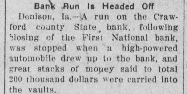 Bank Run Headed Off Denison, run on the Craw. ford county State bank, following blosing of the First National bank, stopped when high-powered automobile drew up the bank, and great stacks money said total thousand dollars were carried into the vaults.