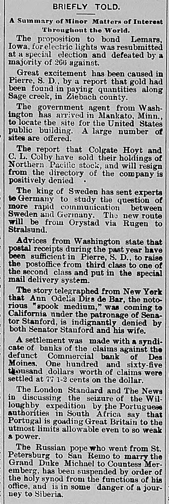 BRIEFLY TOLD. A Summary of Minor Matters of Interest Throughout the World. The proposition to bond Lemars, Iowa, for electric lights was resubmitted at a special election and defeated by a majority of 266 against. Great excitement has been caused in Pierre, S. D., by a report that gold had been found in paying quantities along Sage creek, in Ziebach county. The government agent from Washington has arrived in Mankato, Minn., to locate the site for the United States public building. A large number of sites are offered. The report that Colgate Hoyt and C. L. Colby have sold their holdings of Northern Pacific stock, and will resign from the directory of the company is positively denied The king of Sweden has sent experts to Germany to study the question of more rapid communication between Sweden and Germany. The new route will be from Orystad via Rugen to Stralsund. Advices from Washington state that postal receipts during the past year have been sufficient in Pierre, S. D., to raise the postoffice from third class to one of the second class and put in the special mail delivery system. The story telegraphed from New York that Ann Odelia Diss de Bar, the notorious "spook medium," was coming to California under the patronage of Senator Stanford, is indignantly denied by both Senator Stanford and his wife. A settlement was made with a syndicate of banks of the claims against the defunct Commercial bank of Des Moines. One hundred and sixty-five thousand dollars worth of claims were settled at 77 1-2 cents on the dollar. The London Standard and The News in discussing the seizure of the Willoughby expedition by the Portuguese authorities in South Africa say that Portugal is goading Great Britain to the utmost limits allowable even to so weak a power. The Russian pope who went from St. Petersburg to San Remo to marry the Grand Duke Michael to Countess Meremberg, has been suspended by order of the holy synod from the functions of his office, and is in some danger of a journey to Siberia.