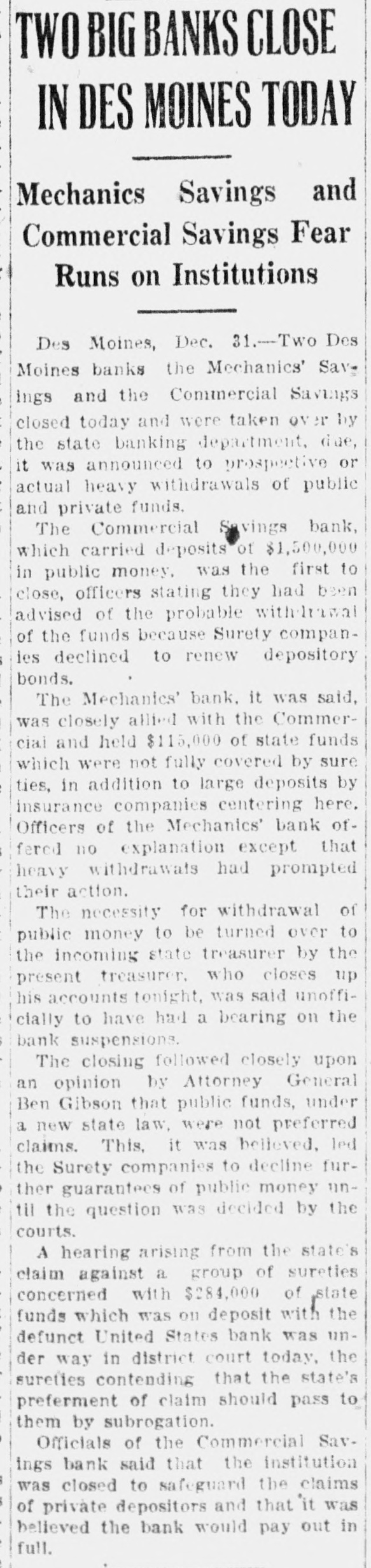 TWO BIG BANKS CLOSE IN DES MOINES TODAY Mechanics Savings and Commercial Savings Fear Runs on Institutions Des Moines, Dec. 31.-Two Des Moines banks the Mechanics' Savings and the Commercial Savings closed today and were taken over by the state banking department, due, it was announced to prospective or actual heavy withdrawals of public and private funds. The Commercial Savings bank, which carried deposits of $1,500,000 in public money. was the first to close, officers stating they had been advised of the probable withdrawal of the funds because Surety companies declined to renew depository bonds. The Mechanics' bank. it was said, was closely allied with the Commerciai and held $115,000 of state funds which were not fully covered by sure ties, in addition to large deposits by insurance companies centering here. Officers of the Mechanics' bank offered no explanation except that heavy withdrawals had prompted their action. The necessity for withdrawal of public money to be turned over to the incoming state treasurer by the present treasurer. who closes up his accounts tonight, was said unofficially to have had a bearing on the bank suspensions. The closing followed closely upon an opinion by Attorney General Ben Gibson that public funds, under a new state law, were not preferred claims. This, it was believed, led the Surety companies to decline further guarantees of public money until the question was decided by the courts. A hearing arising from the state's claim against a group of sureties concerned with $284,000 of state funds which was on deposit with the defunct United States bank was under way in district court today, the sureties contending that the state's preferment of claim should pass to them by subrogation. Officials of the Commercial Savings bank said that the institution was closed to safeguard the claims of private depositors and that it was believed the bank would pay out in full.