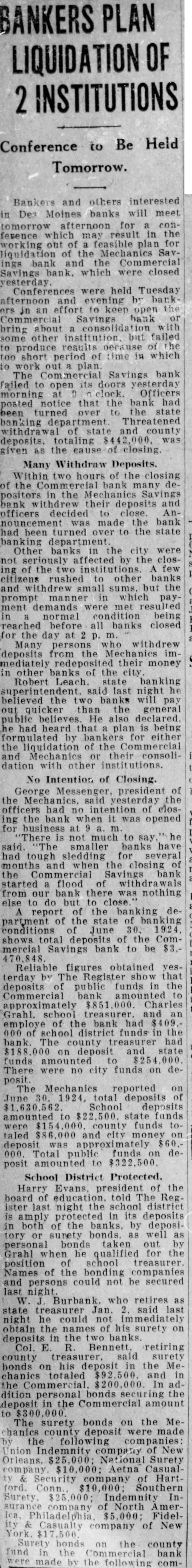 George Messenger, president of the Mechanics, said yesterday the officers had no intention of closing the when it was opened business at m There not much to say he said. "The smaller banks have had tough sledding for several months and when the closing of the Commercial Savings bank started flood of withdrawals from our bank there was nothing else to do but to close report of the department of the state of banking conditions of June 30. 1924 shows deposits of the Commercial Savings bank to be $3.Reliable figures obtained yesterday by The Register show that deposits of public funds in the Commercial bank amounted to approximately $851,000 Charles Grahl. treasurer and employe of the bank had $409. 000 of district funds in the bank The county treasurer had $188 000 on deposit and state funds amounted $254 000 There were no city funds on deThe Mechanics reported on June 30. 1924, total deposits of School deposits amounted to $22,500. state funds were 4.000. county funds totaled $86,000 and city money on deposit was $60. 000 Total funds on deposit amounted to $322,500