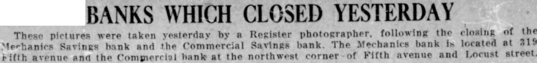 These pictures were taken yesterday by Register photographer, following the closing of the Mechanics Savings bank and the Commercial Savings bank The Mechanics bank is located at 319 avenue and the Commercial bank at the northwest corner of Fifth avenue and Locust street.