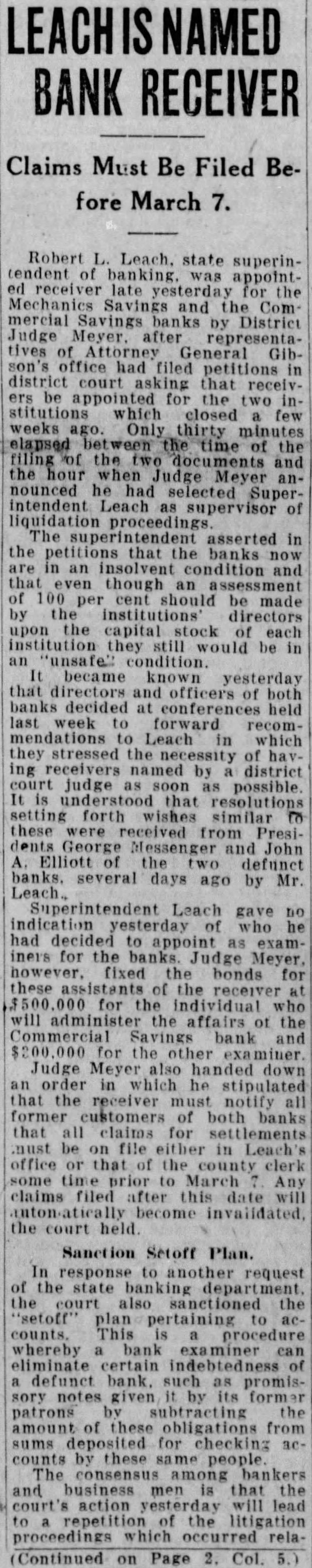 Robert Leach. state superintendent of was appoint. ed receiver late yesterday for Mechanics and the Com mercial Savings District by Judge after representatives office had filed petitions in district court asking that ers be appointed for the two stitutions which closed few weeks minutes elapsed the two and the hour when Judge Meyer announced he had selected Superintendent Leach as supervisor of liquidation proceedings asserted in the petitions that the banks now are an insolvent condition and that even though an assessment 100 per should be made by institutions directors upon the each they would be in an became known yesterday that directors and of banks decided at conferences held last week forward recomto Leach which they stressed the of ing receivers by district judge as soon possible understood that setting forth wishes similar to these received from Presiand John Elliott banks. several ago by Mr. Superintendent Leach gave yesterday had decided to appoint iners for the banks Judge Meyer, bonds for these of the 500 000 the individual who will administer the affairs of the Savings bank and for other examiner Judge Meyer handed down order in which stipulated that the notify customers of banks that all for be on file in Leach's office that the county some time prior to March Any claims filed after date become the court held