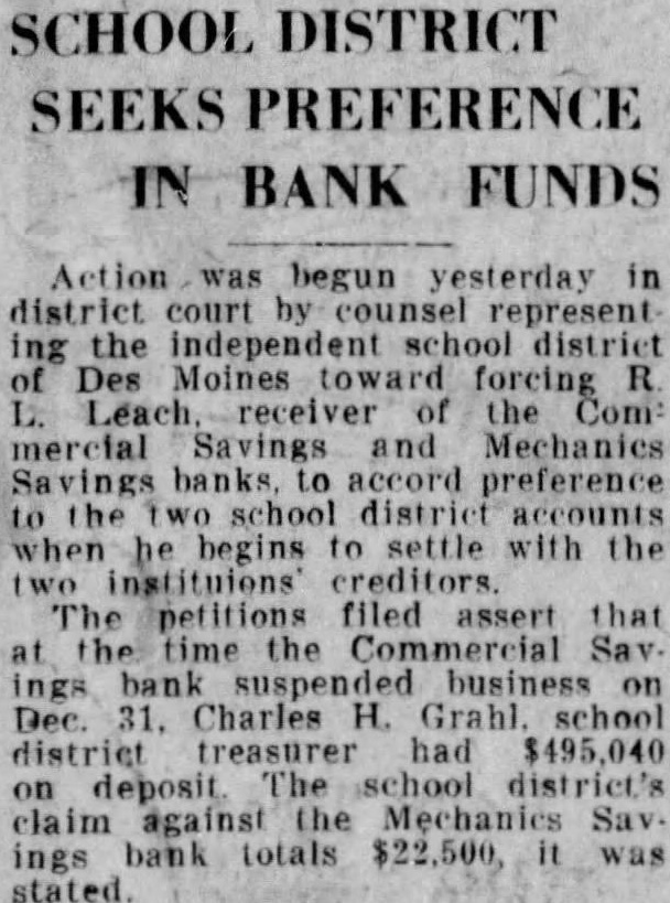 SCHOOL DISTRICT SEEKS PREFERENCE IN BANK FUNDS was begun yesterday in district court represent ing the independent school district Des Moines foreing R Leach receiver Com mercial Savings and Mechanics Savings banks, to accord preference to district accounts when begins to settle with the The petitions filed assert that at time the Commercial Sav ings bank suspended business on Charles Grabl. school district treasurer had $495,040 deposit district's claim against the Mechanics Sav. ings bank totals it was stated