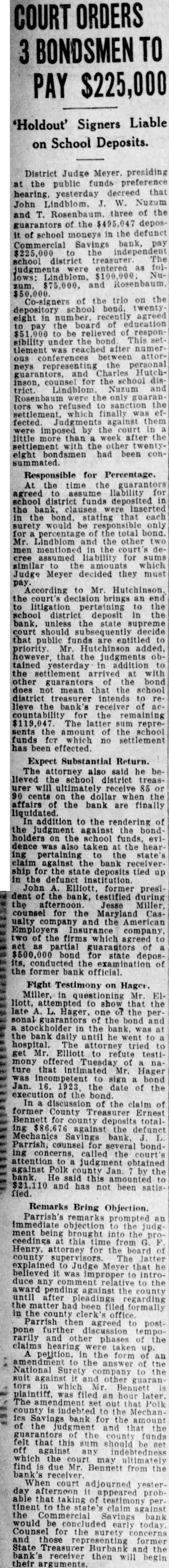 District Judge Meyer, presiding at the public funds preference hearing, yesterday decreed that John Lindblom. W. Nuzum and T. Rosenbaum. three of the guarantors of the deposof school moneys in the defunct Commercial Savings bank, pay $225,000 independent school treasurer The entered as folNulows: Lindblom, and Co-signers of the trio on the depository bond, twenty in recently agreed eight the board to relieved respon sibility under the tlement was after numer attorneys representing personal and Hutchcounsel for the school inson, Nuzum and trict. Rosenbaum were the only tors refused the settlement which finally fected. Judgments against them were imposed by the court little than week after the settlement with the other twentyeight bondsmen had been consummated.