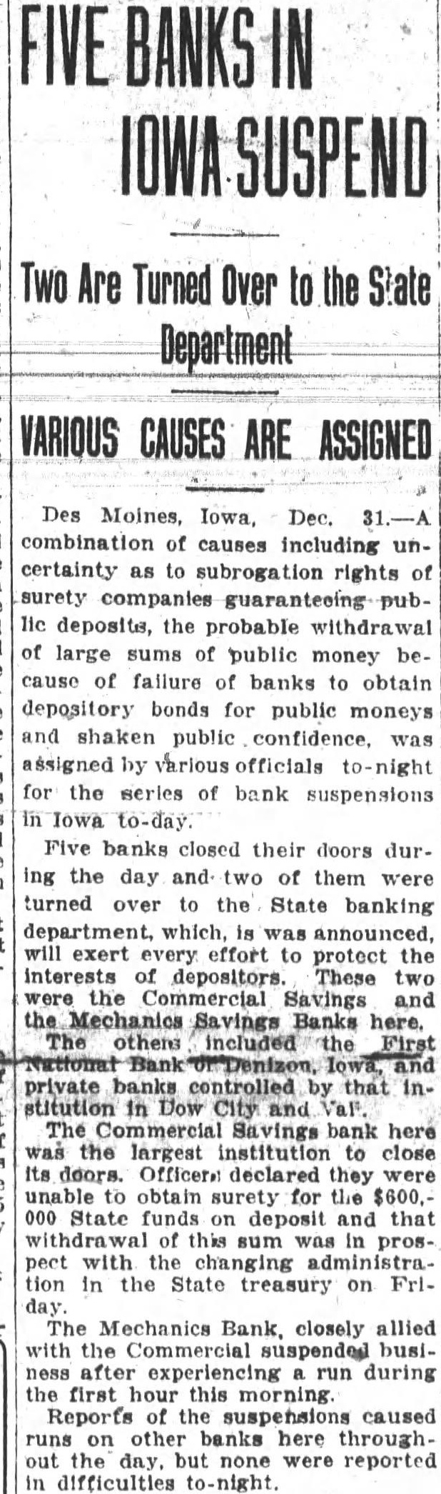 DES MOINES, Iowa, Dec. 31. (A) combination of causes, including uncertainty as to subrogation rights of surety public deposits, the probable withdrawal of large sums of public money because of failure of banks to obtain depository bonds for public moneys and shaken public confidence, was assigned by various officials tonight for the series of bank suspensions in Iowa today. Five banks closed their doors during the day and two of them were turned over to the state banking department, which, it was announced, exert every effort to protect the interests depositors. These two were the Commercial Savings and the Mechanics Savings banks here The ohters included the First National bank of Denison, lawo, and pri(Continued on Page Three)