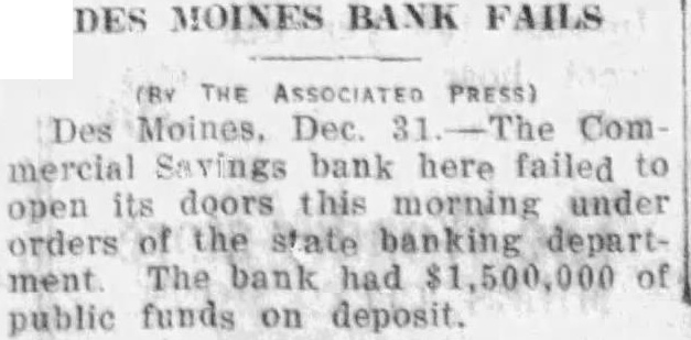 THE ASSOCIATED PRESS) Des Moines. Dec. 31 Com mercial Savings bank here failed to open its doors this morning under orders of the state banking department The bank had $1,500,000 of public funds on deposit.