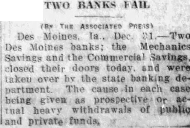 THE ASSOCIATED PHEAS) Des Moines, Dec. Des Moines banks: the Mechanics Savings and the Commercial Savings closed their doors today and were takeu by the state banking department The cause each case being given as prospective or tual heavy withdrawals of public and