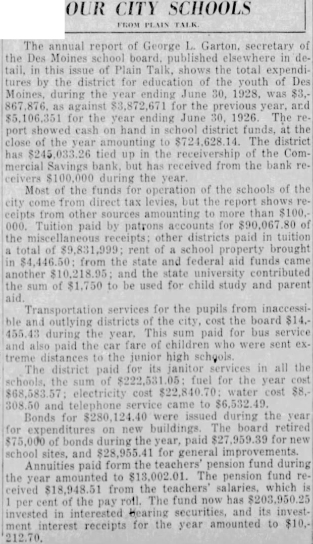 OUR CITY SCHOOLS FROM The annual report of George L. Garton, secretary of the Des Moines school board. published elsewhere in dein this issue of Plain Talk, shows the total expenditures by the district for education of the youth of Des Moines, during the year ending June was against $3,872,671 for the previous year, and $5,106,351 for the year ending June 30. 1926. The report showed cash hand in school district funds, at the on close of the amounting to The district year has tied up in the receivership of the Commercial Savings bank. but has received from the bank receivers $100,000 during the year Most of the funds for operation of the schools of the city come from direct tax levies, but the report shows receipts from other sources amounting to more than 000. Tuition paid by patrons accounts for $90.067 of the miscellaneous receipts; other districts paid in tuition total of $9,831,999: rent of school property brought in from the state and federal aid funds came the state university contributed another the sum of to be used for child study and parent aid services for the pupils from inaccessiTransportation ble outlying districts the city, cost the board $14.the This sum paid for bus service during year. and also paid the car fare of children were sent treme distances the junior high schools. The district paid for its janitor services in all the schools, the sum of fuel for the year cost cost water cost electricity 50 and telephone came to $6,532.49. Bonds for were issued during the year for expenditures on new buildings. The board retired of bonds during the year, paid for new school sites, and $28,955.41 for general Annuities paid form teachers' pension fund during amounted to $13,002.01. The pension fund rethe year ceived $18,948.51 from the teachers salaries. which per cent of the pay roll. The fund now has interested bearing securities, and its investinvested in ment interest receipts for the year amounted to $10.212.70.