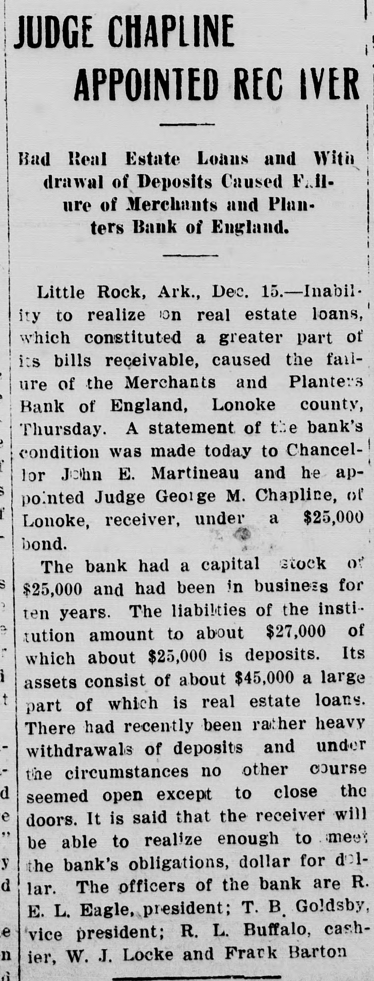 FAILED TO REALIZE ON REAL ESTATE LOANS Little Rock, Dec. 16.-Inability to realize on real estate loans which constituted the greater part of its bills receivable caused the failure of the Merchants' and Planters' Rank of England, Lonoke county this week. A statement of the bank's condition was made on Friday to Chancellor Martineau, and he appointed Judge George M. Chaplin of Lonoke, receiver, under $25,000 bond. The bank had a capital stock of $25,000 and had been in business less than ten years. The liabilities of the institution amount to about $27,000 of which about $20,090 is deposits. Its assets consist of about $45,000, a large part of which is real estate loans. There had recently been rather heavy withdrawals of deposits, and under the circumstances, no other course seemed open except