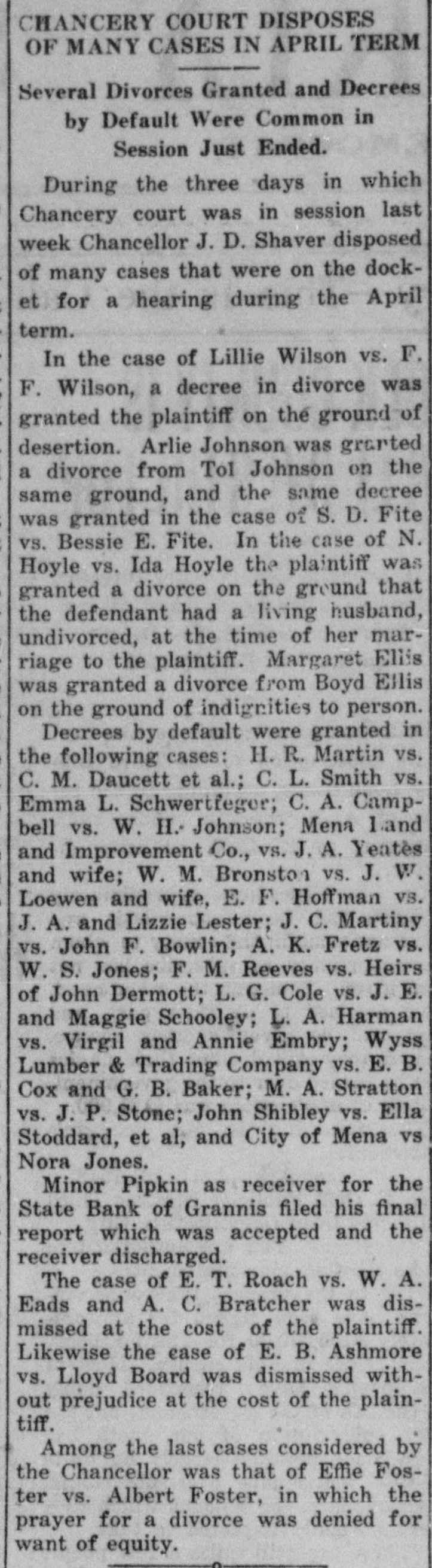 CHANCERY COURT DISPOSES OF MANY CASES IN APRIL TERM Several Divorces Granted and Decrees by Default Were Common in Session Just Ended. During the three days in which Chancery court was in session last week Chancellor J. D. Shaver disposed of many cases that were on the docket for a hearing during the April term. In the case of Lillie Wilson vs. F. F. Wilson, a decree in divorce was granted the plaintiff on the ground of desertion. Arlie Johnson was grarted a divorce from Tol Johnson on the same ground, and the same decree was granted in the case of S. D. Fite vs. Bessie E. Fite. In the case of N. Hoyle vs. Ida Hoyle the plaintiff was granted a divorce on the ground that the defendant had a living husband, undivorced, at the time of her marriage to the plaintiff. Margaret Ellis was granted a divorce from Boyd Ellis on the ground of indignities to person. Decrees by default were granted in the following cases: H. R. Martin vs. C. M. Daucett et al.; C. L. Smith vs. Emma L. Schwertfeger; C. A. Campbell vs. W. H. Johnson; Mena land and Improvement Co., vs. J. A. Yeates and wife; W. M. Bronston vs. J. W. Loewen and wife, E. F. Hoffman vs. J. A. and Lizzie Lester; J. C. Martiny vs. John F. Bowlin; A. K. Fretz vs. W. S. Jones; F. M. Reeves vs. Heirs of John Dermott; L. G. Cole vs. J. E. and Maggie Schooley; L. A. Harman vs. Virgil and Annie Embry; Wyss Lumber & Trading Company vs. E. B. Cox and G. B. Baker; M. A. Stratton vs. J. P. Stone; John Shibley vs. Ella Stoddard, et al, and City of Mena vs Nora Jones. Minor Pipkin as receiver for the State Bank of Grannis filed his final report which was accepted and the receiver discharged. The case of E. T. Roach vs. W. A. Eads and A. C. Bratcher was dismissed at the cost of the plaintiff. Likewise the case of E. B. Ashmore vs. Lloyd Board was dismissed without prejudice at the cost of the plaintiff. Among the last cases considered by the Chancellor was that of Effie Foster vs. Albert Foster, in which the prayer for a divorce was denied for want of equity.
