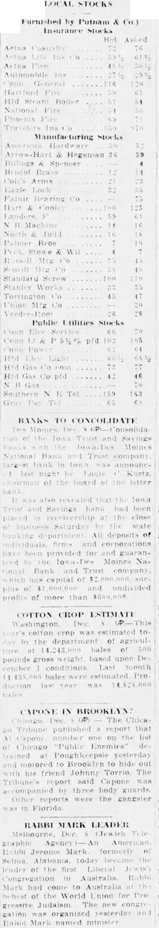 LOCAL STOCKS Furnished by Putnam & Co.) BANKS TO CONCOLIDATE and Savings Moines National Trust last of latter Savings bank had been close Saturday state All deposits corporations provided for and lowa-Des Moines NaBank company. capital of undivided profits of more than COTTON CROP ESTIMATE tothe of pounds Prolast CAPONE IN BROOKLYN? Tribune published report the list Chicago Enemies" and Brooklyn to hide out with his friend Johnny Torrio. The Tribune's report said Capone accompanied by three body guards. Other reports were the gangster in Florida RABBI MARK LEADER Melbourne. Agency Jerome Mark formerly of leader of the first Liberal Australia Rabbi Mark had Australia behest the World Union for Pro gressive The Rabbi Mark named Asked Ins Automobile Boiler 54 National Phoenix Stocks Hegeman 39 Billings Coll's Arms Lock Bearing 125 Landers North Judd Bros Screw Stanley Works Torrington 45 Public tilities Stocks 105 Gas 42 46 Southern
