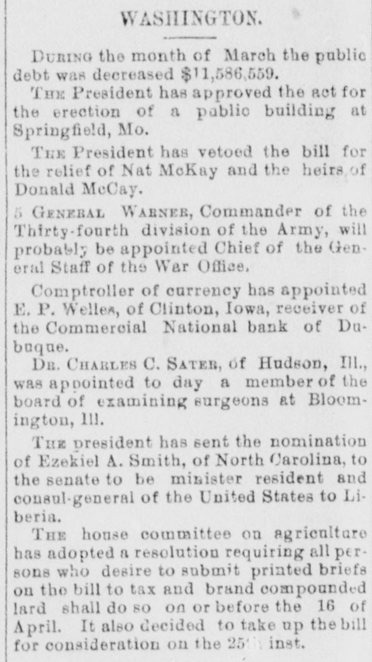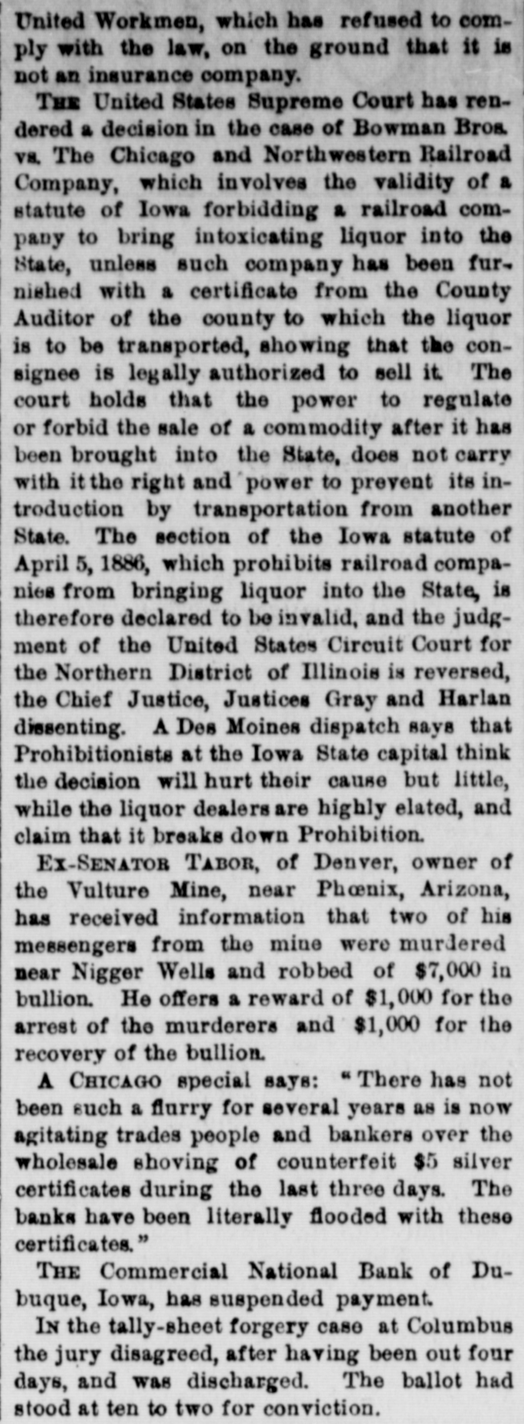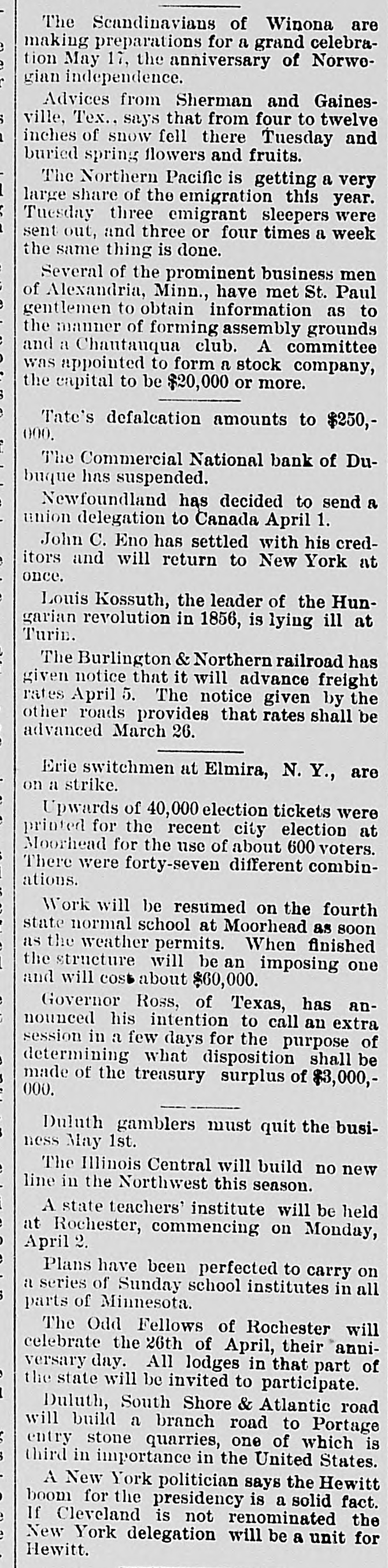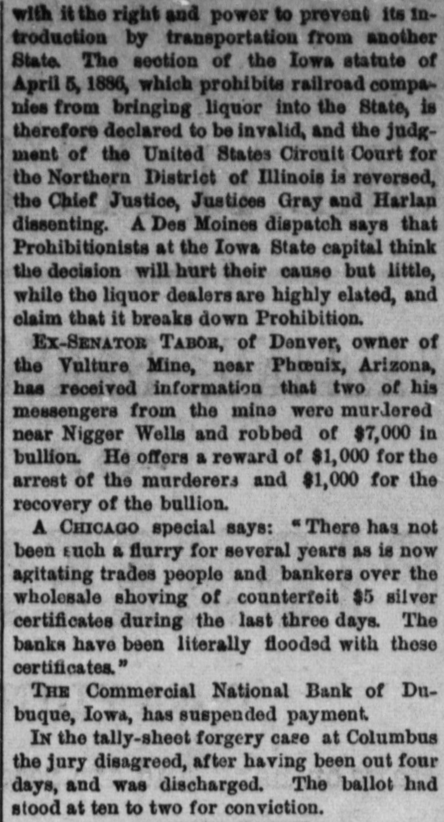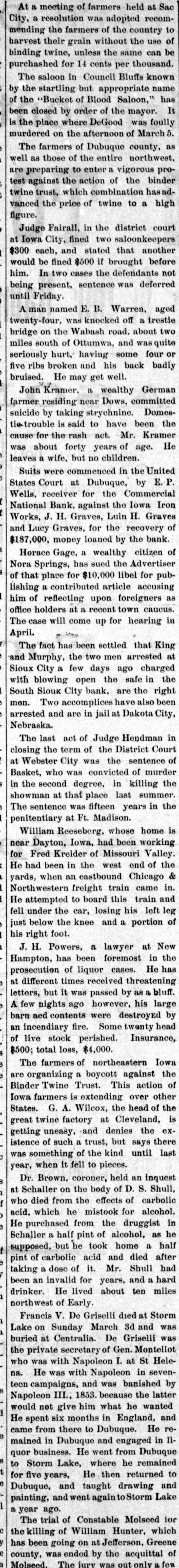 At a meeting of farmers held at Sac City, a resolution was adopted recommending the farmers of the country to harvest their grain without the use of binding twine, unless the same can be purchashed for 14 cents per thousand. The saloon in Council Bluffs known by the startling but appropriate name of the "Bucket of Blood Saloon," has been closed by order of the mayor. It is the place where DeGood was foully murdered on the afternoon of March 5. The farmers of Dubuque county, as well as those of the entire northwest, are preparing to enter a vigorous protest against the action of the binder twine trust, which combination hasadvanced the price of twine to a high figure. Judge Fairall, in the district court at Iowa City, fined two saloonkeepers $300 each, and stated that another would be fined $500 if brought before him. In two cases the defendants not being present, sentence was deferred until Friday. A man named E. B. Warren, aged twenty-four, was knocked off a trestle bridge on the Wabash road, about two miles south of Ottumwa, and was quite seriously hurt, having some four or five ribs broken and his back badly bruised. He may get well. John Kramer, a wealthy Germar farmer residing near Dows, committed suicide by taking strychnine. Domestie-trouble is said to have been the cause for the rash act. Mr. Kramer was about forty years of age. He leaves a wife, but no children. Suits were commenced in the United States Court at Dubuque, by E. P. Wells, receiver for the Commercial National Bank, against the Iowa Iron Works, J. H. Graves, Luin H. Graves and Lucy Graves, for the recovery of $187,000, money loaned by the bank. Horace Gage, a wealthy citizen of Nora Springs, has sued the Advertiser of that place for $10,000 libel for publishing a contributed article accusing him of reflecting upon foreigners as office holders at a recent town caucus. The case will come up for hearing in April. The fact has been settled that King and Murphy, the two men arrested at Sioux City a few days ago charged with blowing open the safe in the South Sioux City bank, are the right men. Two accomplices have also been arrested and are in jail at Dakota City, Nebraska. The last act of Judge Hendman in closing the term of the District Court at Webster City was the sentence o Basket, who was convicted of murder in the second degree, in killing the showman at that place last summer The sentence was fifteen years in the penitentiary at Ft. Madison. William Reeseberg, whose home is near Dayton, Iowa, had been working for Fred Kreider of Missouri Valley He had been in the west end of the yards, when an eastbound Chicago & Northwestern freight train came in. He attempted to board this train and fell under the car, losing his left leg just below the knee and a portion of his right foot. J. H. Powers, a lawyer at New Hampton, has been foremost in the prosecution of liquor cases. He has at different times received threatening letters, but it was passed by as a bluff. A few nights ago however, his large barn aed contents were destroyEd by an incendiary fire. Some twenty head of live stock perished. Insurance, $500; total loss, $4,000. The farmers of northeastern Iowa are organizing a boycott against the Binder Twine Trust. This action of Iowa farmers is extending over other States. G. A. Wilcox, the head of the great twine factory at Cleveland, is getting uneasy, and denies the existence of such a trust, but says there was something of the kind until last year, when it fell to pieces. Dr. Brown, coroner, held an inquest at Schaller on the body of D. S. Shull, who died from the effects of carbolic acid, which he mistook for alcohol. He purchased from the druggist in Schaller a half pint of alcohol, as he supposed, but he took home a hali pint of carbolic acid and died after taking a dose of it. Mr. Shull had been an invalid for years, and a hard drinker. He lived about ten miles northwest of Early. Francis V. De Griselli died at Storm Lake on Sunday March 3d and was buried at Centralia De Griselli was