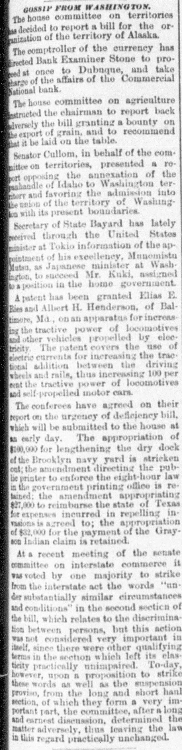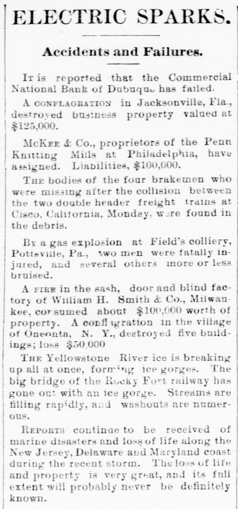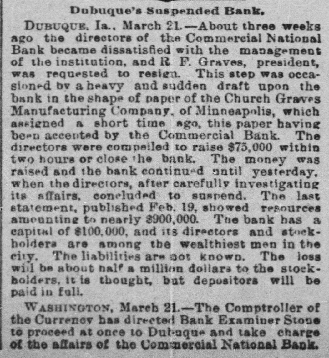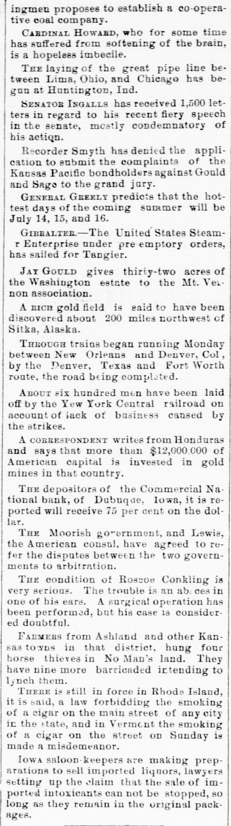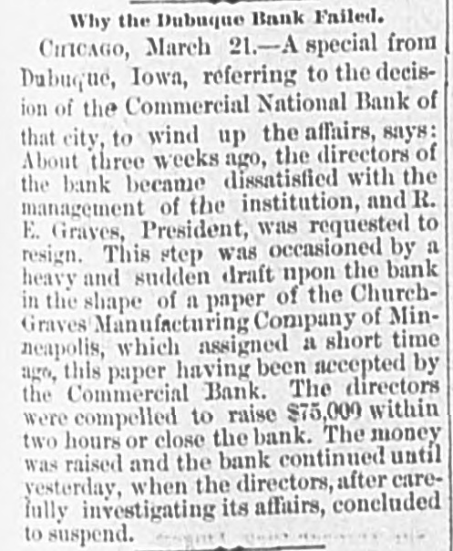 At a meeting of farmers held at Sac City, a resolution was adopted recommending the farmers of the country to harvest their grain without the use of binding twine, unless the same can be purchashed for 14 cents per thousand. The saloon in Council Bluffs known by the startling but appropriate name of the "Bucket of Blood Saloon," has been closed by order of the mayor. It is the place where DeGood was foully murdered on the afternoon of March 5. The farmers of Dubuque county, as well as those of the entire northwest, are preparing to enter a vigorous protest against the action of the binder twine trust, which combination hasadvanced the price of twine to a high figure. Judge Fairall, in the district court at Iowa City, fined two saloonkeepers $300 each, and stated that another would be fined $500 if brought before him. In two cases the defendants not being present, sentence was deferred until Friday. A man named E. B. Warren, aged twenty-four, was knocked off a trestle bridge on the Wabash road, about two miles south of Ottumwa, and was quite seriously hurt, having some four or five ribs broken and his back badly bruised. He may get well. John Kramer, a wealthy Germar farmer residing near Dows, committed suicide by taking strychnine. Domestie-trouble is said to have been the cause for the rash act. Mr. Kramer was about forty years of age. He leaves a wife, but no children. Suits were commenced in the United States Court at Dubuque, by E. P. Wells, receiver for the Commercial National Bank, against the Iowa Iron Works, J. H. Graves, Luin H. Graves and Lucy Graves, for the recovery of $187,000, money loaned by the bank. Horace Gage, a wealthy citizen of Nora Springs, has sued the Advertiser of that place for $10,000 libel for publishing a contributed article accusing him of reflecting upon foreigners as office holders at a recent town caucus. The case will come up for hearing in April. The fact has been settled that King and Murphy, the two men arrested at Sioux City a few days ago charged with blowing open the safe in the South Sioux City bank, are the right men. Two accomplices have also been arrested and are in jail at Dakota City, Nebraska. The last act of Judge Hendman in closing the term of the District Court at Webster City was the sentence o Basket, who was convicted of murder in the second degree, in killing the showman at that place last summer The sentence was fifteen years in the penitentiary at Ft. Madison. William Reeseberg, whose home is near Dayton, Iowa, had been working for Fred Kreider of Missouri Valley He had been in the west end of the yards, when an eastbound Chicago & Northwestern freight train came in. He attempted to board this train and fell under the car, losing his left leg just below the knee and a portion of his right foot. J. H. Powers, a lawyer at New Hampton, has been foremost in the prosecution of liquor cases. He has at different times received threatening letters, but it was passed by as a bluff. A few nights ago however, his large barn aed contents were destroyEd by an incendiary fire. Some twenty head of live stock perished. Insurance, $500; total loss, $4,000. The farmers of northeastern Iowa are organizing a boycott against the Binder Twine Trust. This action of Iowa farmers is extending over other States. G. A. Wilcox, the head of the great twine factory at Cleveland, is getting uneasy, and denies the existence of such a trust, but says there was something of the kind until last year, when it fell to pieces. Dr. Brown, coroner, held an inquest at Schaller on the body of D. S. Shull, who died from the effects of carbolic acid, which he mistook for alcohol. He purchased from the druggist in Schaller a half pint of alcohol, as he supposed, but he took home a hali pint of carbolic acid and died after taking a dose of it. Mr. Shull had been an invalid for years, and a hard drinker. He lived about ten miles northwest of Early. Francis V. De Griselli died at Storm Lake on Sunday March 3d and was buried at Centralia De Griselli was