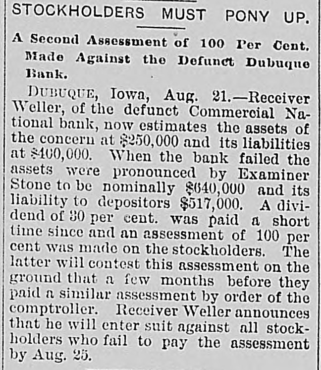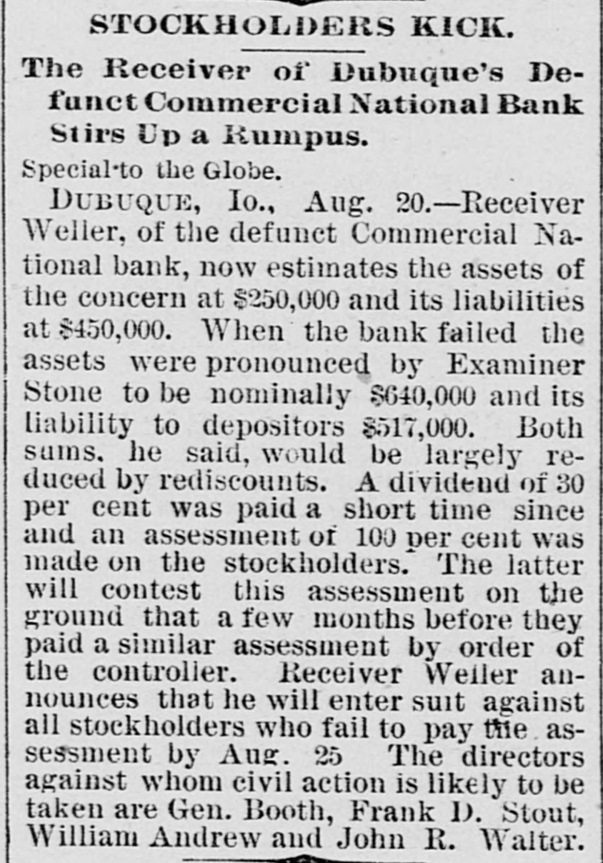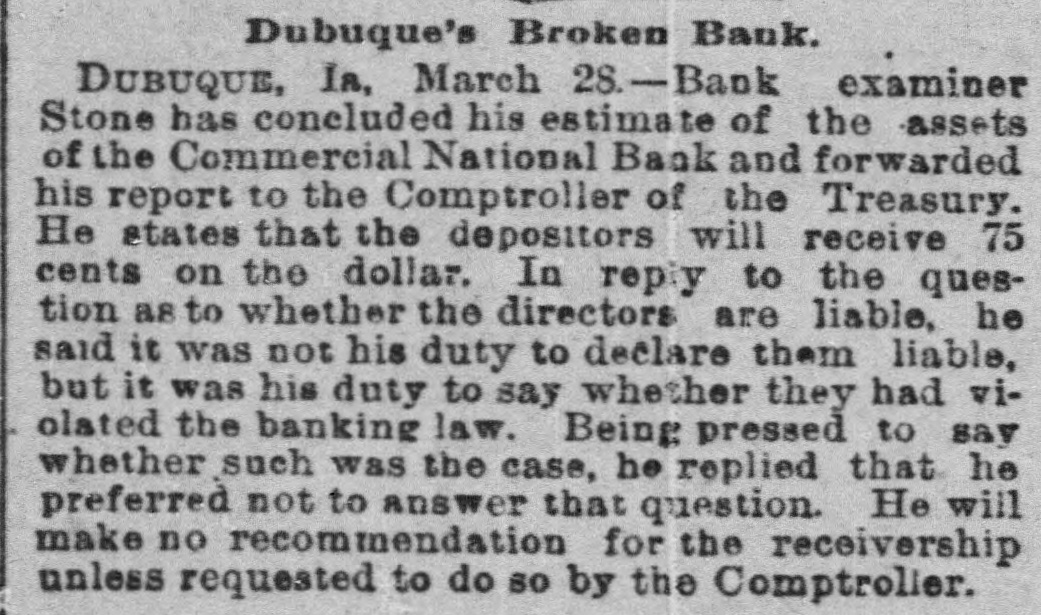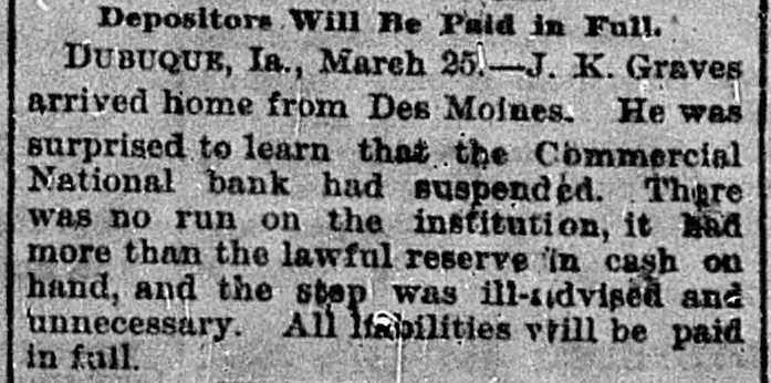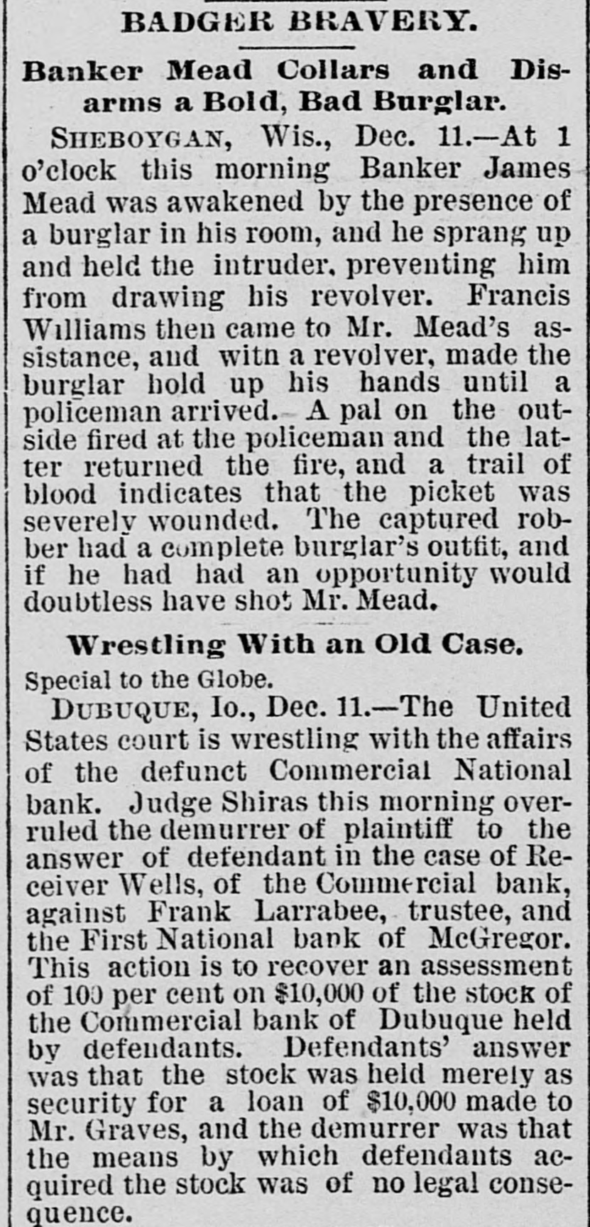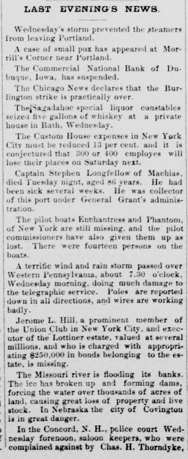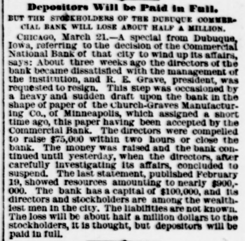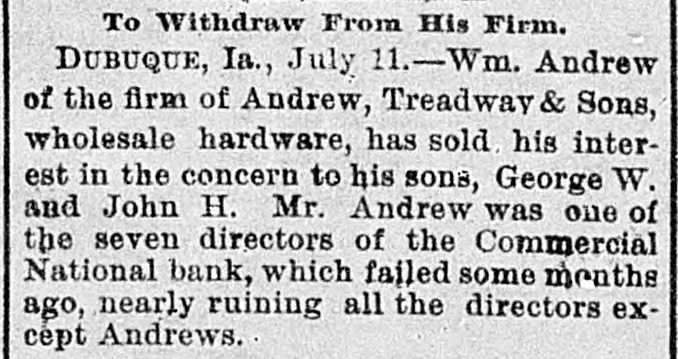At a meeting of farmers held at Sac City, a resolution was adopted recommending the farmers of the country to harvest their grain without the use of binding twine, unless the same can be purchashed for 14 cents per thousand. The saloon in Council Bluffs known by the startling but appropriate name of the "Bucket of Blood Saloon," has been closed by order of the mayor. It is the place where DeGood was foully murdered on the afternoon of March 5. The farmers of Dubuque county, as well as those of the entire northwest, are preparing to enter a vigorous protest against the action of the binder twine trust, which combination hasadvanced the price of twine to a high figure. Judge Fairall, in the district court at Iowa City, fined two saloonkeepers $300 each, and stated that another would be fined $500 if brought before him. In two cases the defendants not being present, sentence was deferred until Friday. A man named E. B. Warren, aged twenty-four, was knocked off a trestle bridge on the Wabash road, about two miles south of Ottumwa, and was quite seriously hurt, having some four or five ribs broken and his back badly bruised. He may get well. John Kramer, a wealthy Germar farmer residing near Dows, committed suicide by taking strychnine. Domestie-trouble is said to have been the cause for the rash act. Mr. Kramer was about forty years of age. He leaves a wife, but no children. Suits were commenced in the United States Court at Dubuque, by E. P. Wells, receiver for the Commercial National Bank, against the Iowa Iron Works, J. H. Graves, Luin H. Graves and Lucy Graves, for the recovery of $187,000, money loaned by the bank. Horace Gage, a wealthy citizen of Nora Springs, has sued the Advertiser of that place for $10,000 libel for publishing a contributed article accusing him of reflecting upon foreigners as office holders at a recent town caucus. The case will come up for hearing in April. The fact has been settled that King and Murphy, the two men arrested at Sioux City a few days ago charged with blowing open the safe in the South Sioux City bank, are the right men. Two accomplices have also been arrested and are in jail at Dakota City, Nebraska. The last act of Judge Hendman in closing the term of the District Court at Webster City was the sentence o Basket, who was convicted of murder in the second degree, in killing the showman at that place last summer The sentence was fifteen years in the penitentiary at Ft. Madison. William Reeseberg, whose home is near Dayton, Iowa, had been working for Fred Kreider of Missouri Valley He had been in the west end of the yards, when an eastbound Chicago & Northwestern freight train came in. He attempted to board this train and fell under the car, losing his left leg just below the knee and a portion of his right foot. J. H. Powers, a lawyer at New Hampton, has been foremost in the prosecution of liquor cases. He has at different times received threatening letters, but it was passed by as a bluff. A few nights ago however, his large barn aed contents were destroyEd by an incendiary fire. Some twenty head of live stock perished. Insurance, $500; total loss, $4,000. The farmers of northeastern Iowa are organizing a boycott against the Binder Twine Trust. This action of Iowa farmers is extending over other States. G. A. Wilcox, the head of the great twine factory at Cleveland, is getting uneasy, and denies the existence of such a trust, but says there was something of the kind until last year, when it fell to pieces. Dr. Brown, coroner, held an inquest at Schaller on the body of D. S. Shull, who died from the effects of carbolic acid, which he mistook for alcohol. He purchased from the druggist in Schaller a half pint of alcohol, as he supposed, but he took home a hali pint of carbolic acid and died after taking a dose of it. Mr. Shull had been an invalid for years, and a hard drinker. He lived about ten miles northwest of Early. Francis V. De Griselli died at Storm Lake on Sunday March 3d and was buried at Centralia De Griselli was