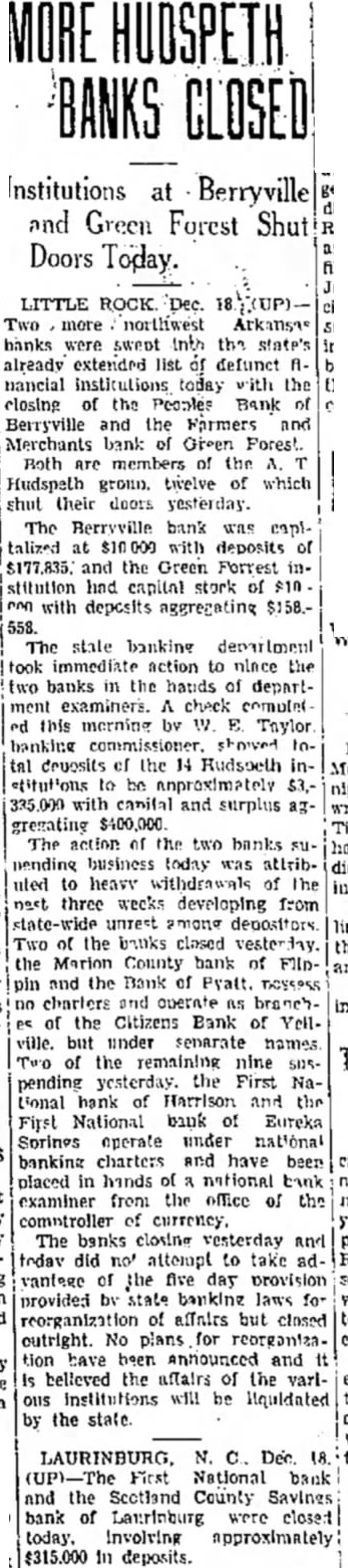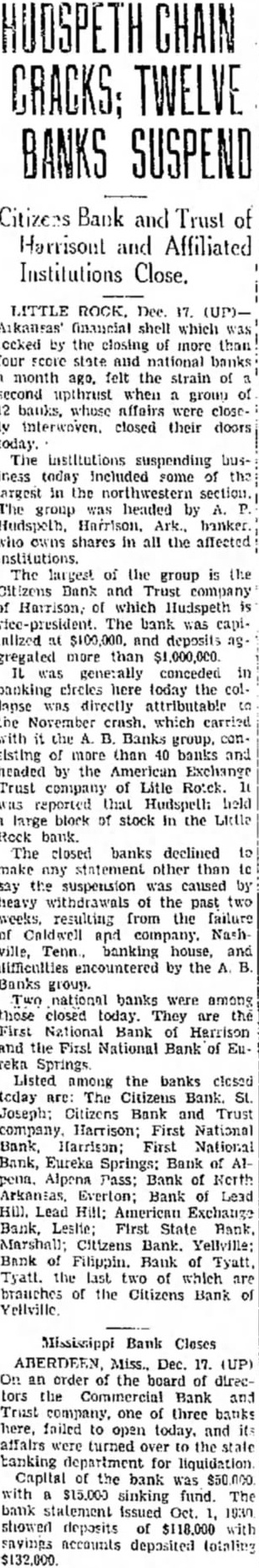 TWELVE Bank and Trust of Harrisont and Affiliated Institutions Close. LITTLE Dec. iccked by the closing of more than four score state and national banks month ago. felt the strain of second upthrust when group banks, whose affairs were closeinterwoven. closed their doors today. The institutions suspending iness today included some of largest in the northwestern section. The group was headed by owns shares in all the affected institutions. The of the group is the Citizens Bank and Trust company Harrison, of which Hudspeth rice-president. The bank was capiInlized at $100,000. and deposits gregated more than $1,000,000 was generally conceded in banking circles here today the collapse was directly attributable the November crash. which carried the Banks group, consisting of more than 40 banks and headed by the American Exchange Trust company of Litle Rotck. reported that Hudspell: held large block of stock In the Little Rock bank. The closed banks declined make any statement other than say the suspension caused by heavy withdrawals of the past two weeks. resulting from the failure Caldwell and company. Nashville, banking house, and difficulties encountered by the Banks group. Two national banks were among those closed today. They the First National Bank of Harrison and the First National Bank of reka Listed among the banks closed today The Citizens St. Joseph: Citizens Bank and Trust company. Harrison; First National Bank, First National Bank, Eureka Springs: Bank of A1Alpena Pass: Bank of North Arkantas, Everton: Bank of Lead Hill. Lead Hill: American Exchange Bank, First State Marshall: Citizens Bank. Yellville: Bank Filippin. Bank of Tyatt. the last two of which are brauches of the Citizens Bank Mississippi Bank Closes ABERDEEN Miss.. Dec. 17. (UP) On an order of the board of directors the Commercial Bank and Trust company. one of three banks here, failed to open today. and affairs were turned over to the state tanking for liquidation Capital of the bank was with $15,000 sinking fund. The bank statement Issued 1930 showed deposits of $118,000 with savings accounts deposited totaling