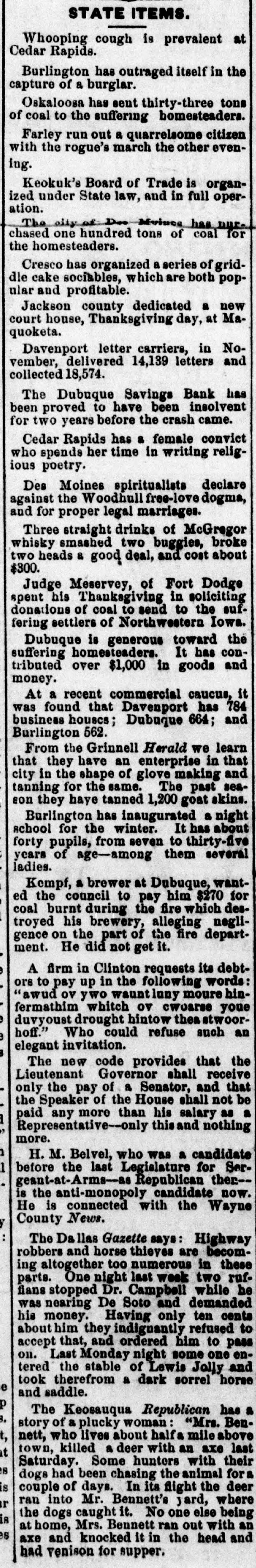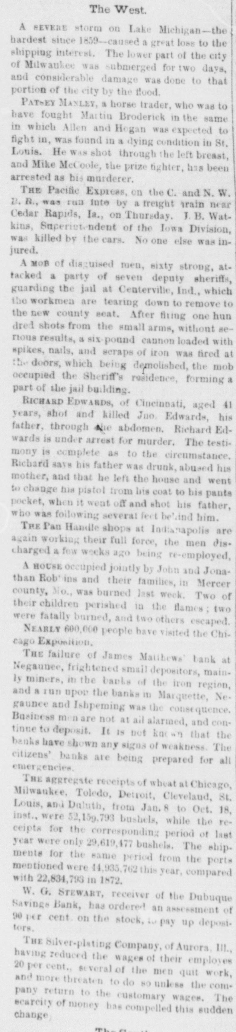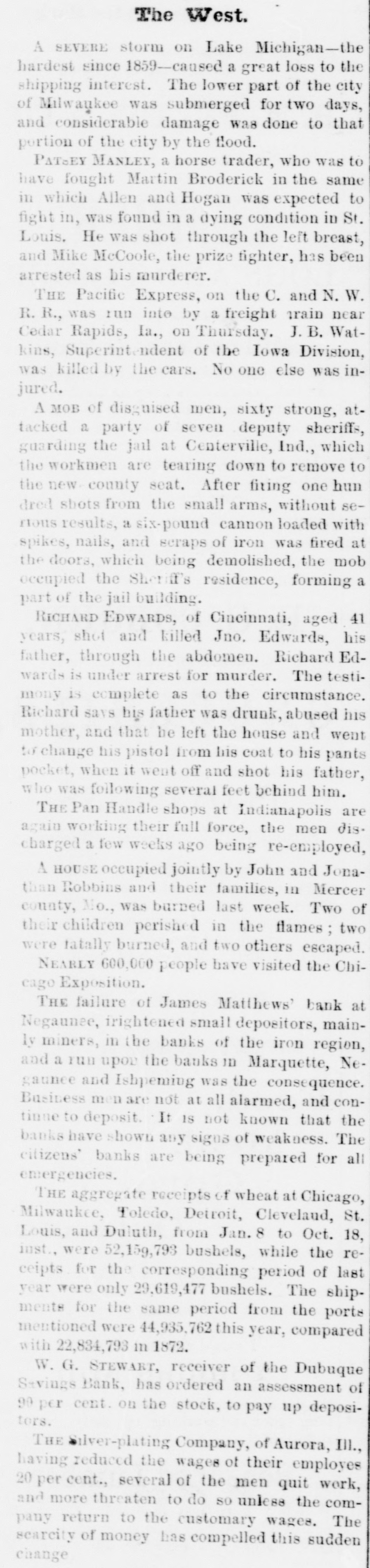 The West. A BEVERE storm on Lake Michigan-the hardest sitice 1859 caused a great loss to the shipping interest. The lower part of the city of Milwaukee was submerged for two days, and considerable damage was done to that portion of the city by the flood. PATSEY MANLEY, a horse trader, who was to have fought Martin Broderick in the same in which Allen and Hogan was expected to fight in, was found in a dying condition in St. Louis, He Was shot through the left breast, and Mike McCoole, the prize tighter, has been arrested as his murderer. THE Pacific Express, on the C. and N. W. R., was run into by a freight grain near Cedar Rapids, Ia., on Thursday. J.B. Watkins, Superiotendent of the Iowa Division, was killed by the cars. No one else was injured. A MOB of disguised men, eixty strong, attacked a party of seven deputy sheriffs, guarding the jail at Centerville, Ind., which the workmen are tearing down to remove to the new county seat. After fiving one hun dred shots from the small arms, without serious results, a six-pound cannon loaded with spikes, nails, and scraps of iron was fired at the doors, which being demolished, the mob occupied the Sheriff's residence, forming a part of the jail building. RICHARD EDWARDS, of Cincinnati, aged 41 years, shot and killed Juo. Edwards, his father, through the abdomen. Richard Edwards is under arrest for murder. The testimony is complete as to the circumstance, Richard says his father was drunk, abused his mother, and that he left the house and went to change his pistol from his coat to his pants pocket, when it went off and shot his father, who was following several feet be! and him. THE Pan Handle shops at Indianapolis are again working their full force, the men dis. charged a few weeks ago being re-employed, A HOUSE occupied jointly by John and Jonathan Rob' ins and their families, in Mercer county, Mo., was burned last week. Two of their children perished in the flames: two were fatally burned, and two others escaped. NEARLY 600,000 people have visited the Chicago Exposition, THE failure of James Matthews' bank at Negaunee, frightened small depositors, mainly miners, in the banks of the iron region, and a run upon the banks in Marquette, Ne. gaunee and Ishpeming was the consequence. Business men are not at all alarmed, and continue to deposit. It IS not kno an that the banks have shown any signa of weakness The citizens' banks are being prepared for all emergencies. THE aggregate receipts of wheat at Chicago, Milwankee, Toledo, Detroit, Clevelaud, St. Louis, and Daluth, from Jan. to Oct. 18, inst., were 52,159,793 bushels, while the receipts for the corresponding period of last year were only 29,619,477 bushels. The ship. ments for the same period from the ports mentioned were 44,935,762 this year, compared with 22,834,793 in 1872. W. G. STEWART, receiver of the Dubuque Savings Bank, has ordered an assessment of 90 per cent on the stock, to pay up depositors. THE Silver-plating Company, of Aurora III., having reduced the wages of their employes 20 per cent., several of the men quit work, and more threaten to do so unless the company return to the customary wages. The scarcity of money has compelled this sudden change The C1