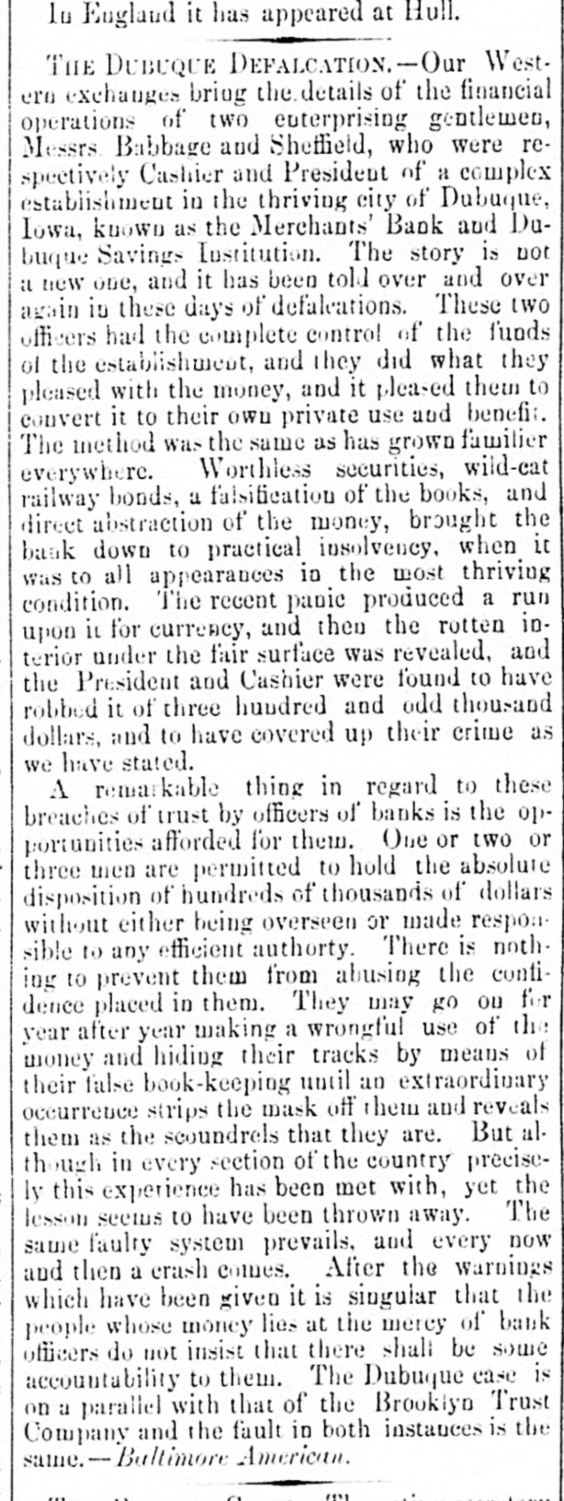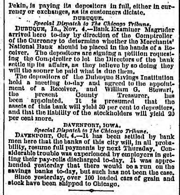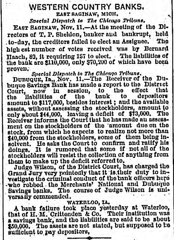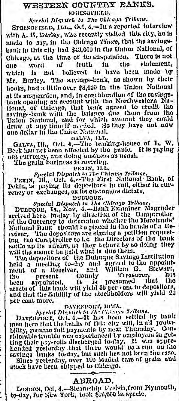 The West. A BEVERE storm on Lake Michigan-the hardest sitice 1859 caused a great loss to the shipping interest. The lower part of the city of Milwaukee was submerged for two days, and considerable damage was done to that portion of the city by the flood. PATSEY MANLEY, a horse trader, who was to have fought Martin Broderick in the same in which Allen and Hogan was expected to fight in, was found in a dying condition in St. Louis, He Was shot through the left breast, and Mike McCoole, the prize tighter, has been arrested as his murderer. THE Pacific Express, on the C. and N. W. R., was run into by a freight grain near Cedar Rapids, Ia., on Thursday. J.B. Watkins, Superiotendent of the Iowa Division, was killed by the cars. No one else was injured. A MOB of disguised men, eixty strong, attacked a party of seven deputy sheriffs, guarding the jail at Centerville, Ind., which the workmen are tearing down to remove to the new county seat. After fiving one hun dred shots from the small arms, without serious results, a six-pound cannon loaded with spikes, nails, and scraps of iron was fired at the doors, which being demolished, the mob occupied the Sheriff's residence, forming a part of the jail building. RICHARD EDWARDS, of Cincinnati, aged 41 years, shot and killed Juo. Edwards, his father, through the abdomen. Richard Edwards is under arrest for murder. The testimony is complete as to the circumstance, Richard says his father was drunk, abused his mother, and that he left the house and went to change his pistol from his coat to his pants pocket, when it went off and shot his father, who was following several feet be! and him. THE Pan Handle shops at Indianapolis are again working their full force, the men dis. charged a few weeks ago being re-employed, A HOUSE occupied jointly by John and Jonathan Rob' ins and their families, in Mercer county, Mo., was burned last week. Two of their children perished in the flames: two were fatally burned, and two others escaped. NEARLY 600,000 people have visited the Chicago Exposition, THE failure of James Matthews' bank at Negaunee, frightened small depositors, mainly miners, in the banks of the iron region, and a run upon the banks in Marquette, Ne. gaunee and Ishpeming was the consequence. Business men are not at all alarmed, and continue to deposit. It IS not kno an that the banks have shown any signa of weakness The citizens' banks are being prepared for all emergencies. THE aggregate receipts of wheat at Chicago, Milwankee, Toledo, Detroit, Clevelaud, St. Louis, and Daluth, from Jan. to Oct. 18, inst., were 52,159,793 bushels, while the receipts for the corresponding period of last year were only 29,619,477 bushels. The ship. ments for the same period from the ports mentioned were 44,935,762 this year, compared with 22,834,793 in 1872. W. G. STEWART, receiver of the Dubuque Savings Bank, has ordered an assessment of 90 per cent on the stock, to pay up depositors. THE Silver-plating Company, of Aurora III., having reduced the wages of their employes 20 per cent., several of the men quit work, and more threaten to do so unless the company return to the customary wages. The scarcity of money has compelled this sudden change The C1