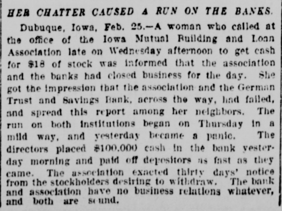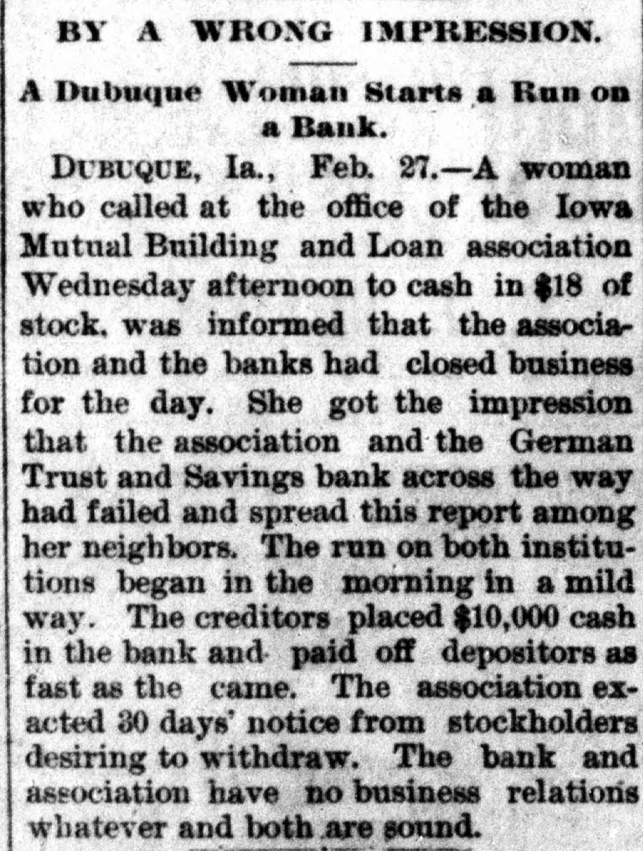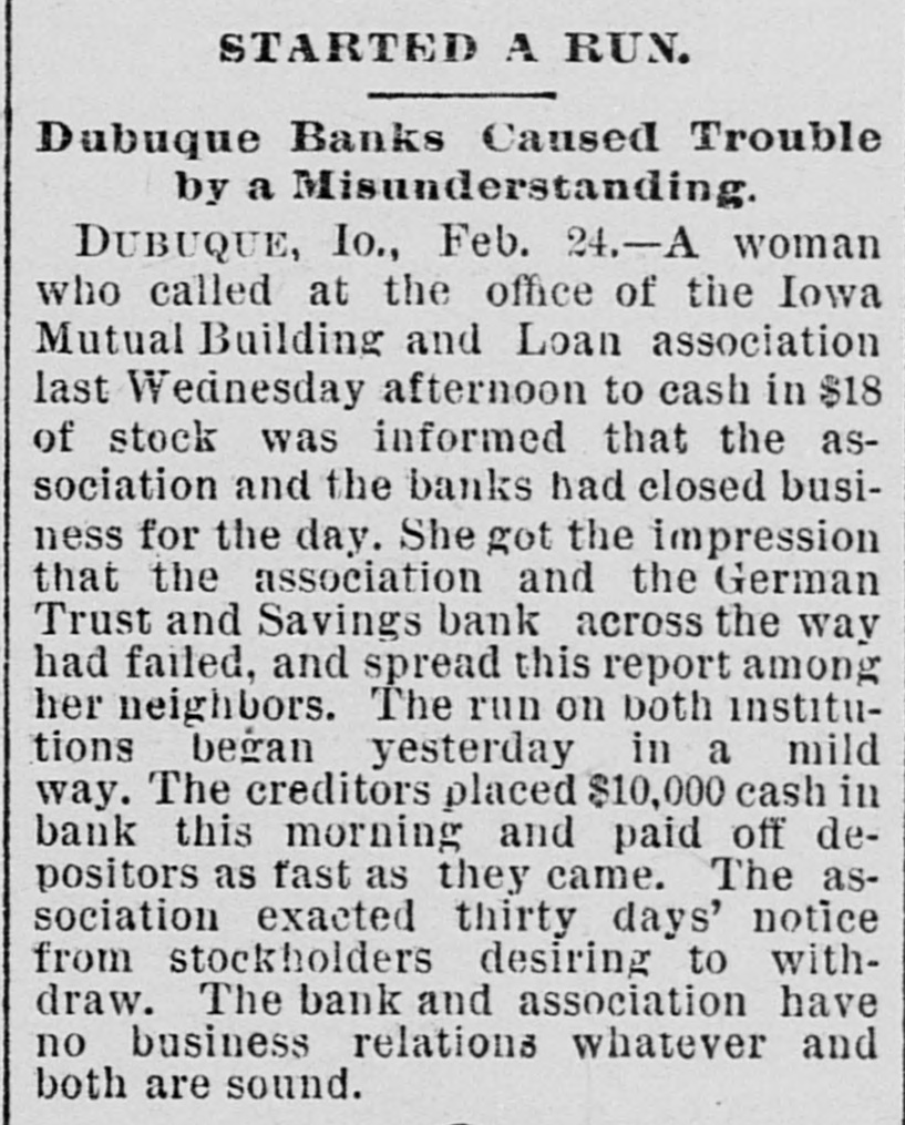 STARTED A RUN. Dabuque Banks Caused Trouble by a Misunderstanding DUBUQUE, Io., Feb. 24.-A woman who called at the office of the Iowa Mutual Building and Loan association last Wednesday afternoon to cash in $18 of stock was informed that the association and the banks had closed business for the day. She got the impression that the association and the German Trust and Savings bank across the way had failed, and spread this report among her neighbors. The run on both institutions began yesterday in a mild way. The creditors placed $10,000 cash in bank this morning and paid off depositors as fast as they came. The association exacted thirty days' notice from stockholders desiring to withdraw. The bank and association have no business relations whatever and both are sound.