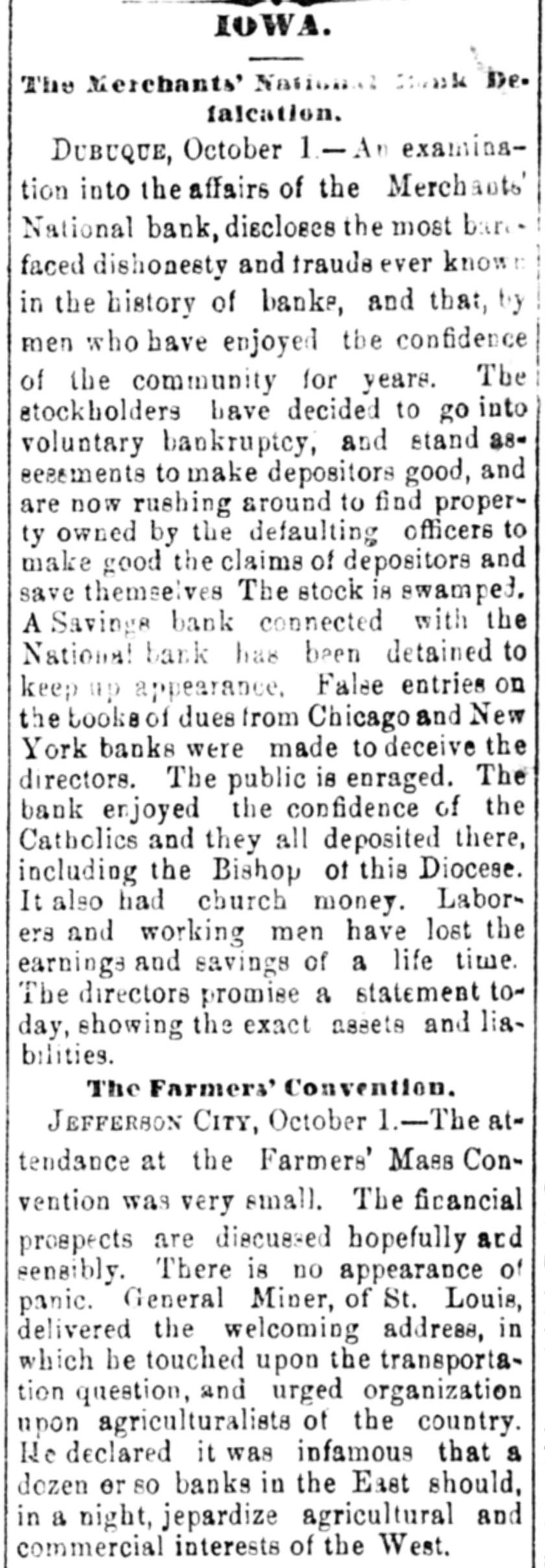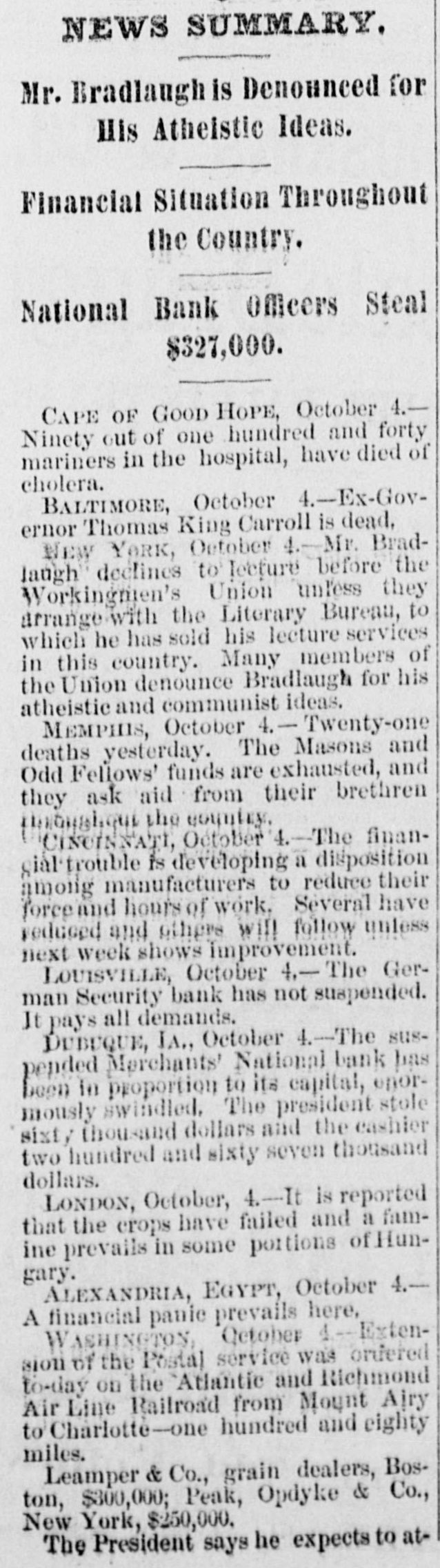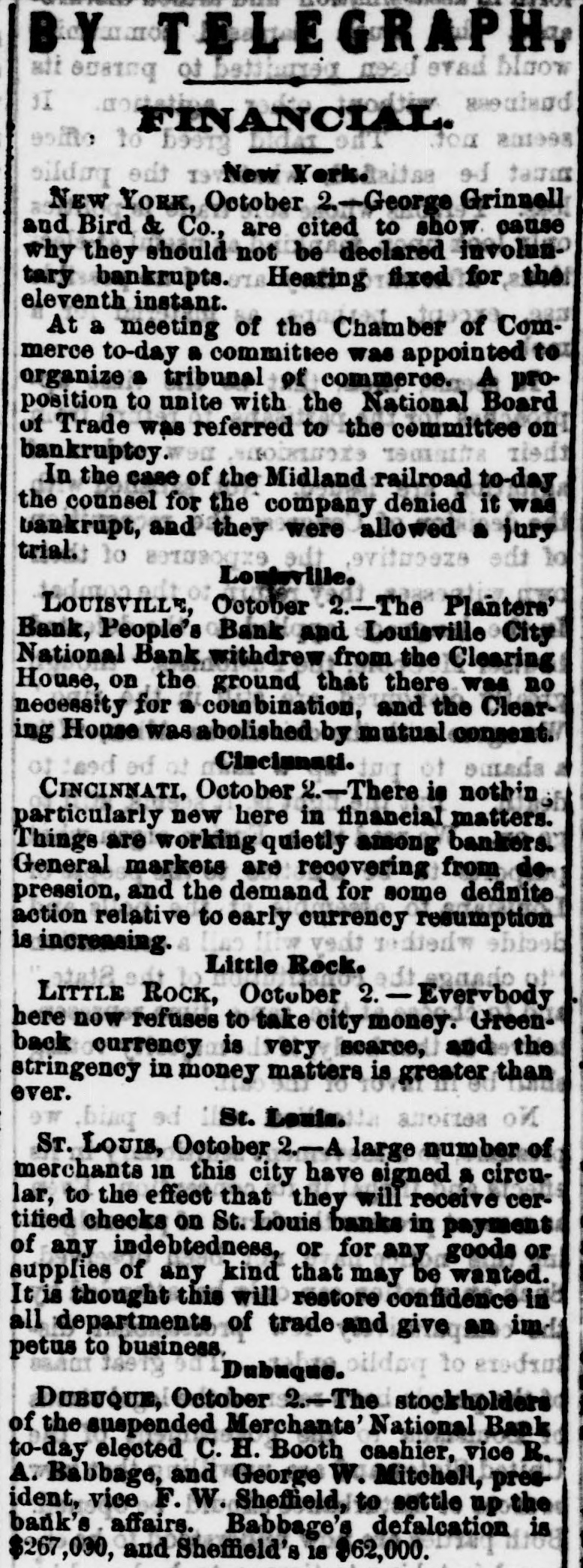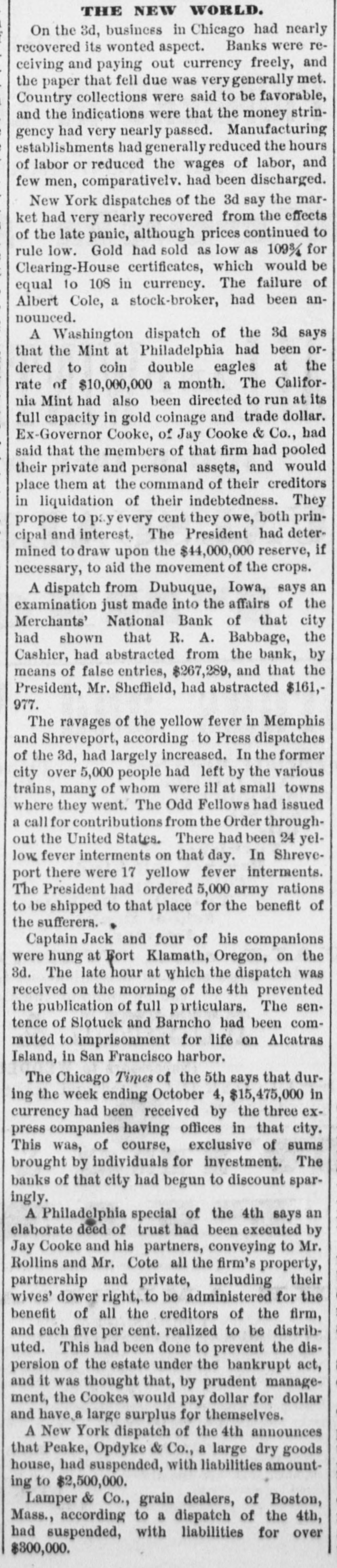 A dispatch from Dubuque, Iowa, says an examination just made into the affairs of the Merchants' National Bank of that city had shown that R. A. Babbage, the Cashier, had abstracted from the bank, by means of false entries, $267,289, and that the President, Mr. Sheffield, had abstracted $161, 977. The ravages of the yellow fever in Memphis and Shreveport, according to Press dispatches of the 3d, had largely increased. In the former city over 5,000 people had left by of whom were ill at trains, many small the various towns where they went. The Odd Fellows had issued a call for contributions from the Order throughout the United States. There had been 24 yellow fever interments on that day. In Shreveport there were 17 yellow fever interments. The President had ordered 5,000 army rations to be shipped to that place for the benefit of the sufferers. Captain Jack and four of his companions were hung at Fort Klamath, Oregon, on the 3d. The late hour at which the dispatch was received on the morning of the 4th prevented the publication of full particulars. The sentence of Slotuck and Barncho had been commuted to imprisonment for life on Alcatras Island, in San Francisco harbor. The Chicago Times of the 5th says that during the week ending October 4, $15,475,000 in currency had been received by the three express companies having offices in that city. This was, of course, exclusive of sums brought by individuals for investment. The banks of that city had begun to discount sparingly. A Philadelphia special of the 4th says an elaborate deed of trust had been executed by Jay Cooke and his partners, conveying to Mr. Rollins and Mr. Cote all the firm's property, partnership and private, including their the wives' dower right, to be administered for benefit of all the creditors of the firm, and each five per cent. realized to be distributed. This had been done to prevent the disof the estate under the bankrupt act, it was that, by the Cookes would pay and persion ment, thought prudent dollar for manage- dollar and have a large surplus for themselves. A New York dispatch of the 4th announces that Peake, Opdyke & Co., a large dry goods house, had suspended, with liabilities amounting to $2,500,000. Lamper & Co., grain dealers, of Boston, Mass., according to a dispatch of the 4th, had suspended, with liabilities for over $300,000. A Washington telegram of the 4th says that absolute quiet prevailed with regard to the financial situation. A Dubuque (Iowa) dispatch of the 4th says the feeling against the defaulting cashier, Babbage, had become very bitter. The authorities had keen compelled to guard his house with a band of policemen to prevent acts of violence from an outraged community. The virulence of the yellow-fever epidemic at Memphis, according to a telegram of the 4th, had largely increased. Hundreds of the poorer classes were dying uncared for and dying for want of attention. The interments on that day in the potter's field alone, had as reported by the county undertaker, reached thirty in number. The whole number of yellow-fever deaths for the day exceeded forty. This included only paupers and those for whom coffins had been obtained at the undertakers'. A New York dispatch of the 4th says that the arrival of the Polaris survivors in that city, on the steamship City of Antwerp, on that day, had been signalized by the arrest of Capt. Buddington and his confinement in the Navy Yard. Later the Tallapoosa left for Washing ton with them. A New Orleans dispatch of the 5th says the New Orleans National Bank had gone into liquidation. The house of Cavoroc had failed. A New York correspondent, writing from Dundee, Scotland, recently, has reiterated the story of the poisoning of Captain Hall, of the Polaris, and indicated Professor Bessels, of the expedition, as the person who the deed. In arthe facts in the case, committed rive at order to the Secretary of the Navy, according to the dispatch of the 6th, had instituted another examination of the survivors. York dispatch of the 6th announces that the balloon, A New "Graphic" being the Prof. old affair revamped and rejuvenated, with Donaldson and his associates, had started for Europe on the morning of that day. The ascension was an excellent one. Mr. Donaldson was accompanied by Messrs. Lunt and The balloon rose and the Ford. starting-point, floated when rapidly last majesti- from seen cally towards the ocean, and was moving towards Europe. Later, a dispatch had been received:from New Haven, stating that the balloon had reached Canaan, in the northeast corner of the State of Connecticut, in a at when it had been caught Donaldso allowed gas storm. 1:25 p. m., enough the of the to escape to enable them to bring gas-bag near the earth, when they all leaped out, and the balloon escaped. Hearte Nature