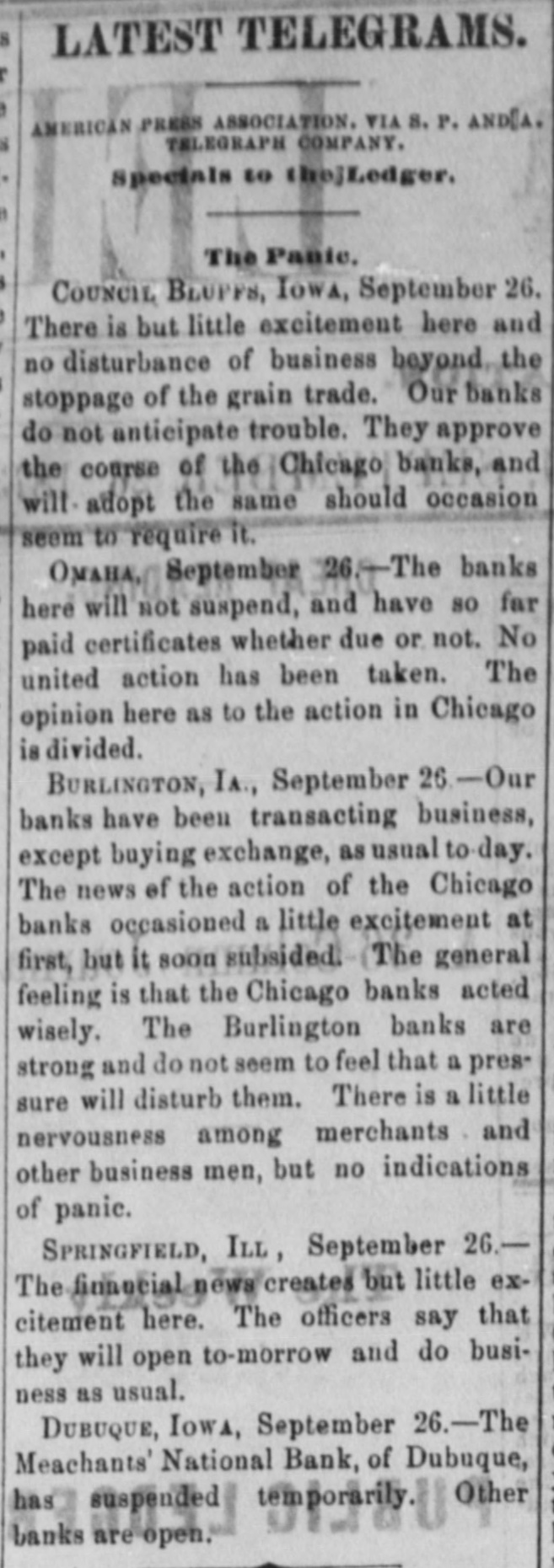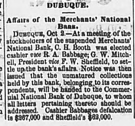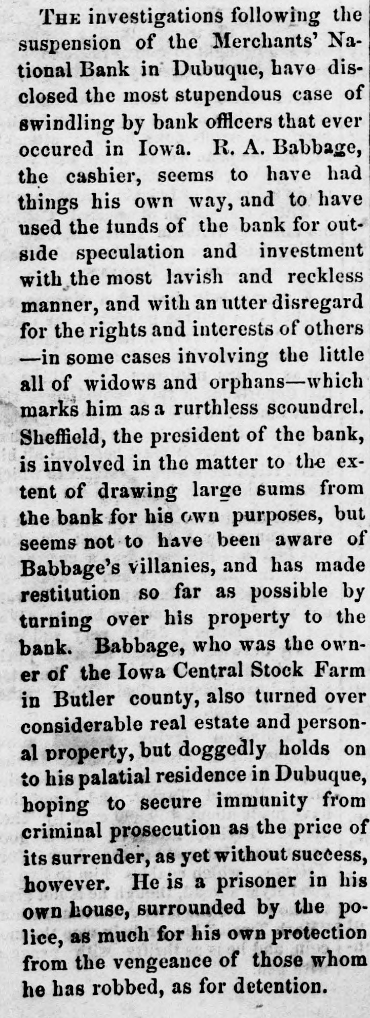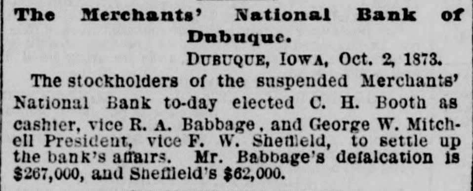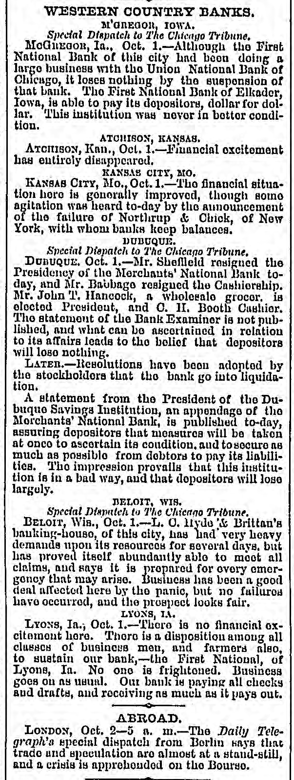 A dispatch from Dubuque, Iowa, says an examination just made into the affairs of the Merchants' National Bank of that city had shown that R. A. Babbage, the Cashier, had abstracted from the bank, by means of false entries, $267,289, and that the President, Mr. Sheffield, had abstracted $161, 977. The ravages of the yellow fever in Memphis and Shreveport, according to Press dispatches of the 3d, had largely increased. In the former city over 5,000 people had left by of whom were ill at trains, many small the various towns where they went. The Odd Fellows had issued a call for contributions from the Order throughout the United States. There had been 24 yellow fever interments on that day. In Shreveport there were 17 yellow fever interments. The President had ordered 5,000 army rations to be shipped to that place for the benefit of the sufferers. Captain Jack and four of his companions were hung at Fort Klamath, Oregon, on the 3d. The late hour at which the dispatch was received on the morning of the 4th prevented the publication of full particulars. The sentence of Slotuck and Barncho had been commuted to imprisonment for life on Alcatras Island, in San Francisco harbor. The Chicago Times of the 5th says that during the week ending October 4, $15,475,000 in currency had been received by the three express companies having offices in that city. This was, of course, exclusive of sums brought by individuals for investment. The banks of that city had begun to discount sparingly. A Philadelphia special of the 4th says an elaborate deed of trust had been executed by Jay Cooke and his partners, conveying to Mr. Rollins and Mr. Cote all the firm's property, partnership and private, including their the wives' dower right, to be administered for benefit of all the creditors of the firm, and each five per cent. realized to be distributed. This had been done to prevent the disof the estate under the bankrupt act, it was that, by the Cookes would pay and persion ment, thought prudent dollar for manage- dollar and have a large surplus for themselves. A New York dispatch of the 4th announces that Peake, Opdyke & Co., a large dry goods house, had suspended, with liabilities amounting to $2,500,000. Lamper & Co., grain dealers, of Boston, Mass., according to a dispatch of the 4th, had suspended, with liabilities for over $300,000. A Washington telegram of the 4th says that absolute quiet prevailed with regard to the financial situation. A Dubuque (Iowa) dispatch of the 4th says the feeling against the defaulting cashier, Babbage, had become very bitter. The authorities had keen compelled to guard his house with a band of policemen to prevent acts of violence from an outraged community. The virulence of the yellow-fever epidemic at Memphis, according to a telegram of the 4th, had largely increased. Hundreds of the poorer classes were dying uncared for and dying for want of attention. The interments on that day in the potter's field alone, had as reported by the county undertaker, reached thirty in number. The whole number of yellow-fever deaths for the day exceeded forty. This included only paupers and those for whom coffins had been obtained at the undertakers'. A New York dispatch of the 4th says that the arrival of the Polaris survivors in that city, on the steamship City of Antwerp, on that day, had been signalized by the arrest of Capt. Buddington and his confinement in the Navy Yard. Later the Tallapoosa left for Washing ton with them. A New Orleans dispatch of the 5th says the New Orleans National Bank had gone into liquidation. The house of Cavoroc had failed. A New York correspondent, writing from Dundee, Scotland, recently, has reiterated the story of the poisoning of Captain Hall, of the Polaris, and indicated Professor Bessels, of the expedition, as the person who the deed. In arthe facts in the case, committed rive at order to the Secretary of the Navy, according to the dispatch of the 6th, had instituted another examination of the survivors. York dispatch of the 6th announces that the balloon, A New "Graphic" being the Prof. old affair revamped and rejuvenated, with Donaldson and his associates, had started for Europe on the morning of that day. The ascension was an excellent one. Mr. Donaldson was accompanied by Messrs. Lunt and The balloon rose and the Ford. starting-point, floated when rapidly last majesti- from seen cally towards the ocean, and was moving towards Europe. Later, a dispatch had been received:from New Haven, stating that the balloon had reached Canaan, in the northeast corner of the State of Connecticut, in a at when it had been caught Donaldso allowed gas storm. 1:25 p. m., enough the of the to escape to enable them to bring gas-bag near the earth, when they all leaped out, and the balloon escaped. Hearte Nature