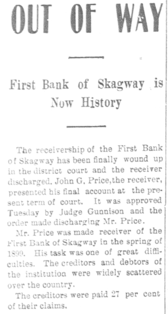 OUT OF WAY First Bank of Skagway is Now History The receivership of the First Bank of Skagway has been finally wound up in the district court and the receiver discharged. John G. Price, the receiver, presented his final account at the present term of court. It was approved Tuesday by Judge Gunnison and the order made discharging Mr. Price. Mr. Price was made receiver of the First Bank of Skagway in the spring of 1899. His task was one of great difficulties. The creditors and debtors of the institution were widely scattered over the country. The creditors were paid 27 per cent of their claims.
