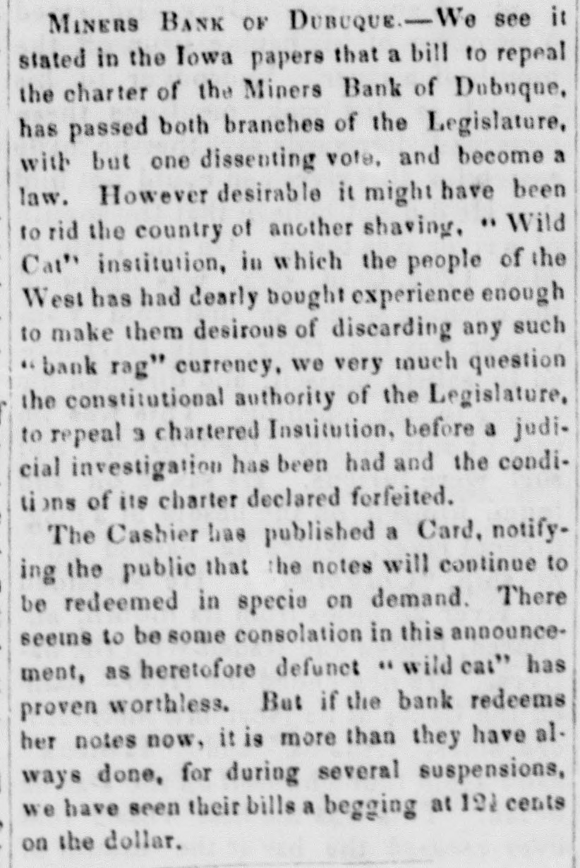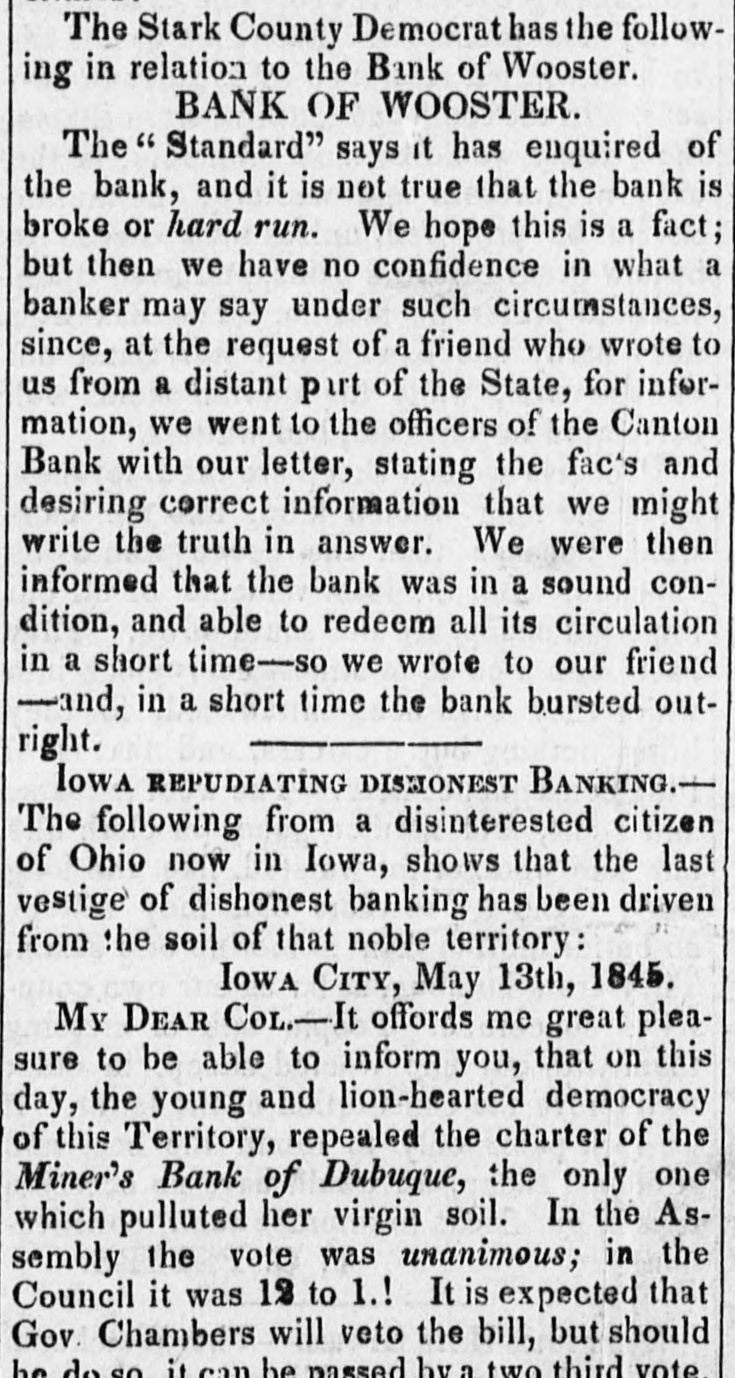 The Stark County Democrat has the following in relation to the Bank of Wooster. BANK OF WOOSTER. The Standard" says it has enquired of the bank, and it is not true that the bank is broke or hard run. We hope this is a fact; but then we have no confidence in what a banker may say under such circumstances, since, at the request of a friend who wrote to us from a distant part of the State, for information, we went to the officers of the Canton Bank with our letter, stating the fac's and desiring correct information that we might write the truth in answer. We were then informed that the bank was in a sound condition, and able to redeem all its circulation in a short time-so we wrote to our friend -and, in a short time the bank bursted outright. lowa REPUDIATING DISMONEST BANKING.-The following from a disinterested citizen of Ohio now in Iowa, shows that the last vestige of dishonest banking has been driven from the soil of that noble territory: IOWA CITY, May 13th, 1845. My DEAR COL.-It offords me great pleasure to be able to inform you, that on this day, the young and lion-hearted democracy of this Territory, repealed the charter of the Miner's Bank of Dubuque, the only one which pulluted her virgin soil. In the Assembly the vote was unanimous; in the Council it was 12 to 1.! It is expected that Gov. Chambers will veto the bill, but should he it can be passed hv third vote