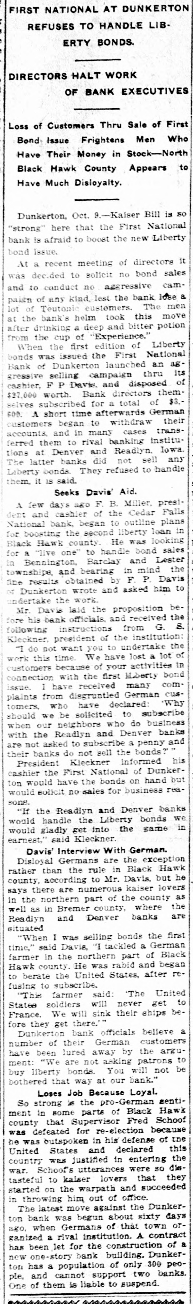 FIRST NATIONAL AT DUNKERTON REFUSES TO HANDLE LIBERTY BONDS. DIRECTORS HALT WORK OF BANK EXECUTIVES Loss of Customers Thru Sale of First Bond Issue Frightens Men Who Have Their Money in Stock-North Black Hawk County Appears to Have Much Disloyalty. Dunkerton, Oct. 9.-Kaiser Bill is so "strong" here that the First National bank is afraid to boost the new Liberty bond Issue. At a recent meeting of directors it was decided to solicit no bond sales and to conduct no aggressive campaign of any kind. lest the bank lose a lot of Teutonic customers. The men at the bank's helm took this move after drinking a deep and bitter potion from the cup of "Experience." When the first edition of Liberty bonds was issued the First National Bank of Dunkerton launched an ag. gressive selling campaign thru its cashier, F P Davis, and disposed of $27,000 worth. Bank directors themselves subscribed for a total of $3.600. A short time afterwards German customers began to withdraw their accounts, and in many cases transferred them to rival banking institutions at Denver and Readlyn. lowa. The latter banks did not sell any Liberty bonds They refused to handle them. it IS said. Seeks Davis' Aid. A few days ago F. B. Miller, president and cashier of the Cedar Falls National bank, began to outline plans for boosting the second liberty loan in Black Hawk county. He was looking for a "live one" to handle bond sales in Bennington, Barclay and Lester townships, and bearing in mind the fine results obtained by F. P. Davis of Dunkerton wrote and asked him to undertake the work. Mr. Davis laid the proposition before his bank officials. and received the following instructions from G. S. Kleckner, president of the institution: "I do not want you to undertake the work this time. We have lost a lot of customers because of your activities in connection with the first M.berty bond issue. 1 have received many complaints from disgruntled German customers, who have declared: Why should we be solicited to subscribe when our neighbors who do business with the Readlyn and Denver banks are not asked to subscribe a penny and their banks do not sell the bonds?" President Kleckner informed his cashier the First National of Dunkerton would have the bonds on hand but would solicit no sales for business reasons. "If the Readiyn and Denver banks would handle the Liberty bonds we would gladly get into the game in earnest," said Kleckner. Davis' Interview With German. Disloyal Germans are the exception rather than the rule in Black Hawk county, according to Mr. Davis, but he says there are numerous kaiser lovers in the northern part of the county as well as in Bremer county, where the Readlyn and Denver banks are situated "When I was selling bonds the first time," said Davis, "I tackled a German farmer in the northern part of Black Hawk county. He was rabid and began to berate the United States, after refusing to subscribe. "This farmer said: The United States soldiers will never get to France. We will sink their ships before they get there." Dunkerton bank officials believe a number of their German customers have been lured away by the argument: "We are not asking patrons to buy liberty bonds. You will not be bothered that way at our bank." Loses Job Because Loyal. So strong is the pro-German sentiment in some parts of Black Hawk county that Supervisor Fred Schoof was defeated for re-election because he was outspoken in his defense of the United States and declared this country was justified in entering the war. Schoof's utterances were so dietasteful to kaiser lovers that they started on the warpath and succeeded in throwing him out of office. The latest move against the Dunkerton bank was begun about sixty days azo. when Germans of that town organized a rival institution. A contract has been let for the construction of a new one-story bank building. Dunkerton has a population of only 300 people, and cannot support two banks. One of them is liable to suspend.
