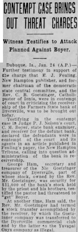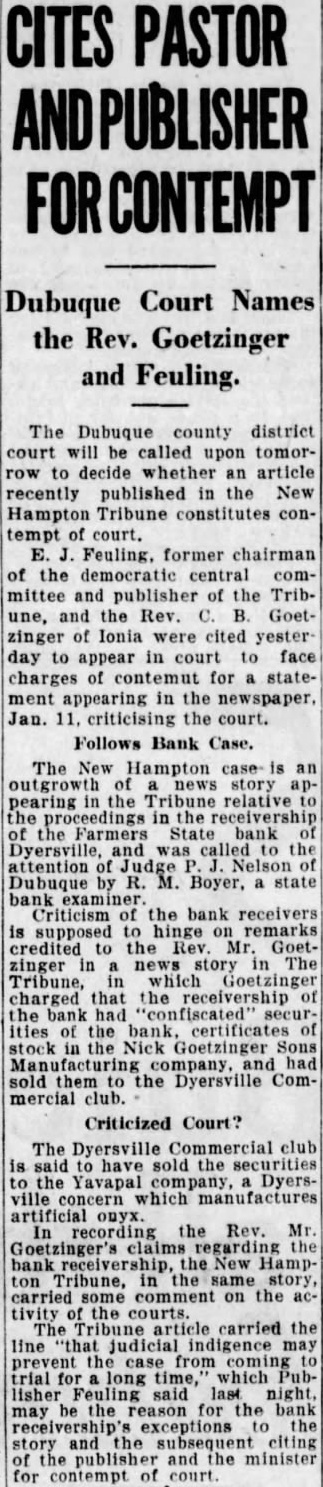 CITES PASTOR AND PUBLISHER FOR CONTEMPT Dubuque Court Names the Rev. Goetzinger and Feuling. The Dubuque county district court will be called upon tomorrow to decide whether an article recently published in the New Hampton Tribune constitutes contempt court. E. Feuling. former chairman of the democratic central committee and publisher of the Tribune, and the Rev. B. Goetzinger Ionia were cited yesterday to appear in court face charges of for statement appearing in the newspaper, Jan. 11, criticising the court. Follows Bank Case. The New Hampton case- is an story apthe Tribune relative the receivership the Farmers State bank Dyersville, and was called to the attention Judge Nelson Dubuque by R. Boyer, state Criticism the bank receivers is supposed to hinge on remarks credited to the Mr. Goetzinger news story in The Tribune, in which Goetzinger charged that the receivership the bank the bank certificates Nick Goetzinger Sons company. and sold them the Dyersville Commercial club. Criticized Court? The Dyersville Commercial club sold the securities the Yavapal company, Dyersville concern which manufactures artificial onyx. recording the Rev. Mr. regarding bank the New Hampton Tribune, in the same story, carried some comment on the activity of the courts. The carried the line "that judicial from trial for long time,' which lisher Feuling said last night, may be the reason for the bank receivership's exceptions to the story and the citing of the publisher and the minister for contempt of court.
