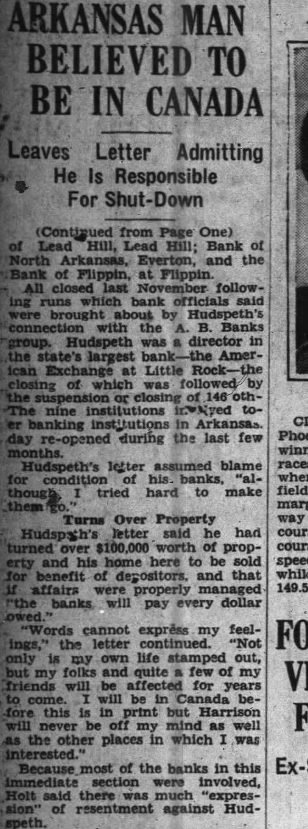 ARKANSAS MAN BELIEVED TO BE IN CANADA Leaves Letter Admitting He Is Responsible For Shut-Down (Continued from Page One) Lead Lead Hill; Bank of North Arkansas, Everton, and the of Flippin, at Flippin. All closed last November followwhich bank officials said brought about by with the B. Banks Hudspeth was director in state's largest AmerLittle closing of which was or nine institutions toinstitutions in Arkansas. day re-opened during the last few Hudspeth's letter assumed blame condition his. "although tried hard to make Turns Over Property Hudspsh's letter said he had over $100,000 worth of propand his home here to be sold benefit of depositors. and that affairs were properly managed banks pay every dollar owed." "Words cannot express my feelthe letter continued. "Not only my own life stamped out, folks and quite few of my friends will be affected for years come. will be in Canada bethis is print but Harrison will never be off my mind as well the other places in which was interested.' Because most of the banks in this immediate section were involved, Holt said there much "expresof resentment against Hudspeth.