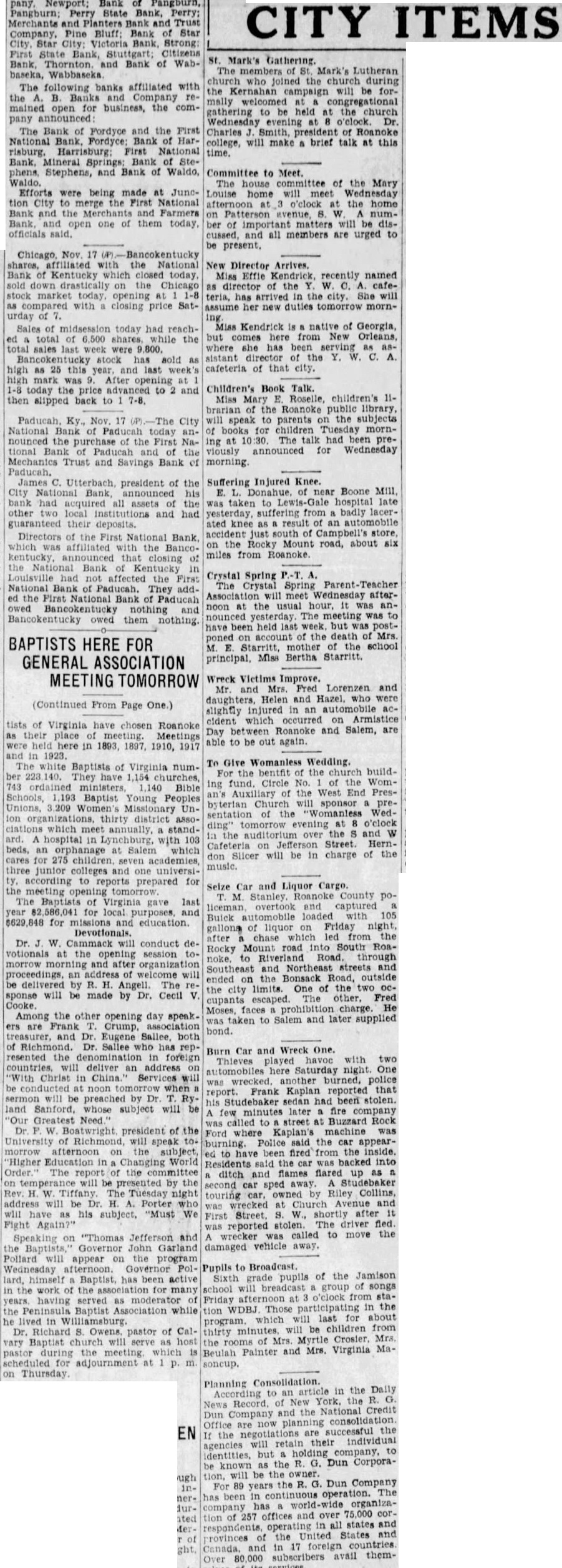 To Give Womanless Wedding. bentfit the church buildFor ing fund. Circle No. the WomAuxiliary of the West End Presbyterian will sponsor the "Womanless Wedsentation evening o'clock tomorrow the over the and Cafeteria Street. Hernwill be in charge of the don music. tists Virginia have chosen Roanoke their in 1897, 1910, 1917 in 1923. The white Baptists of Virginia numThey have 1,154 churches, 743 ministers 1,140 Bible Schools, Baptist Young Peoples Unions, Women's Missionary Undistrict which standhospital with 103 beds, orphanage at Salem which cares 275 children. seven academies, three junior colleges and one universiaccording to reports prepared for Seize and Liquor Cargo. tomorrow Stanley. Roanoke County of Virginia last liceman captured for automobile loaded 105 Buick for missions and education. of liquor on Friday night, gallons after chase from the W. Cammack will conduct opening session Road. through after organization and Northeast and an address welcome will ended the Bonsack Road, outside delivered by Angell. the city limits. One of the two sponse will made by Dr. Cecil other. cupants Cooke. Moses, faces prohibition charge. Among the other opening day speaktaken to Salem and later supplied ers are Frank Crump, bond. Eugene Sallee, both has Burn Car and Wreck One resented the denomination foreign Thleves will deliver an address Saturday night. Christ in Services will police another burned, at noon when that Frank Kaplan reported will be preached by Dr. been stolen. his had land whose subject will few minutes later fire company Greatest called street at Buzzard Rock president of the where Kaplan's machine Ford Richmond, will speak Police the car appearmorrow the ed been fired from the inside. "Higher World was backed into The report the committee ditch flames flared up presented by the sped Studebaker second car Tiffany. Tuesday night owned Riley Collins, touring address will Porter who wrecked at Church Avenue and his subject, "Must We First Street, W., shortly Fight Again?" was reported stolen. The driver fied. called to move the Speaking "Thomas Jefferson and Garland damaged vehicle away. Governor John Pollard will appear the program Pol- Pupils pupils of the Jamison has active Sixth will group songs the the for many school afternoon at o'clock from stahaving served moderator Friday WDBJ Those the the Peninsula Baptist Association while will last for about lived Williamsburg. which thirty program. minutes, will be children Dr. Richard pastor of CalMrs. Baptist will serve rooms of Mrs. vary Mrs. Virginia Mameeting which Beulah Painter and pastor scheduled adjournment at soncup. Thursday