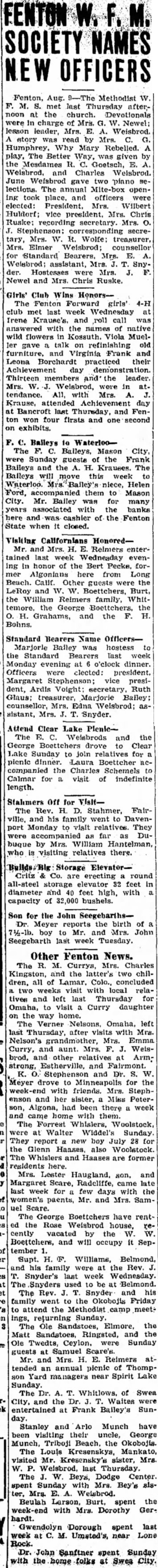 Fenton, Methodist met Thursday noon the church. Devotionals charge of Newel: lesson Mrs. Weisbrod. story was read Mrs. Humphrey. Why Mary Rebelled. play, The Better Way, was given the Mesdames Goetsch, Weisbrod. Charles Weisbrod. June Weisbrod plano lections. annual Mite-box opening took place. and officers were elected: Mrs. Wilbert Huldorf; vice president. Mrs. Chris Ruske: recording secretary. Mrs. Stephenson: secreMrs. R. Wolfe: treasurer, Elmer Weisbrod; counsellor for Standard Bearers, Mrs. E. der. Hostesses Mrs. Newel and Mrs. Chris Ruske.