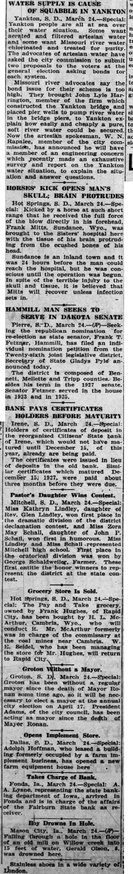 WATER SUPPLY IS CAUSE OF SQUABBLE IN YANKTON Yankton, S. D., March 24.-Special: Yankton people are all at sea over their siuation. Some want aerated and filtered artesian water and some want Missouri river water chlorinated treated for purity. The advocates of artesian water have asked the city commission to submit two proposals the at the election asking bonds for each system. Missouri river advocates say the bond issue for their scheme is too high. They brought John Lyle Harrington, member the firm which constructed the Yankton bridge and placed pier. wells to pump river water in the bridge piers, to Yankton ex plain how easily and cheaply pure, to soft river water could be secured. Now the artesian spokesman, W. N. Rapalee, member of the city commission, has announced he will have member of an engineering concern which recently made an exhaustive survey and report on the Yankton water situation, to explain the situation and answer questions. HORSES' KICK OPENS MAN'S SKULL; BRAIN PROTRUDES Hot Springs, S. D., March cial: Kicked by horse at such short range that he received the full force of the blow directly in his forehead, Frank Mitts. Sundance, Wyo., was brought to the Sisters' hospital here with the tissue of his brain protruding from the crushed bones of his head. Sundance is an inland town and was 24 hours before the man could reach the hospital, but he was conscious until the operation was begun. In spite the terrible injury the skull and tissue, it believed that Mitts will recover unless infection sets in. HAMMILL MAN SEEKS TO SERVE IN DAKOTA SENATE Pierre, S.D., March ing the republican nomination for re-election as state Frank T. Fetzner, Hammill, has filed an individual petition from the Twenty-sixth joint legislative district, Secretary of State Gladys Pyle announced today. The district is composed of Bennett, Mellette and Tripp Besides term in the 1927 senate. Senator Fetzner served in the house in 1923 and in 1925. BANK PAYS CERTIFICATES HOLDERS BEFORE MATURITY Irene, D., March 24.-Special Holders of certificates of deposit in the reorganized Citizens' State bank of Irene, which would not have matured until December 15, of this year, already are being paid. The certificates were issued in lieu of deposits in the old bank. Similar certificates which matured De cember 15, 1927, were paid about three months before they were due. Pastor's Daughter Wins Contest. Mitchell, S. D., March 24.-Special: Miss Kathryn Lindley, daughter of Rev. Glen Lindley, won first place in the dramatic division of the district declamation contest, and Miss Zora May Schall, daughter of John Schall, won first in humorous. Miss Lindley Miss Mitchell high school. First place in the oratorical division was won by Farmer. These first the winners to represent the district at the state contest. Grocery Store Is Sold. Hot Springs, S. D., March 24.-Special: The Pay and Take grocery, owned by Frank Hughes, of Rapid City, has been bought by H. L. McArthur, Cambria, who will conduct it. Mr. McArthur formerly was in charge of the commissary at the coal mines near Cambria. W E. Seidel, who has been managing the store for Mr. Hughes, will return to Rapid City. Groton Without Mayor. Groton. S. D, March Groton has been without regular mayor since the death of Mayor Ronan some time ago, so it will be necessary elect a mayor at the annual city April 17. President Adams, of the city council, has been acting mayor since the death of Mayor Ronan. Opens Implement Store. Dallas, D., March Adolph Hoffman, who leased building formerly occupied by farm implement has opened new farm equipment house here Takes Charge of Bank. Fonda, March -Special: A. A. Lysne, representing the state bank. ing department of Iowa, arrived in Fonda is charge of affairs the Fairburn State bank as re- Boy Drowns In Hole. Mason City, Ia., March Falling through hole in the floor an old mill on Willow into 15 feet water, Gerald Olson, was drowned here. Stainless shoes in wide variety London.