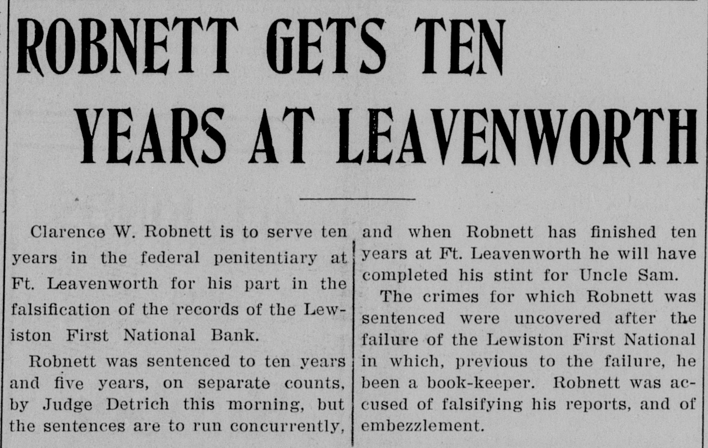 # ROBNETT GETS TEN # YEARS AT LEAVENWORTH Clarence W. Robnett is to serve ten years in the federal penitentiary at Ft. Leavenworth for his part in the falsification of the records of the Lewiston First National Bank. Robnett was sentenced to ten years and five years, on separate counts, by Judge Detrich this morning, but the sentences are to run concurrently, and when Robnett has finished ten years at Ft. Leavenworth he will have completed his stint for Uncle Sam. The crimes for which Robnett was sentenced were uncovered after the failure of the Lewiston First National in which, previous to the failure, he been a book-keeper. Robnett was accused of falsifying his reports, and of embezzlement.