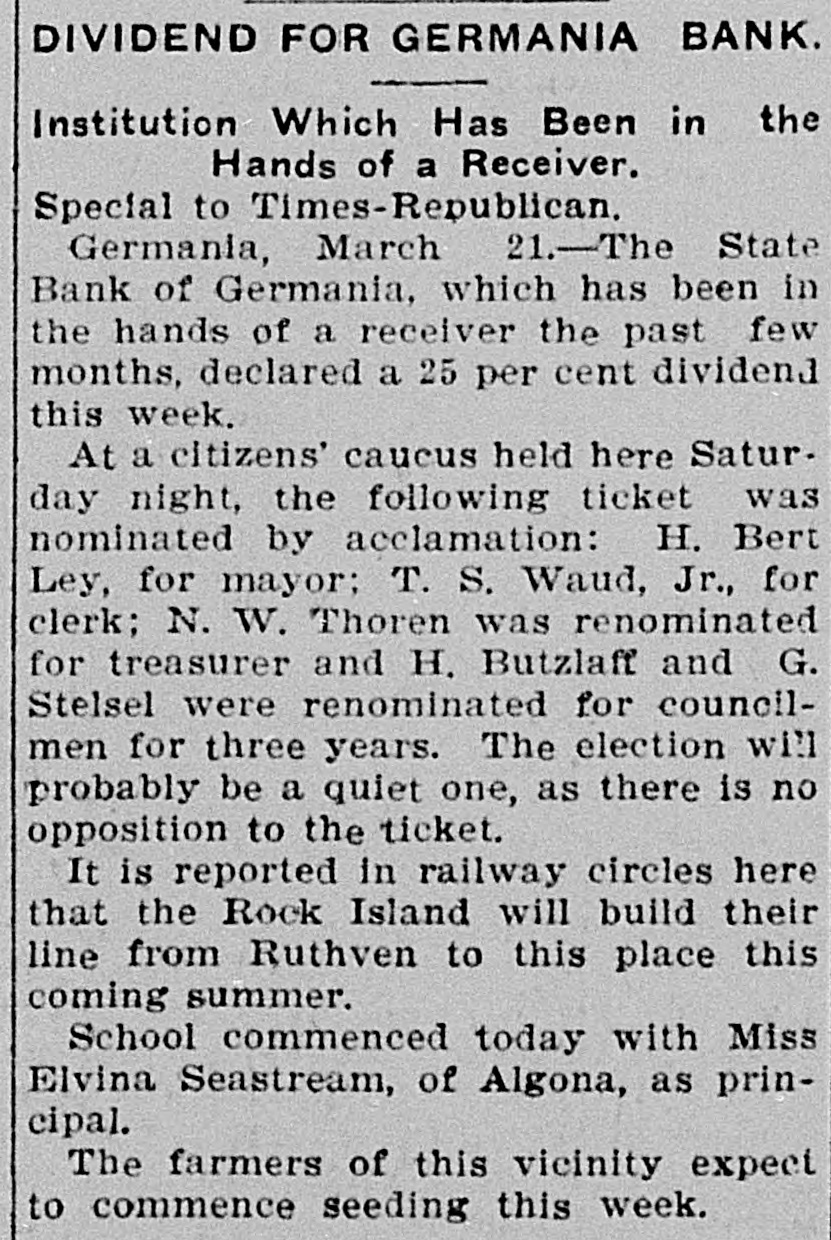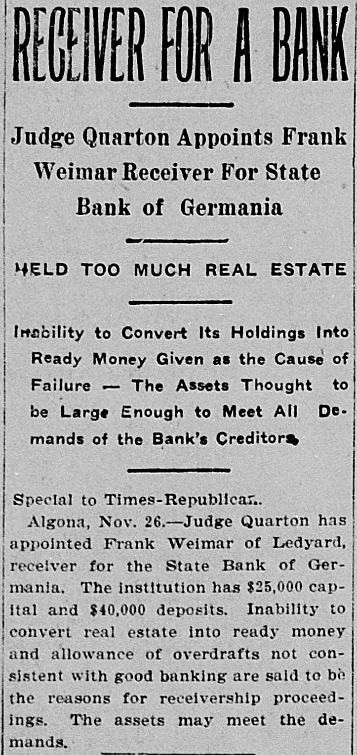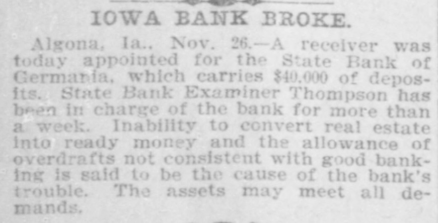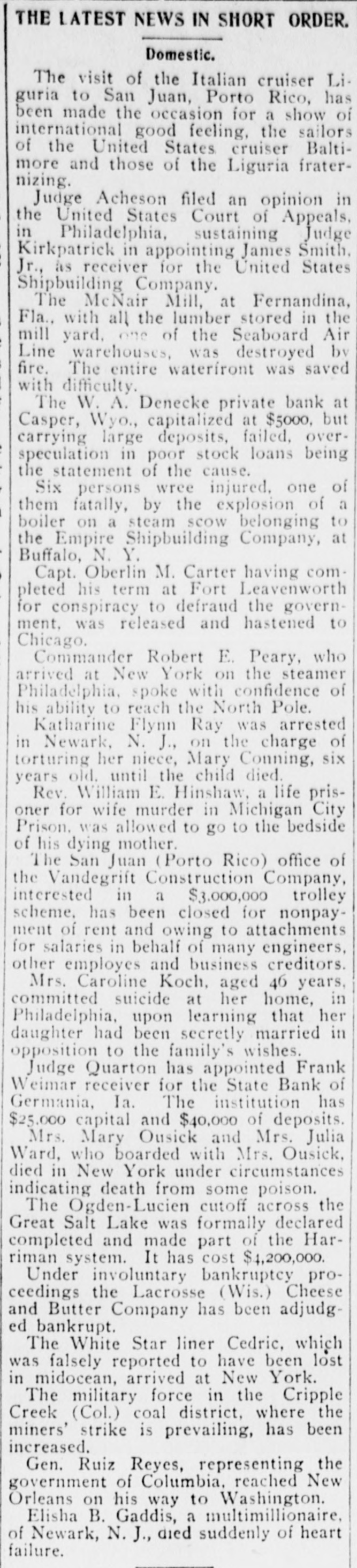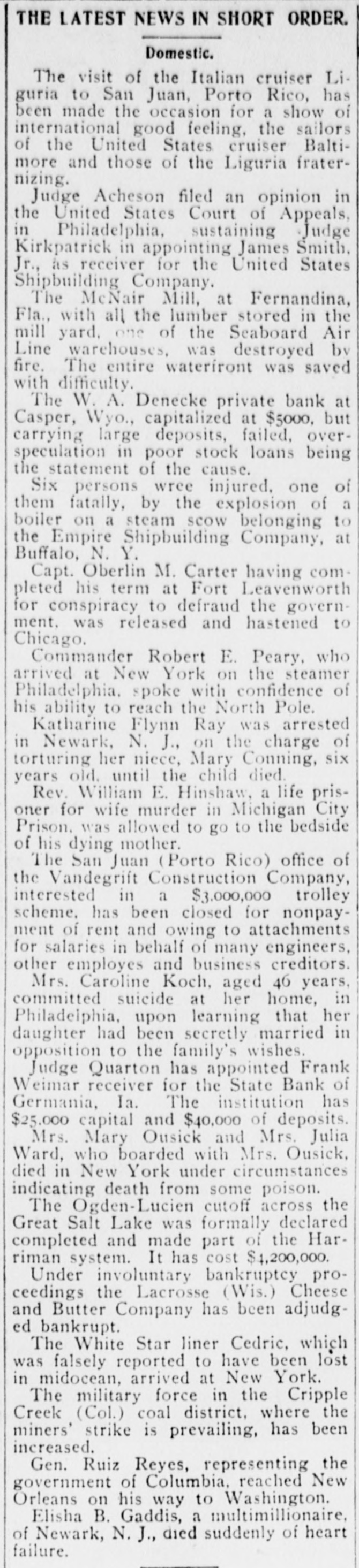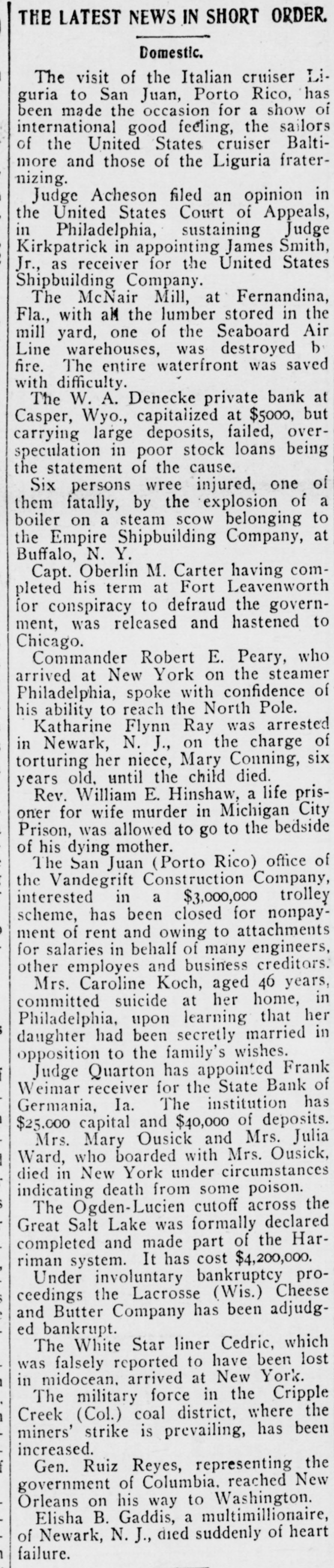 THE LATEST NEWS IN SHORT ORDER. Domestic. The visit of the Italian cruiser Liguria to San Juan, Porto Rico, has been made the occasion for a show of international good feeling, the sailors of the United States cruiser Baltimore and those of the Liguria fraternizing. Judge Acheson filed an opinion in the United States Court of Appeals, in Philadelphia, sustaining Judge Kirkpatrick in appointing James Smith, Jr., as receiver for the United States Shipbuilding Company. The McNair Mill, at Fernandina, Fla., with aM the lumber stored in the mill yard, one of the Seaboard Air Line warehouses, was destroyed b fire. The entire waterfront was saved with difficulty. The W. A. Denecke private bank at Casper, Wyo., capitalized at $5000, but carrying large deposits, failed, overspeculation in poor stock loans being the statement of the cause. Six persons wree injured, one of them fatally, by the explosion of a boiler on a steam SCOW belonging to the Empire Shipbuilding Company, at Buffalo, N. Y. Capt. Oberlin M. Carter having completed his term at Fort Leavenworth for conspiracy to defraud the government, was released and hastened to Chicago. Commander Robert E. Peary, who arrived at New York on the steamer Philadelphia, spoke with confidence of his ability to reach the North Pole. Katharine Flynn Ray was arrested in Newark, N. J., on the charge of torturing her niece, Mary Conning, six years old, until the child died. Rev. William E. Hinshaw, a life prisoner for wife murder in Michigan City Prison, was allowed to go to the bedside of his dying mother. The San Juan (Porto Rico) office of the Vandegrift Construction Company, interested in a $3,000,000 trolley scheme, has been closed for nonpayment of rent and owing to attachments for salaries in behalf of many engineers, other employes and business creditors. Mrs. Caroline Koch, aged 46 years, committed suicide at her home, in Philadelphia, upon learning that her daughter had been secretly married in opposition to the family's wishes. Judge Quarton has appointed Frank Weimar receiver for the State Bank of Germania, Ia. The institution has $25,000 capital and $40,000 of deposits. Mrs. Mary Ousick and Mrs. Julia Ward, who boarded with Mrs. Ousick, died in New York under circumstances indicating death from some poison. The Ogden-Lucien cutoff across the Great Salt Lake was formally declared completed and made part of the Harriman system. It has cost $4,200,000. Under involuntary bankruptcy proceedings the Lacrosse (Wis.) Cheese and Butter Company has been adjudged bankrupt. The White Star liner Cedric, which was falsely reported to have been lost in midocean. arrived at New York. The military force in the Cripple Creek (Col.) coal district, where the miners' strike is prevailing, has been increased. Gen. Ruiz Reyes, representing the government of Columbia. reached New Orleans on his way to Washington. Elisha B. Gaddis, a multimillionaire, of Newark, N. J., died suddenly of heart failure.